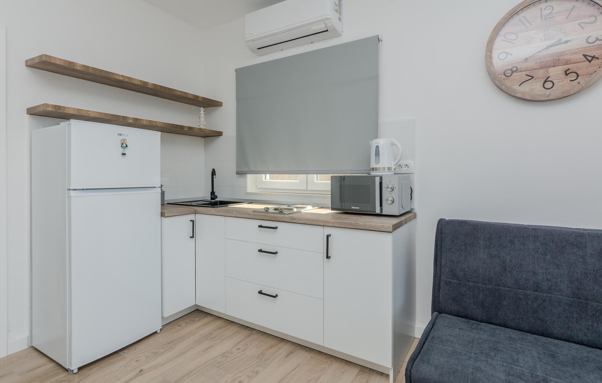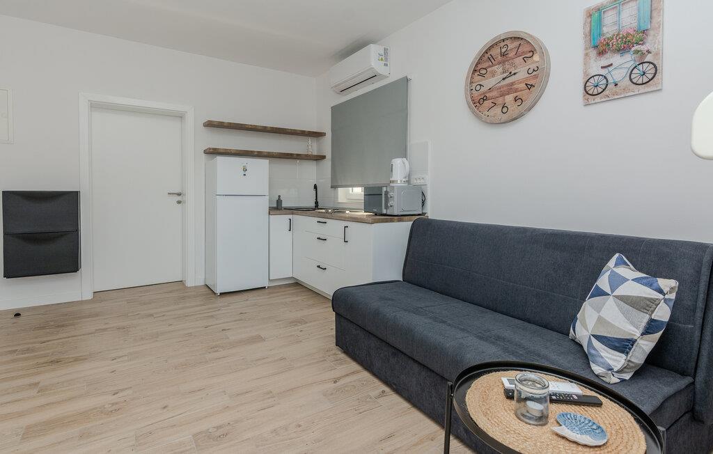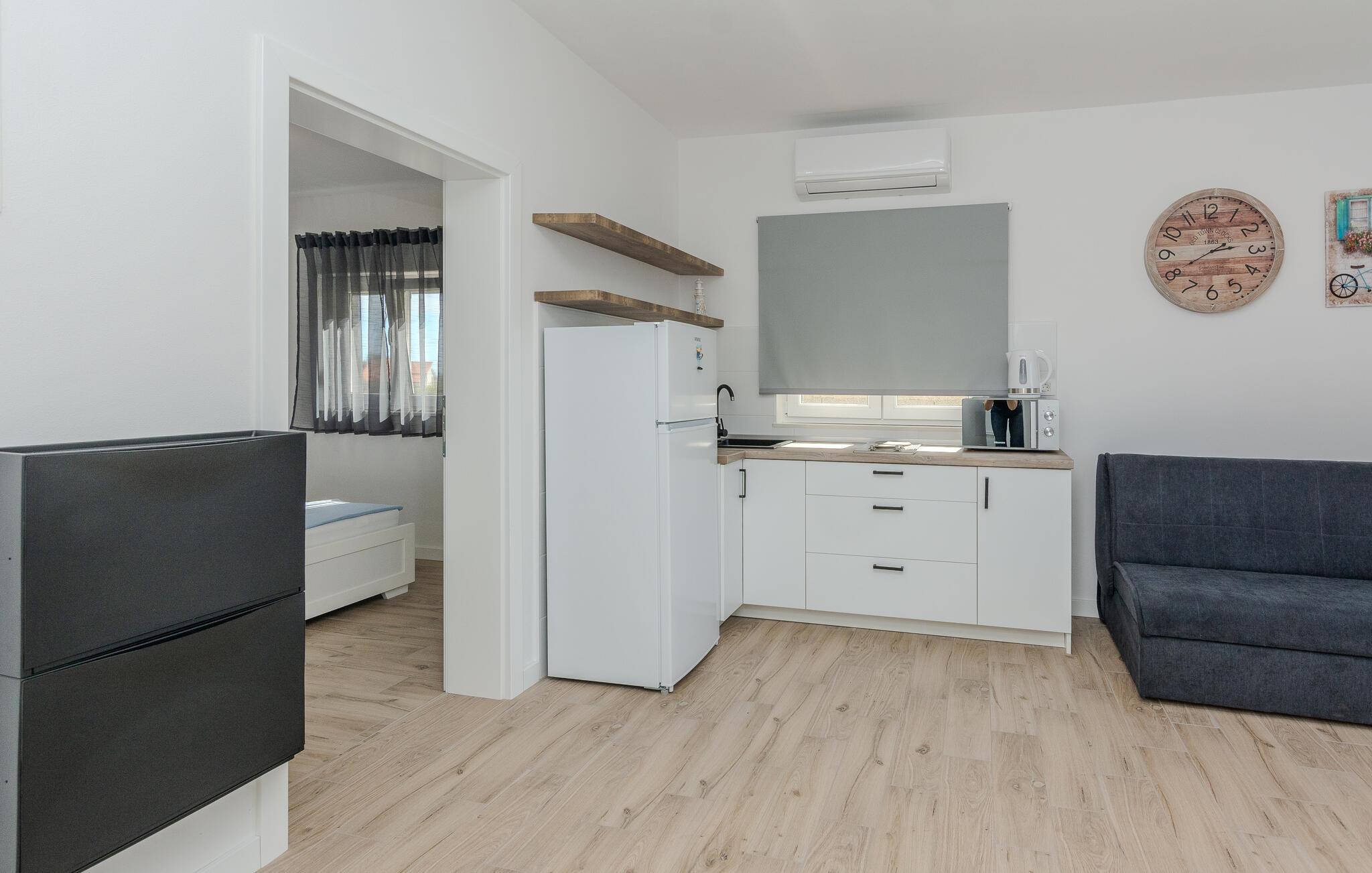 Denne lyse og diskret møblerede ferielejlighed ligger kun en kort gåtur fra en smuk stenstrand og lægger op til at tilbringe afslappende dage i middelhavsklimaet på den charmerende ø Vir. Det praktiske køkken giver jer mulighed for at forvandle friske råvarer fra markedet til lækre måltider. Tag plads ved spisebordet og brug det til hyggelige spilleaftener, eller Slå jer ned godt til rette i den rummelige sofagruppe og stream en spændende film.