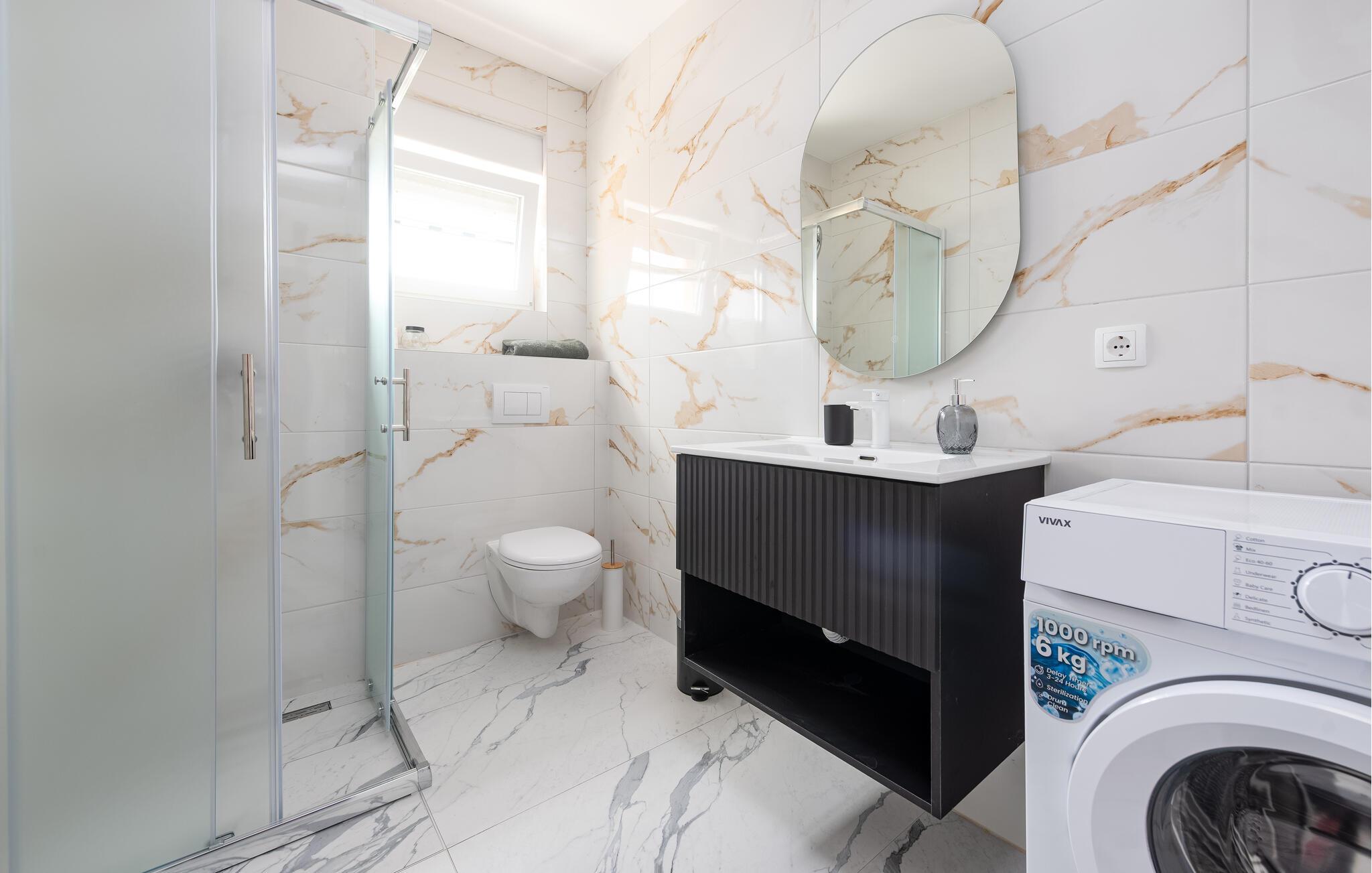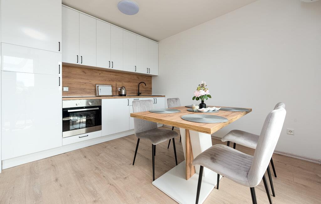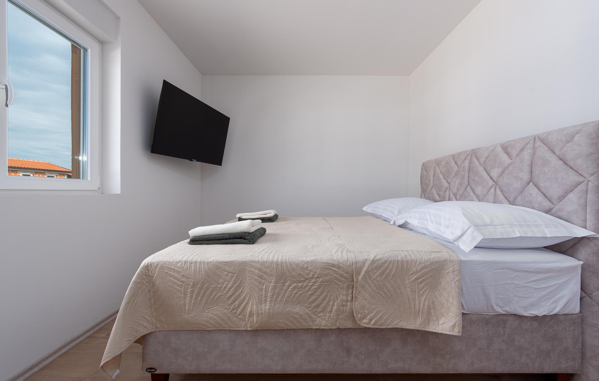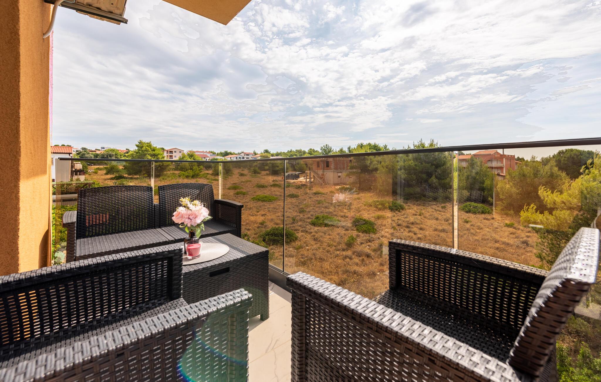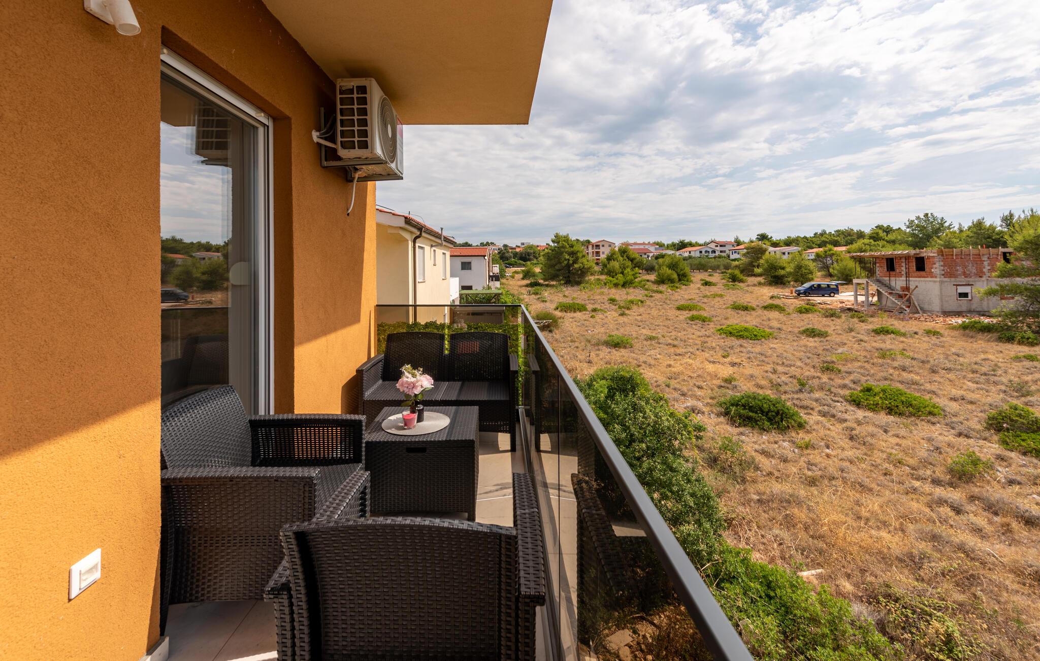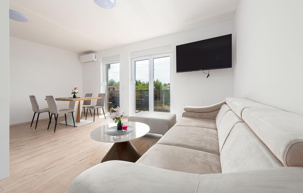 Forkæl jer selv med en behagelig pause i denne moderne ferielejlighed og slap af fra hverdagens stress. Denne lyse og smagfuldt møblerede lejlighed ligger i gåafstand fra stranden og inviterer jer til at tilbringe afslappende dage med familien. Fremstil jeres yndlingsretter i det åbne køkken, planlæg jeres aktiviteter ved det indbydende spisebord, og stream en spændende film efter en lang dag, mens I slapper af på sofaen. På jeres charmerende terrasse kan I nyde den milde morgensol med en friskbrygget kaffe, inden I tager til stranden eller på attraktive udflugter. Om aftenen inviterer de komfortable siddepladser jer til at slappe af med et glas vin. Oplev øens skjulte bugter og strande, udforsk de maleriske gamle byer i Zadar eller Nin, og prøv lokale specialiteter på traditionelle restauranter. Cykl langs kysten eller gennem middelhavslandskaberne, vandr gennem Velebit Naturpark og besøg historiske steder som Sankt Nikolaus Kirke på Vir eller de romerske ruiner i Zadar.
