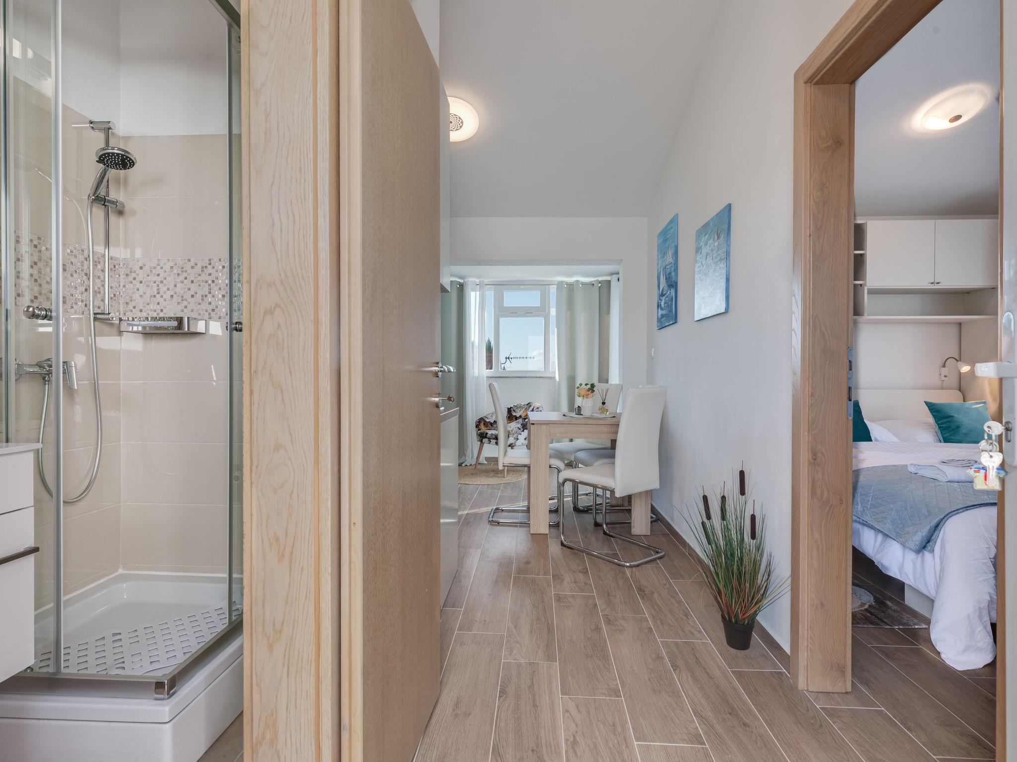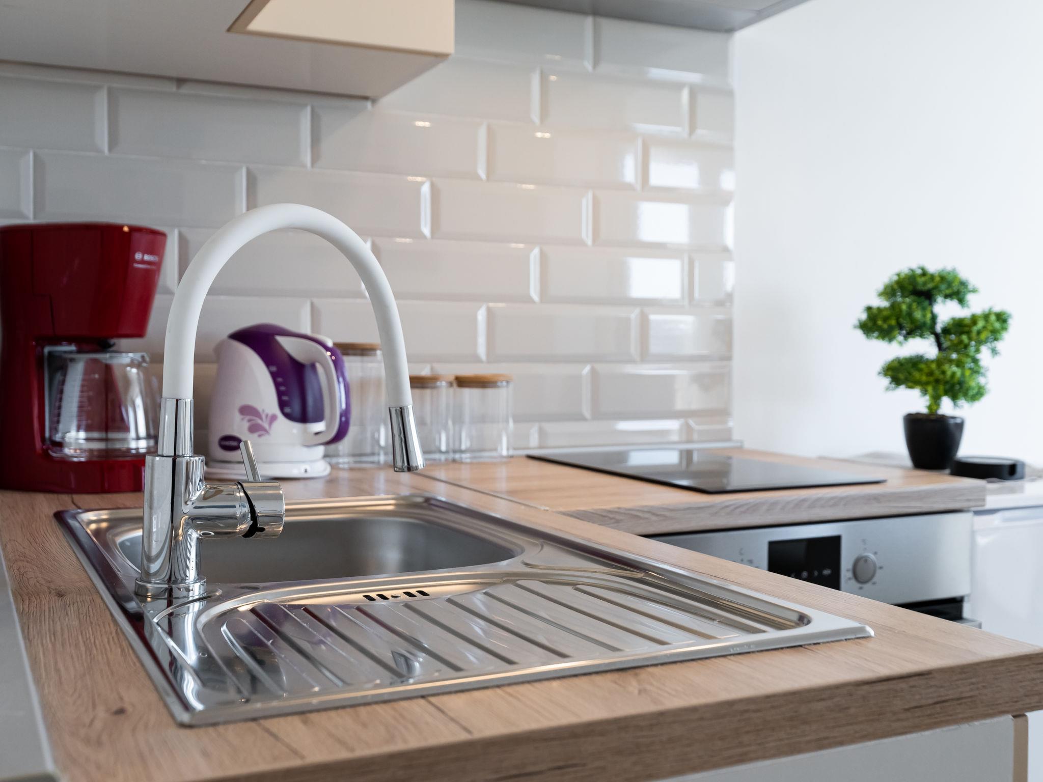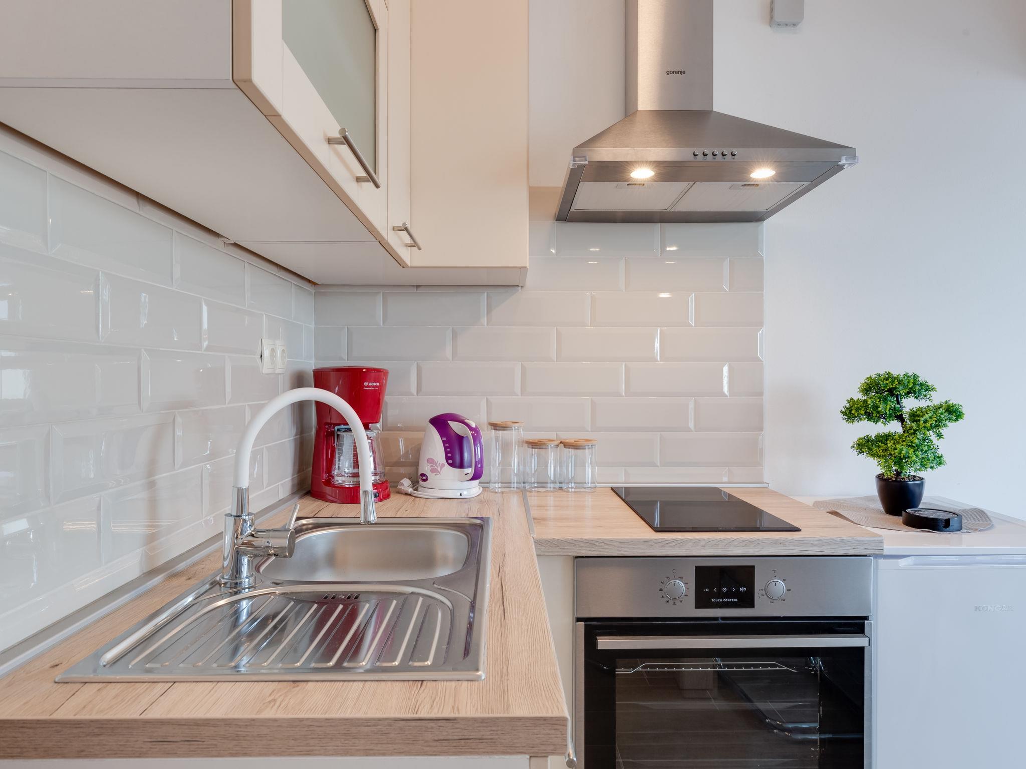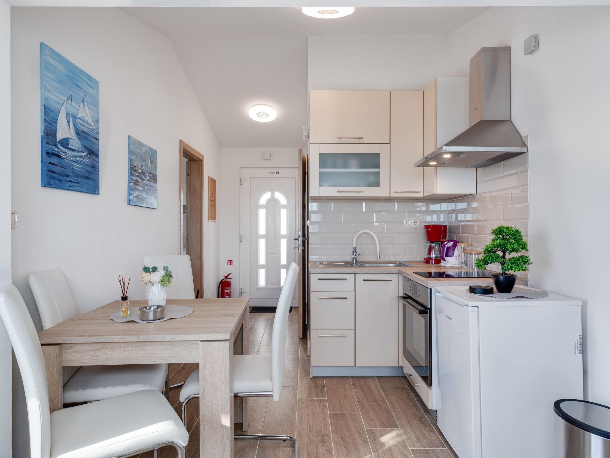 1-room apartment 35 m2 on 1st floor. 1 room with 1 sofabed (145 cm, length 200 cm), 1 double bed (2 x 80 cm, length 200 cm). Kitchen (oven, 2 ceramic glass hob hotplates, toaster, kettle, electric coffee machine) with dining table, satellite TV (flat screen), air conditioning. Exit to the balcony. Shower/WC. No heating option. Balcony 20 m2. Balcony furniture, deck chairs (2). Beautiful view of the sea. Facilities: hair dryer. Internet (WiFi, free).