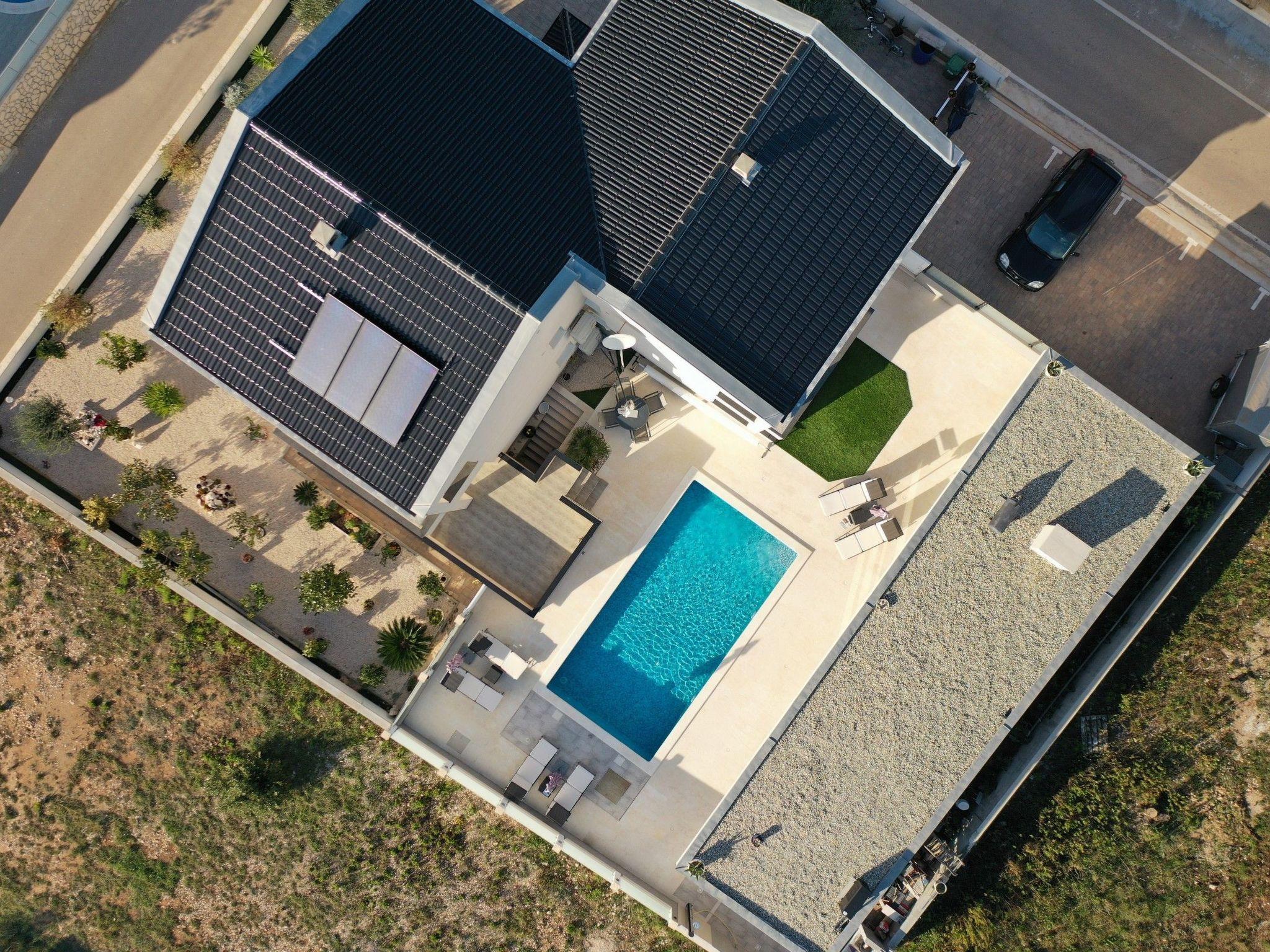 The 59 m² apartment on the first floor of the house is divided into a living and dining area with a fully equipped kitchen, a bedroom with a double bed and a bathroom with a shower. In the living room there is a sofa bed for two more persons. From the living area you can reach onto a furnished balcony with a sea view and a view of the pool (8 m²). Air conditioning, Wi-Fi Internet throughout the apartment and the estate, dishwasher, espresso maker, parking on the property are just some of the amenities of this apartment and included in the price. Children’s cot and highchair are also available upon request and without surcharge. On the enclosed estate (500 m²) there is a 32m² swimming pool (8m long, 4m wide, 1.5m deep) with loungers, parasols, outdoor shower and toilet as well as a spacious and roofed grill pavilion with barbecue and seating furniture. Restaurants and shops can be reached in a few minutes’ walk. The center of the island of Vir is 2000 m distanced.