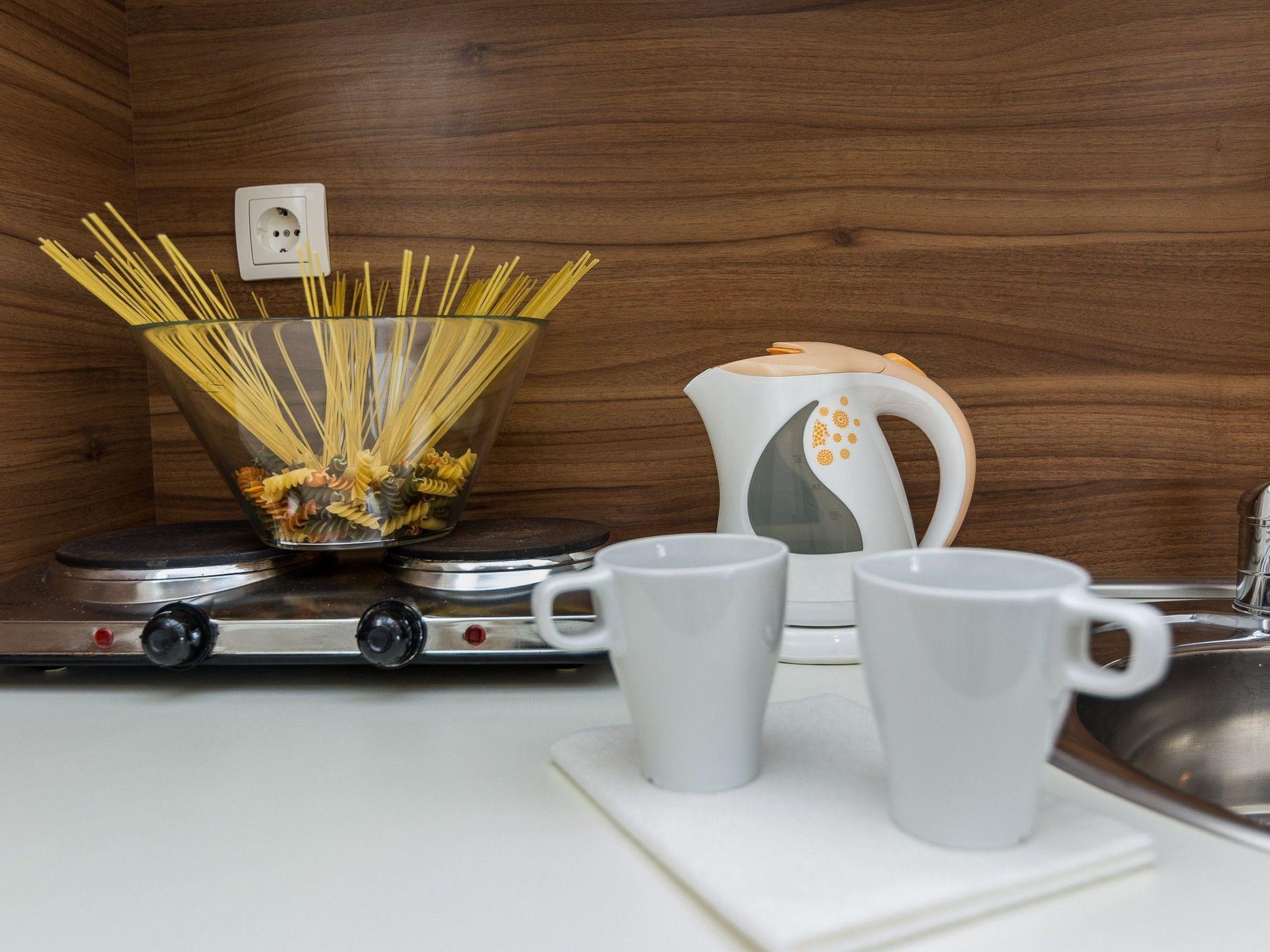 Inside the flat, you will find a pleasant atmosphere that extends across the upper floor. Although the kitchen and bathroom are not the main focus, the holiday flat is equipped with air conditioning for your comfort and offers practical appliances such as a coffee machine and kettle to make your stay even more enjoyable. Internet access via WiFi and satellite TV are also available, so you won't be short of entertainment options.