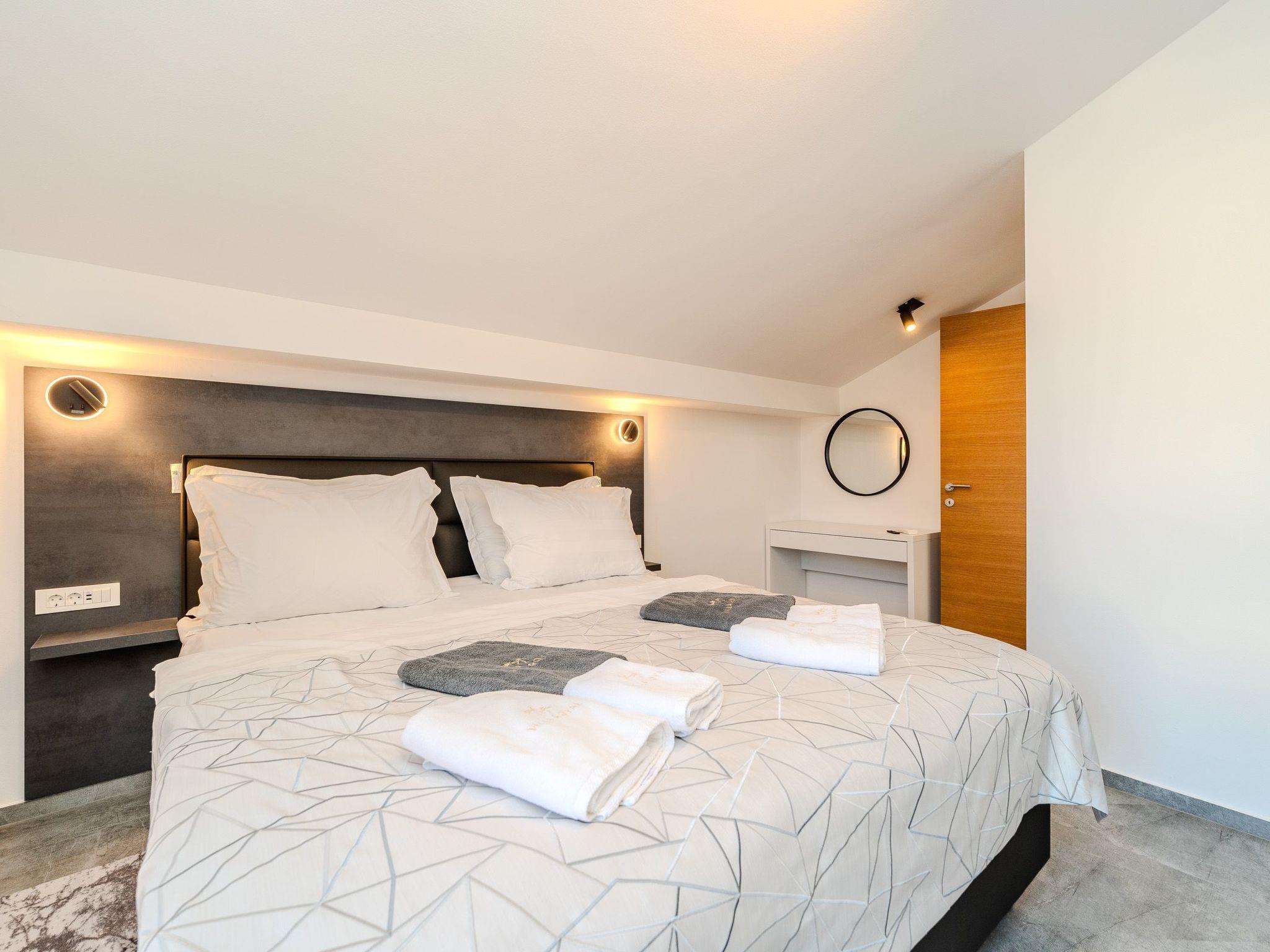 The flat (80 m²) is divided into a living room with fully equipped kitchen and dining area, two air-conditioned bedrooms with double beds equipped with satellite TV, and three bathrooms with shower, two of which belong to the bedrooms. The living room has a sofa bed for two more people. The flat has a 60 m² covered balcony with partial sea view, whirlpool, deckchair, table and chairs. The inner courtyard of the flat (600 m²) has a heated swimming pool and a relaxation area with barbecue, gazebo, sunbeds and parasol.