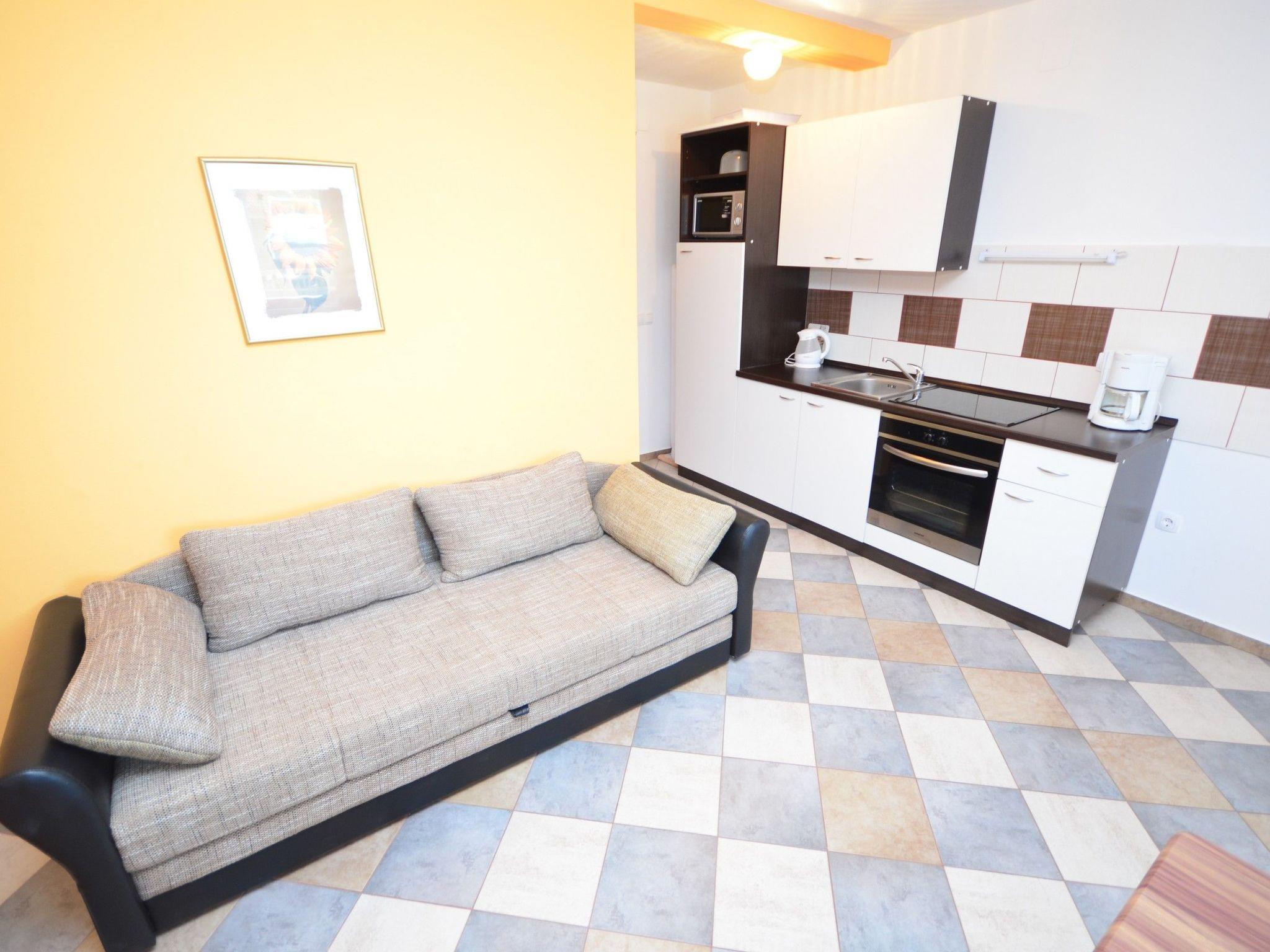 Within this cosy retreat you will find an inviting bedroom with a double bed, complemented by a comfortable sofa bed in the living/dining area for an extra person. Valuable amenities such as satellite TV, internet access and partial air conditioning ensure a relaxing and comfortable stay. The interior is complemented by a well-equipped kitchenette with coffee machine and kettle, which leaves nothing to be desired.