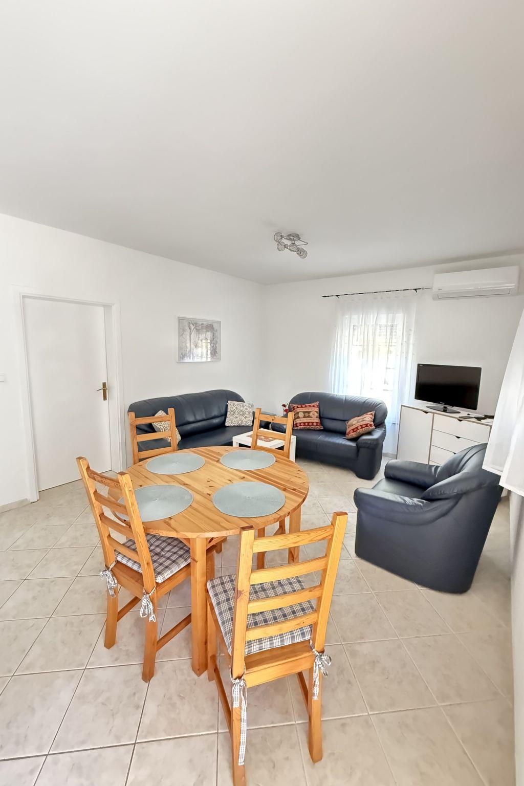 Apartment 1 (ground floor) is suitable for up to 5 people. It consists of two bedrooms – one with a double bed, and the other with a double bed and a single bed. The apartment includes a bathroom with shower and washing machine, as well as a fully equipped kitchen connected to the living room.