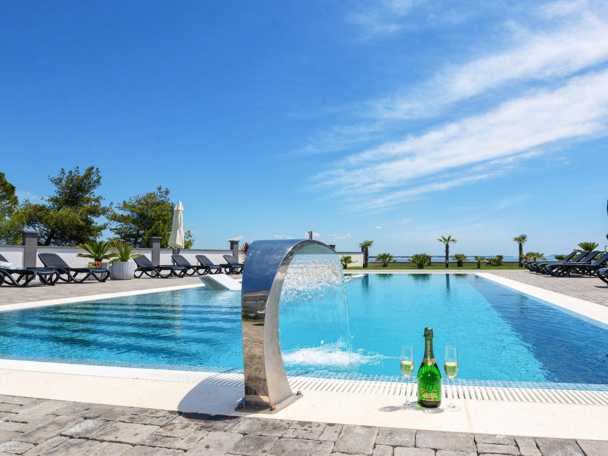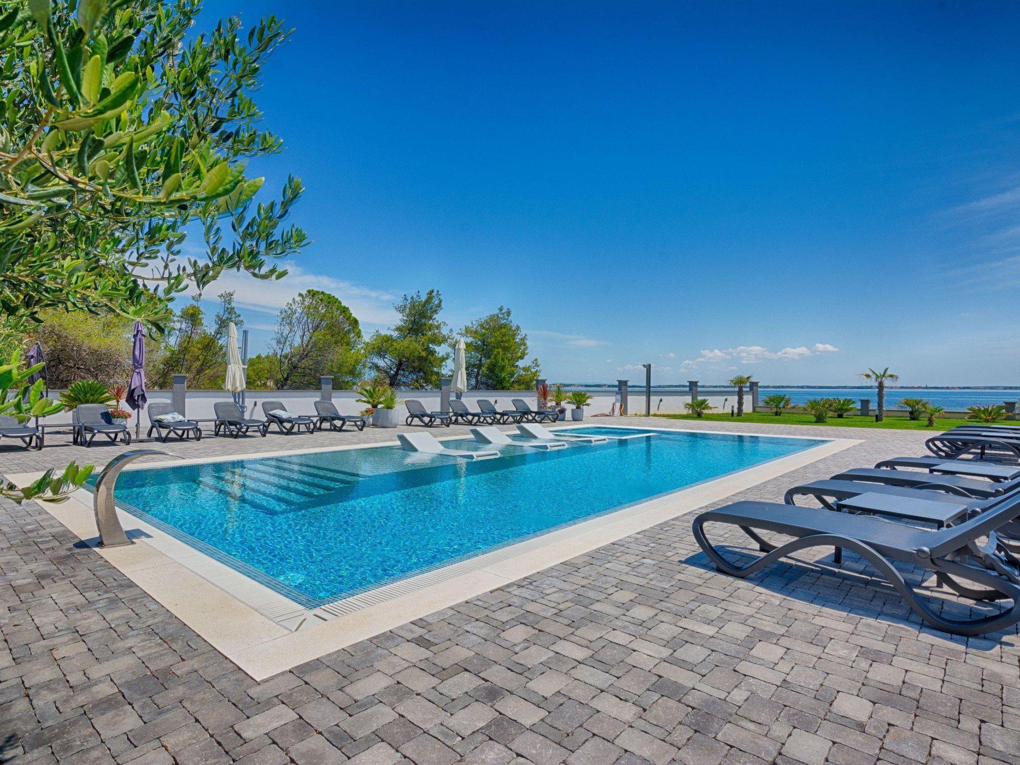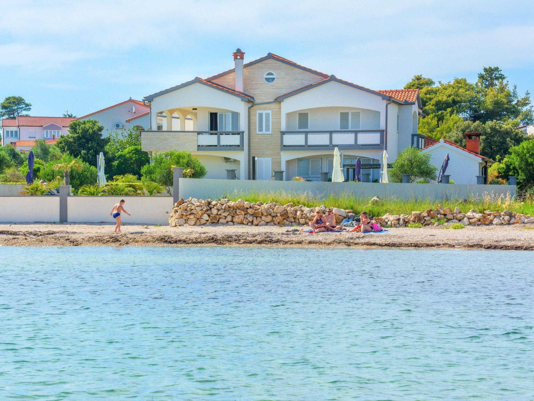 At the property there is a swimming pool of 87m² (13,5m long, 6,5m wide and 1,4m deep) with loungers and a relax area with spacious lounge seating furniture under a parasol. The 45m² apartment is located on the first floor of the house and is divided into a kitchen, dining and living area, a bedroom with double bed and a bathroom with shower cabin. In the living room there is a sofa bed for two more persons. 15m² furnished and roofed balcony with a sea view belongs to the apartment. Air conditioning, satellite TV, Wi-Fi internet and grill pavilion in the courtyard with outdoor kitchen with oven and outdoor dining area are among the other features. Restaurants and shopping opportunities can be found at a distance of a few minutes’ walk. The beach Jadro, the most popular beach on the island of Vir where You can find all kinds of entertainment during Your summer vacation is just 200m distanced.