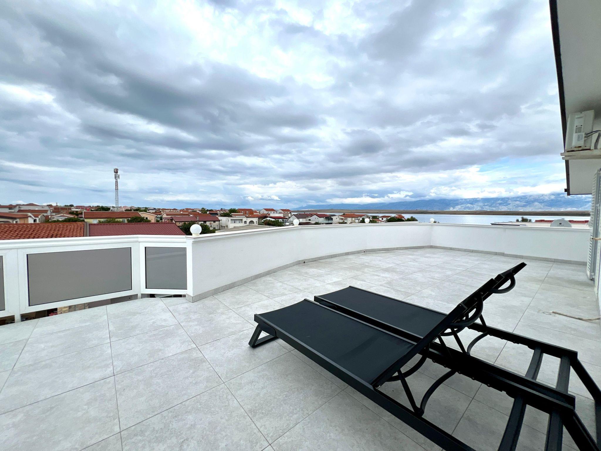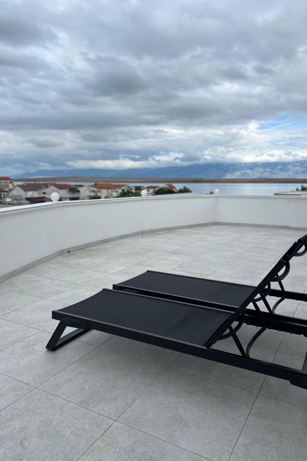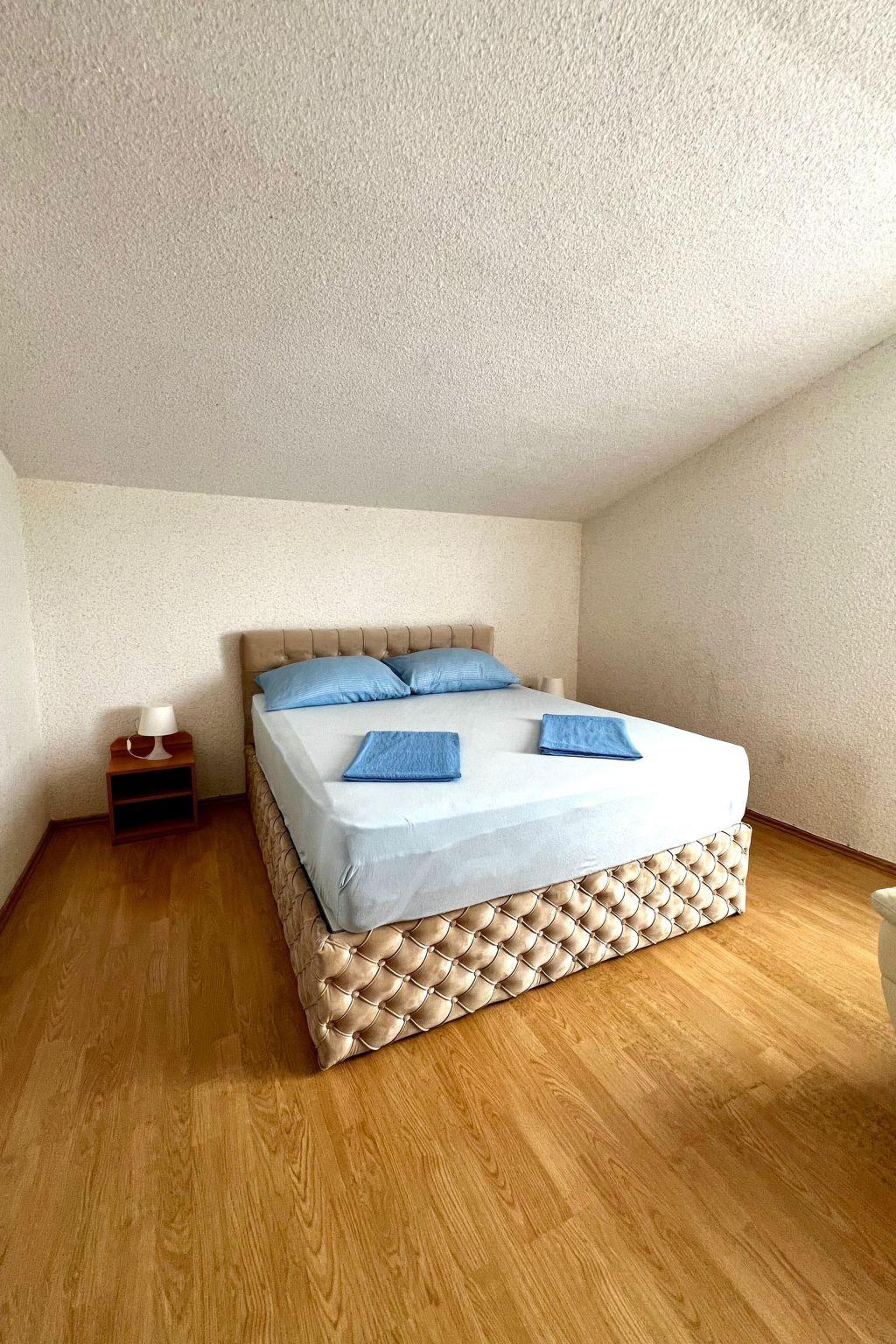 The flat (130 m²) is divided into a living room, a dining room with a fully equipped kitchen, two bedrooms with double beds and a bathroom with a shower. The living room has a sofa bed for two people. The flat has a covered balcony (70 m²) with sea view, sunbeds, table and chairs. In the courtyard of the house (700 m²) there is an outdoor shower and a gazebo with table, chairs and barbecue.