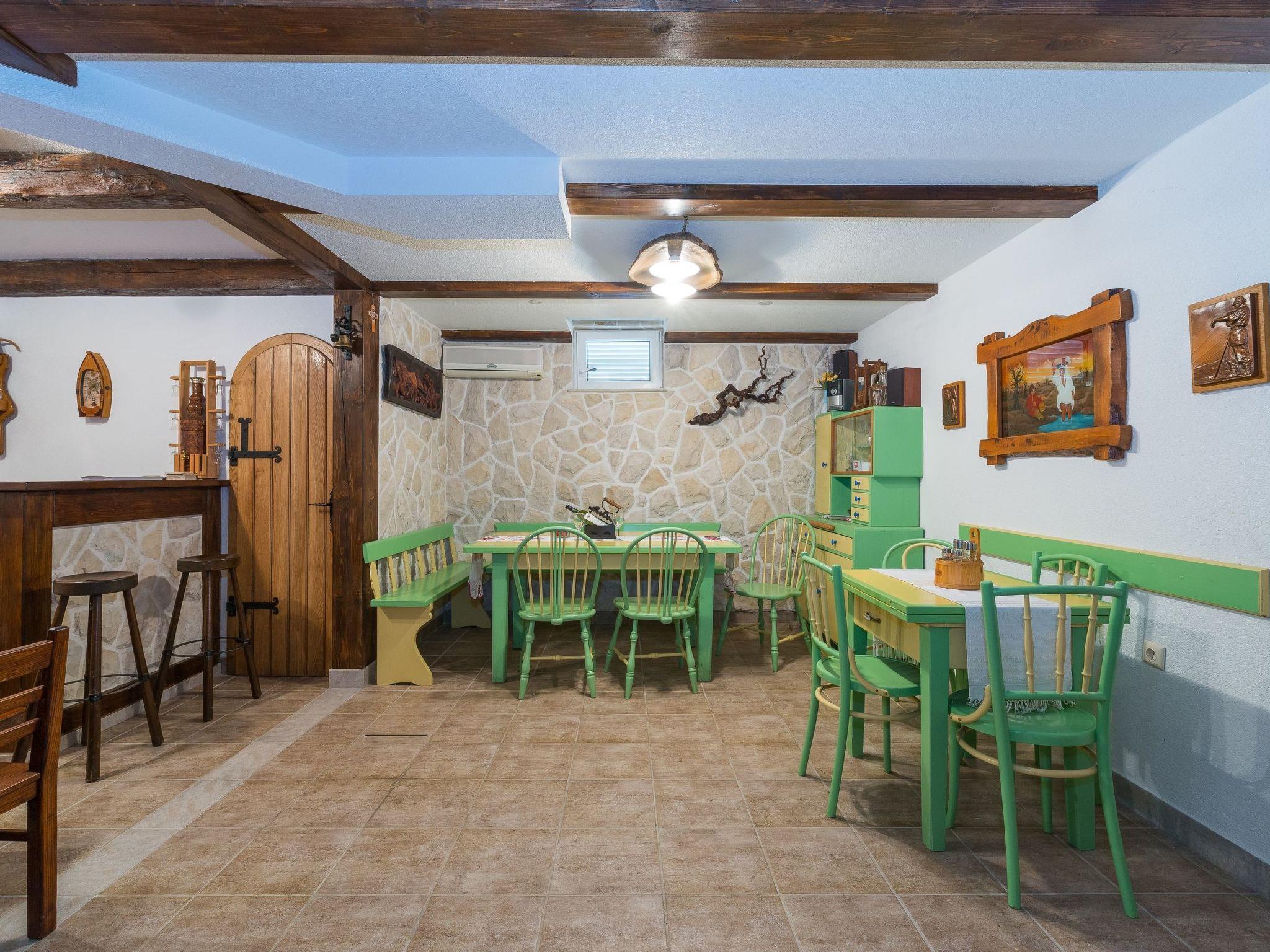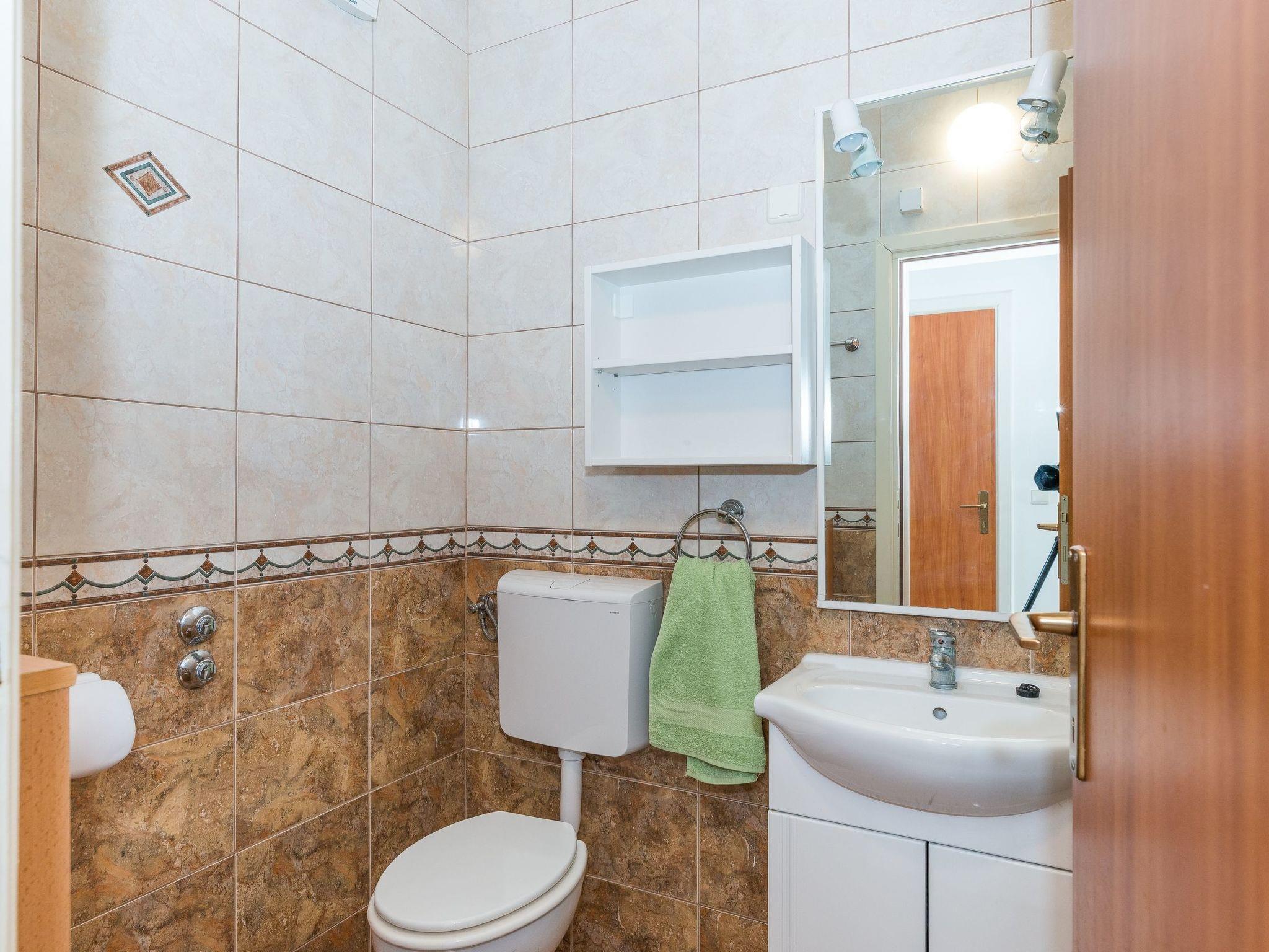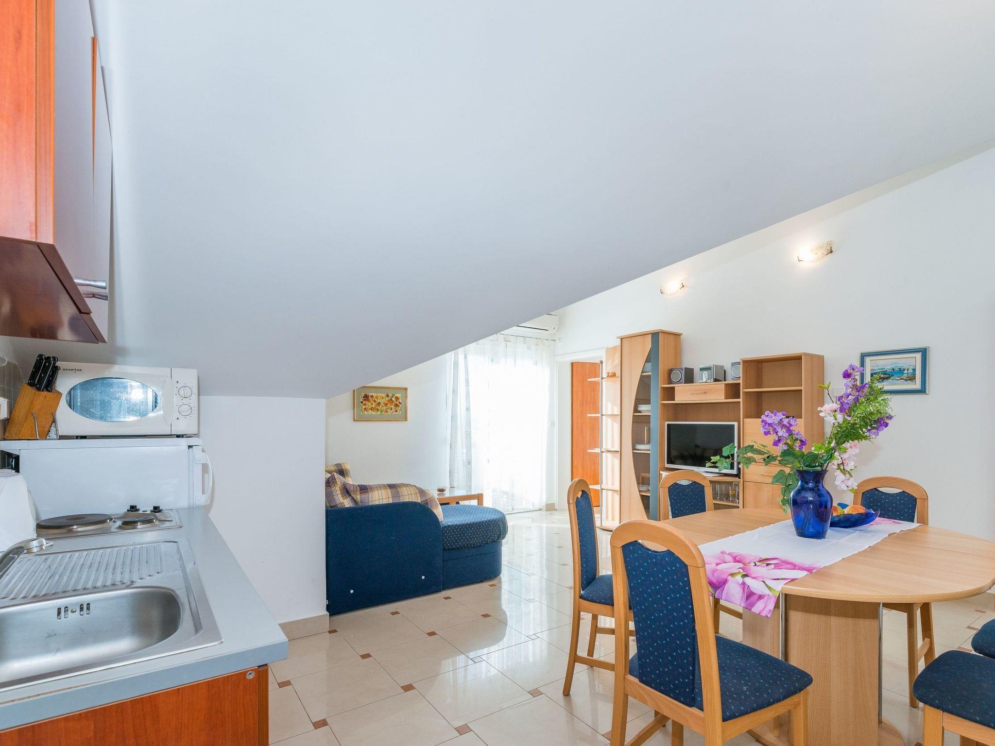 The apartment is divided into a living room with kitchen and dining room, double bedroom with a double bed, two single rooms with single beds and a bathroom with a shower. In the living room there is a sofa bed for two more persons. From the living room you can reach onto a furnished and roofed 8 m² balcony. Other amenities include air conditioning, satellite TV, Wi-Fi Internet. Children's cot upon request. The common lounge area is located in the basement of the house and includes bar, seating furniture, darts, satellite TV, radio, air conditioning and refrigerator with freezer. Behind the house there is a parking space for bicycles. In the spacious courtyard of the house (200 m²) there is a pavilion with barbecue and garden furniture ideal for gatherings in warm summer evenings. The apartment is situated in a distance of 70 m from sea and 150 m from shops and restaurants.
