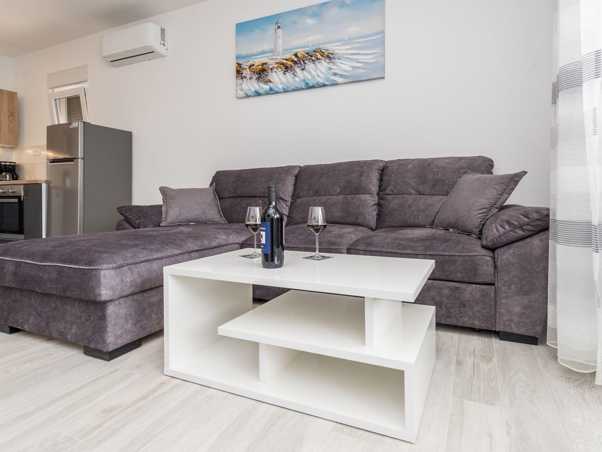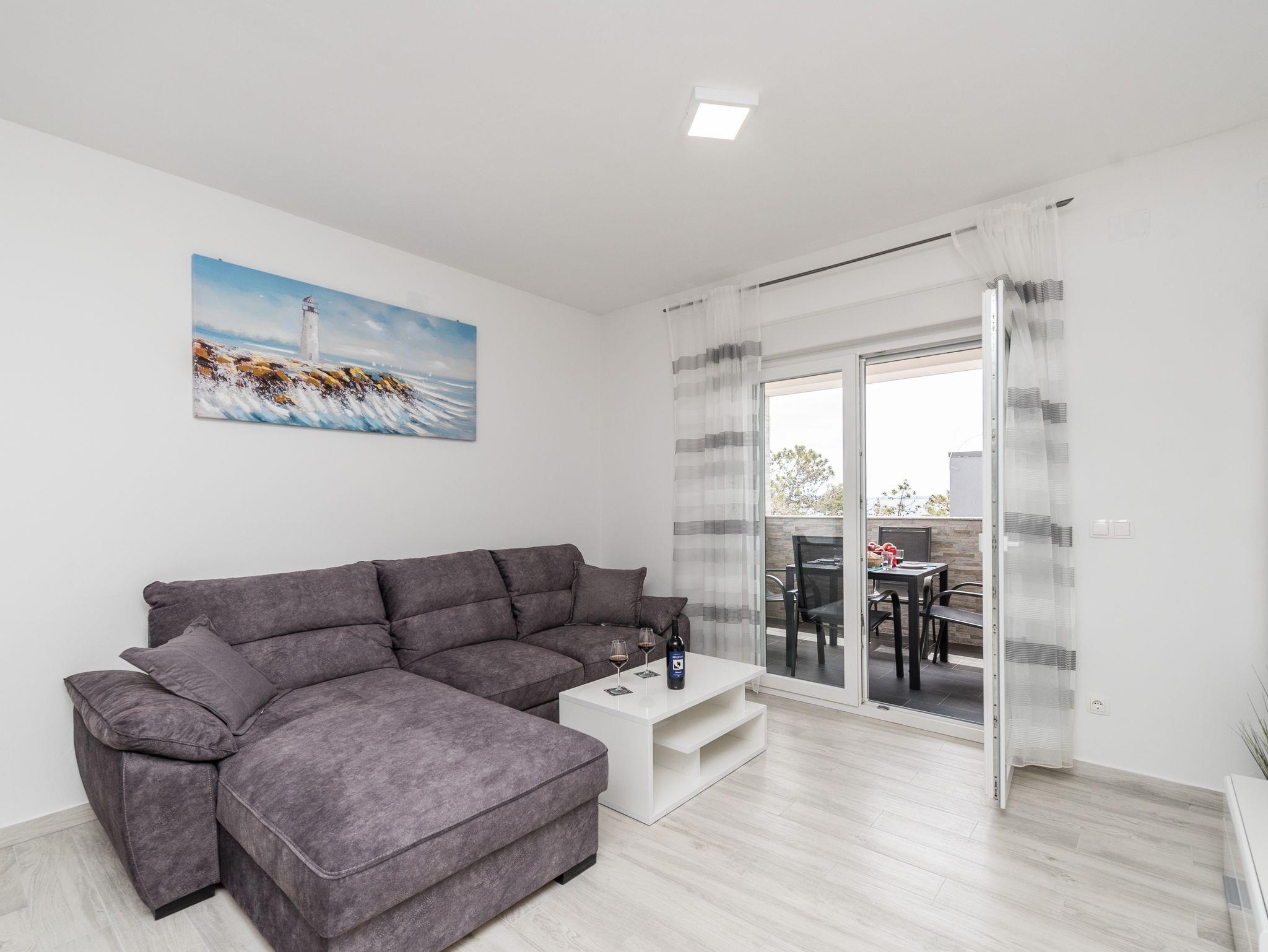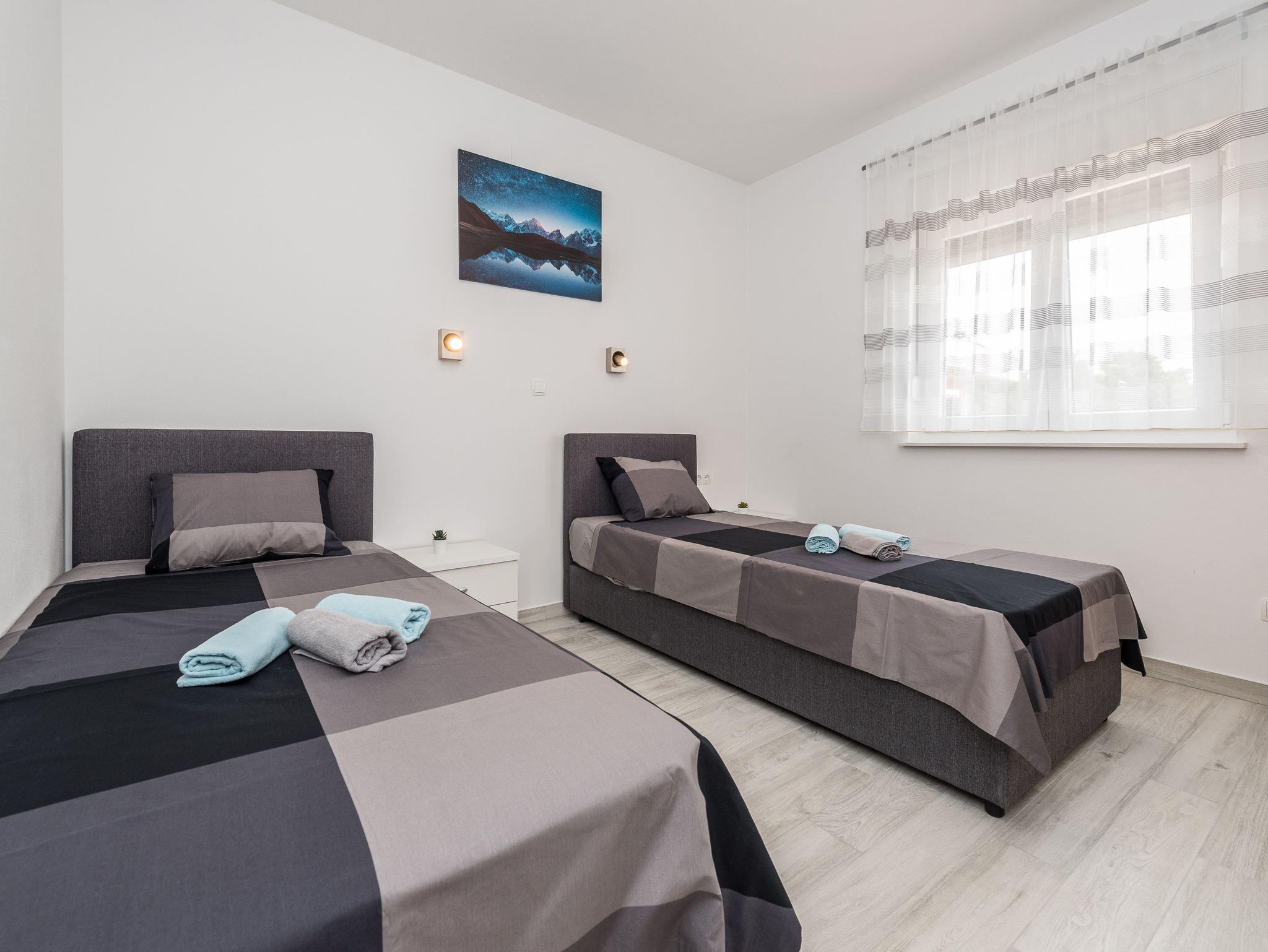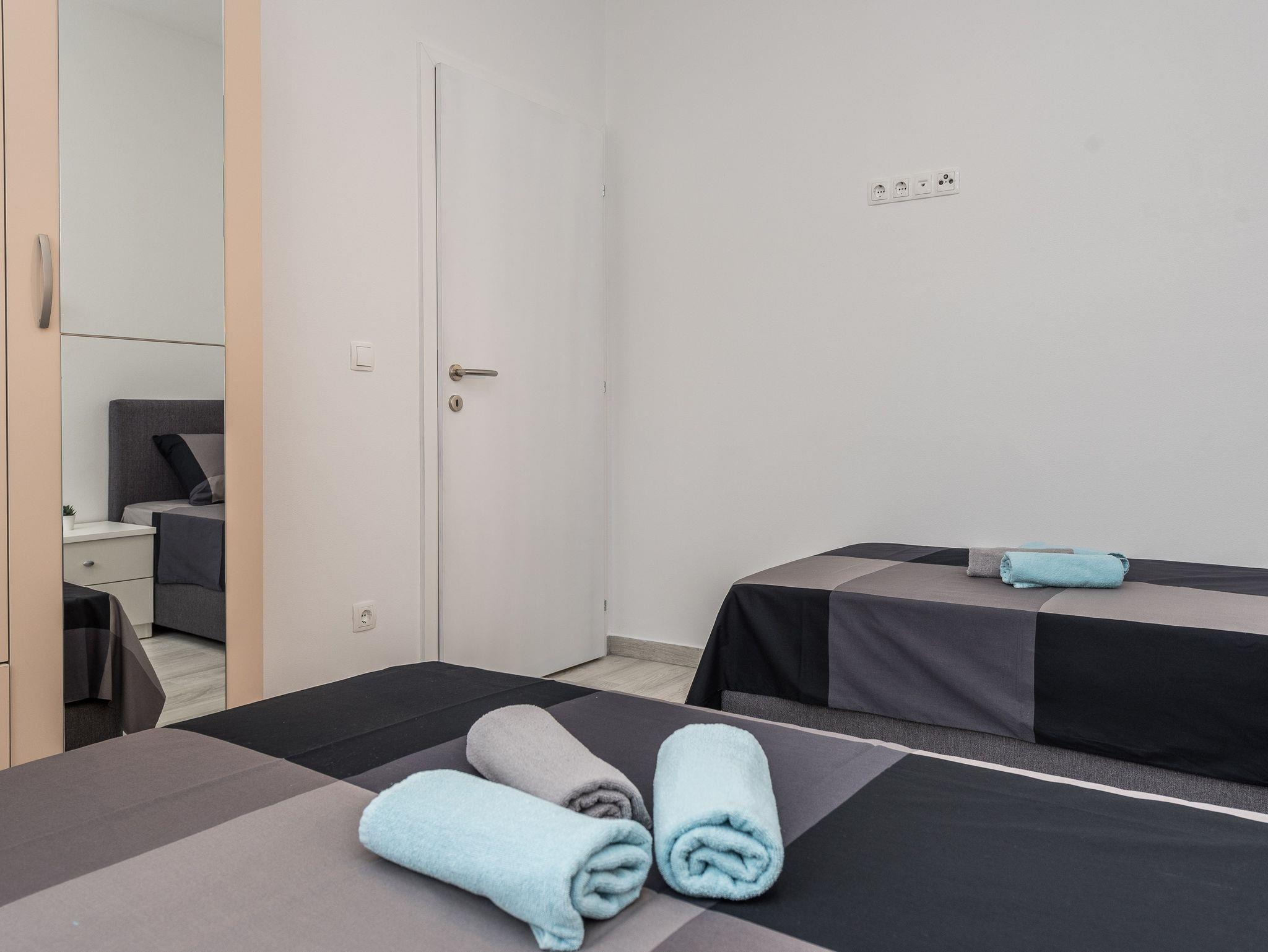 Ferienwohnung bietet Platz für 6 Gäste. Die Betten sind in Schlafzimmern, die es 2 gibt, und in Wohnzimmer, innerhalb einer Gesamtfläche von 59m2, angeordnet. Die Gäste haben eine eigene Terrasse zur Verfügung, auf der sie in warmen Sommernächten genießen können. Es ist erlaubt, Speisen auf dem Gemeinschafts-Grill vorzubereiten. IM PREIS INBEGRIFFEN: Kurtaxe, Endreinigung, Klimatisierung, Parkplatz, Internet, Kinderbett, Bügeleisen, Bügelbrett, Föhn. VERBINDLICHE ZUSÄTZLICHE KOSTEN: Aufzahlung für Kurzaufenthalte (prozentualer Zuschlag pro Nächtigungsanzahl: 30% - 1, 20% - 2, 10% - 3). Die Verfügbarkeit zusätzlicher Dienstleistungen in Ihrem reservierten Termin und die Preise derselben (falls nicht aufgeführt) müssen im Voraus überprüft werden. Zusätzliche Dienstleistungen die in der Zahlungsaufforderung nicht aufgeführt sind werden direkt beim Vermieter bezahlt, angenommen der Gast nutzt auch diese.