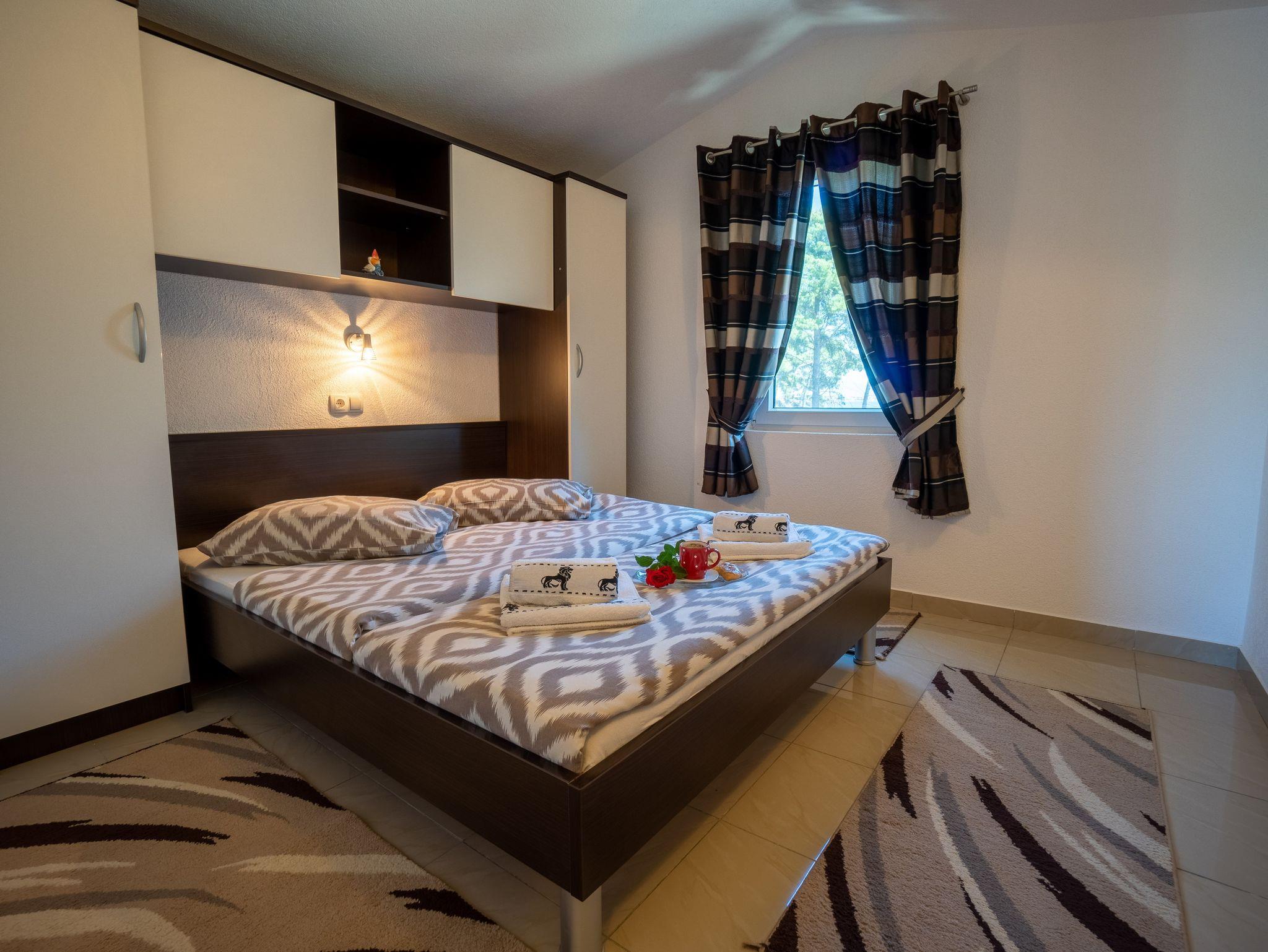 Ferienwohnung bietet Platz für 6 Gäste. Die Betten sind in Schlafzimmern, die es 2 gibt, und in Wohnzimmer, innerhalb einer Gesamtfläche von 69m2, angeordnet. Die Gäste haben eine eigene Terrasse zur Verfügung, auf der sie in warmen Sommernächten genießen können. Das Apartment bietet Meerblick. Es ist erlaubt, Speisen auf dem Gemeinschafts-Grill vorzubereiten. IM PREIS INBEGRIFFEN: Kurtaxe, Endreinigung, Klimatisierung, Parkplatz, Internet, Kinderbett, Föhn, Sonnenschirm, Liegestühle. VERBINDLICHE ZUSÄTZLICHE KOSTEN: Aufzahlung für Kurzaufenthalte (prozentualer Zuschlag pro Nächtigungsanzahl: 30% - 1, 20% - 2, 10% - 3). Die Verfügbarkeit zusätzlicher Dienstleistungen in Ihrem reservierten Termin und die Preise derselben (falls nicht aufgeführt) müssen im Voraus überprüft werden. Zusätzliche Dienstleistungen die in der Zahlungsaufforderung nicht aufgeführt sind werden direkt beim Vermieter bezahlt, angenommen der Gast nutzt auch diese.