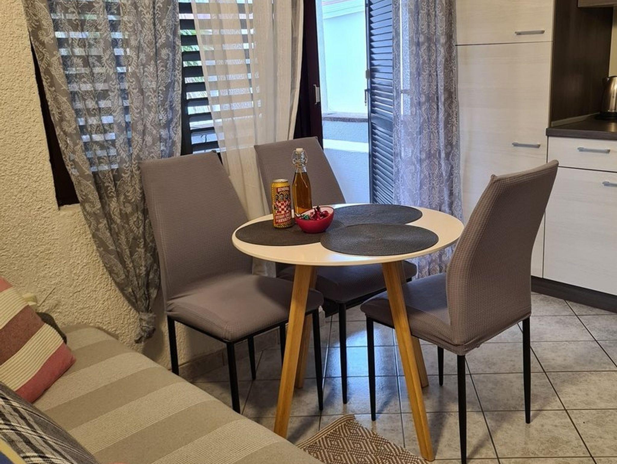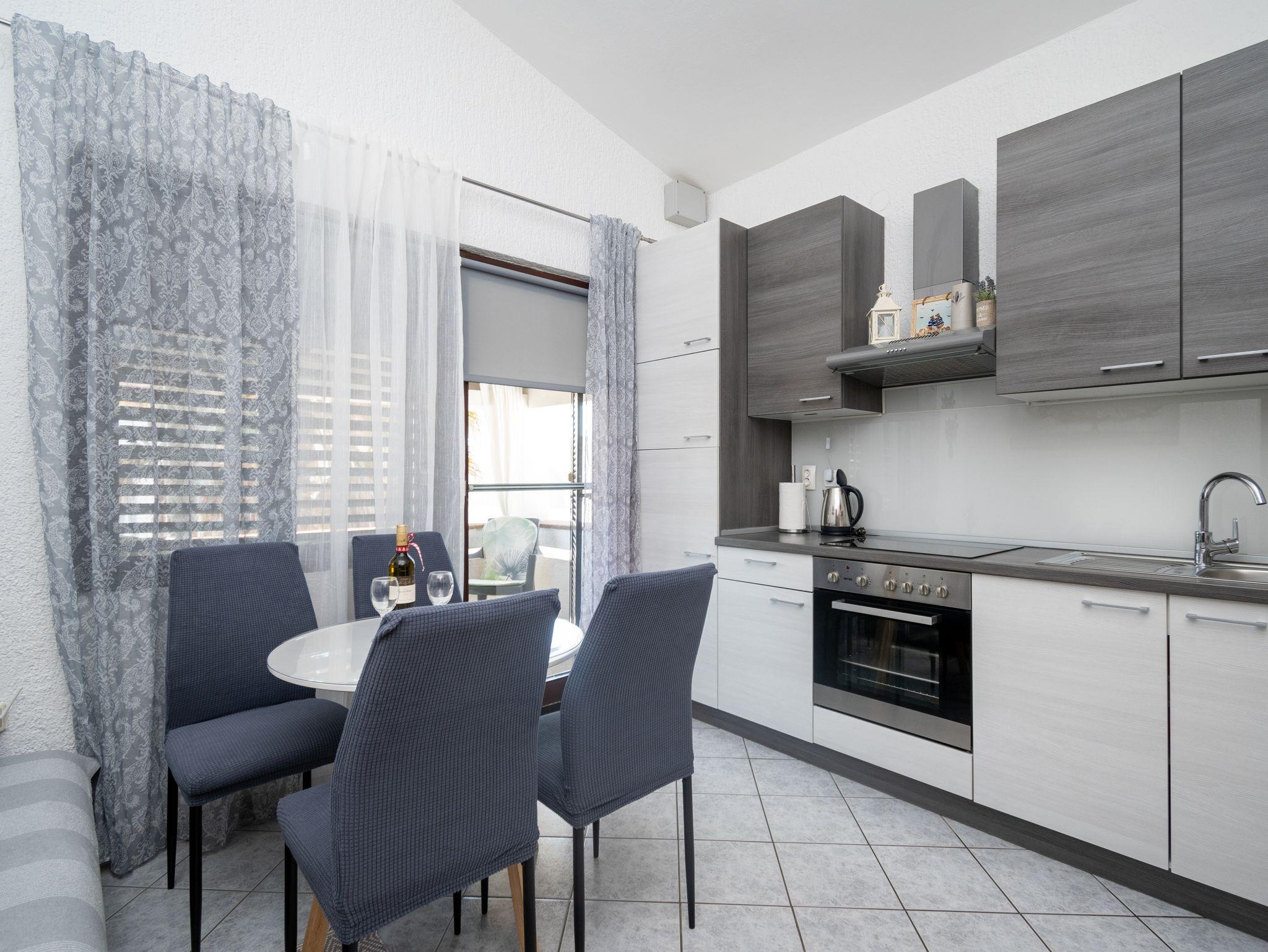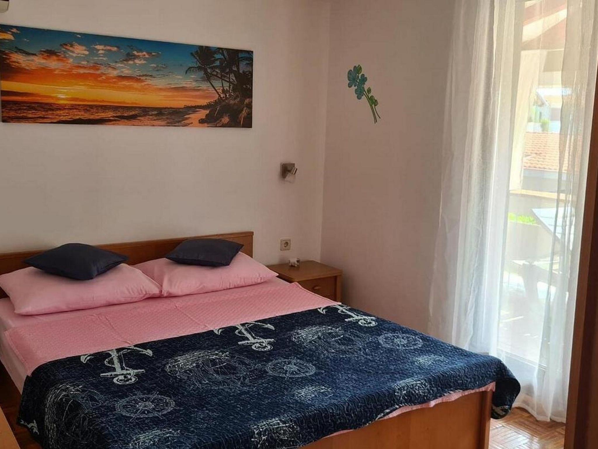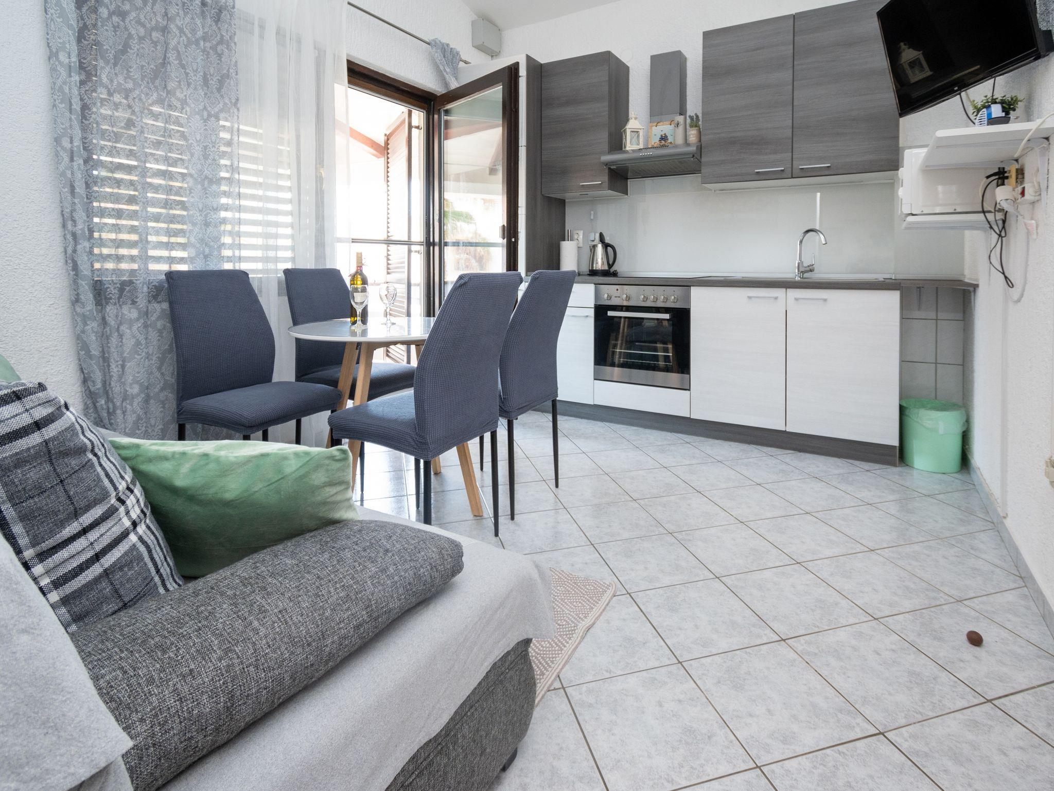 Ferienwohnung bietet Platz für 4 Gäste. Die Betten sind in Schlafzimmern, die es 1 gibt, und in Esszimmer, innerhalb einer Gesamtfläche von 24m2, angeordnet. Die Gäste haben eine eigene Terrasse zur Verfügung, auf der sie in warmen Sommernächten genießen können. Das Apartment bietet Meerblick. Es ist erlaubt, Speisen auf dem Gemeinschafts-Grill vorzubereiten. In der Unterkunftseinheit besteht die Möglichkeit des Mitbringens von Haustieren gegen Aufpreis. IM PREIS INBEGRIFFEN: Kurtaxe, Endreinigung, Klimatisierung, Parkplatz, Internet, Bootsanlegeplatz, Bügeleisen, Bügelbrett, Föhn. VERBINDLICHE ZUSÄTZLICHE KOSTEN: Aufzahlung für Kurzaufenthalte (prozentualer Zuschlag pro Nächtigungsanzahl: 30% - 1, 20% - 2, 10% - 3). UNVERBINDLICHE ZUSÄTZLICHE KOSTEN: Wäschewaschen (5,00 € Waschen), Haustiere (5,00 € pro Nacht). Die Verfügbarkeit zusätzlicher Dienstleistungen in Ihrem reservierten Termin und die Preise derselben (falls nicht aufgeführt) müssen im Voraus überprüft werden. Zusätzliche Dienstleistungen die in der Zahlungsaufforderung nicht aufgeführt sind werden direkt beim Vermieter bezahlt, angenommen der Gast nutzt auch diese.