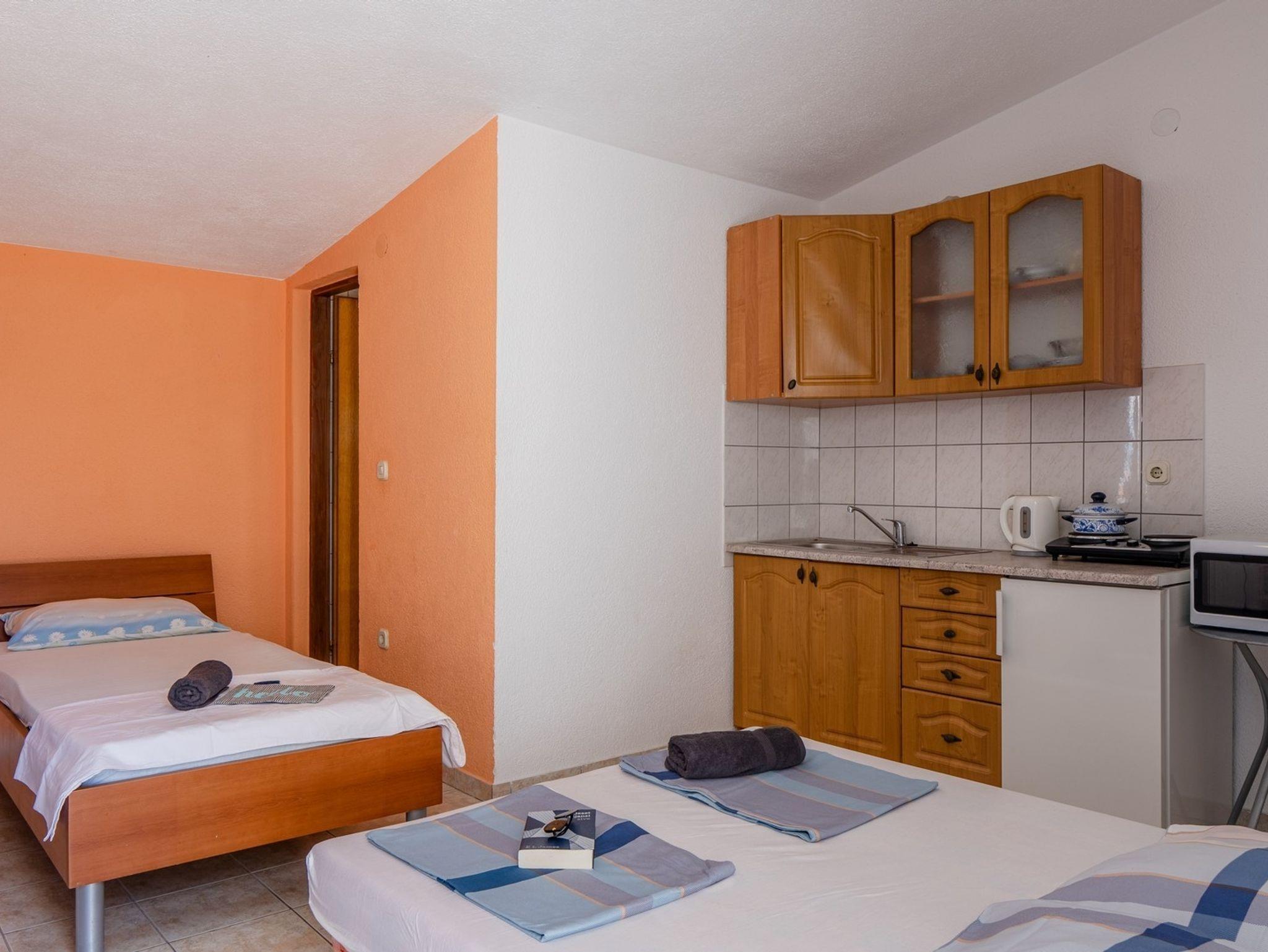 Studio bietet Platz für 2 Gäste. Die Betten sind in Wohnzimmer, innerhalb einer Gesamtfläche von 15m2, angeordnet. Die Gäste haben eine eigene Terrasse zur Verfügung, auf der sie in warmen Sommernächten genießen können. Das Studio-Apartment bietet Meerblick. Es ist erlaubt, Speisen auf dem Gemeinschafts-Grill vorzubereiten. IM PREIS INBEGRIFFEN: Kurtaxe, Endreinigung, Klimatisierung, Parkplatz, Internet, Föhn. Die Verfügbarkeit zusätzlicher Dienstleistungen in Ihrem reservierten Termin und die Preise derselben (falls nicht aufgeführt) müssen im Voraus überprüft werden. Zusätzliche Dienstleistungen die in der Zahlungsaufforderung nicht aufgeführt sind werden direkt beim Vermieter bezahlt, angenommen der Gast nutzt auch diese.