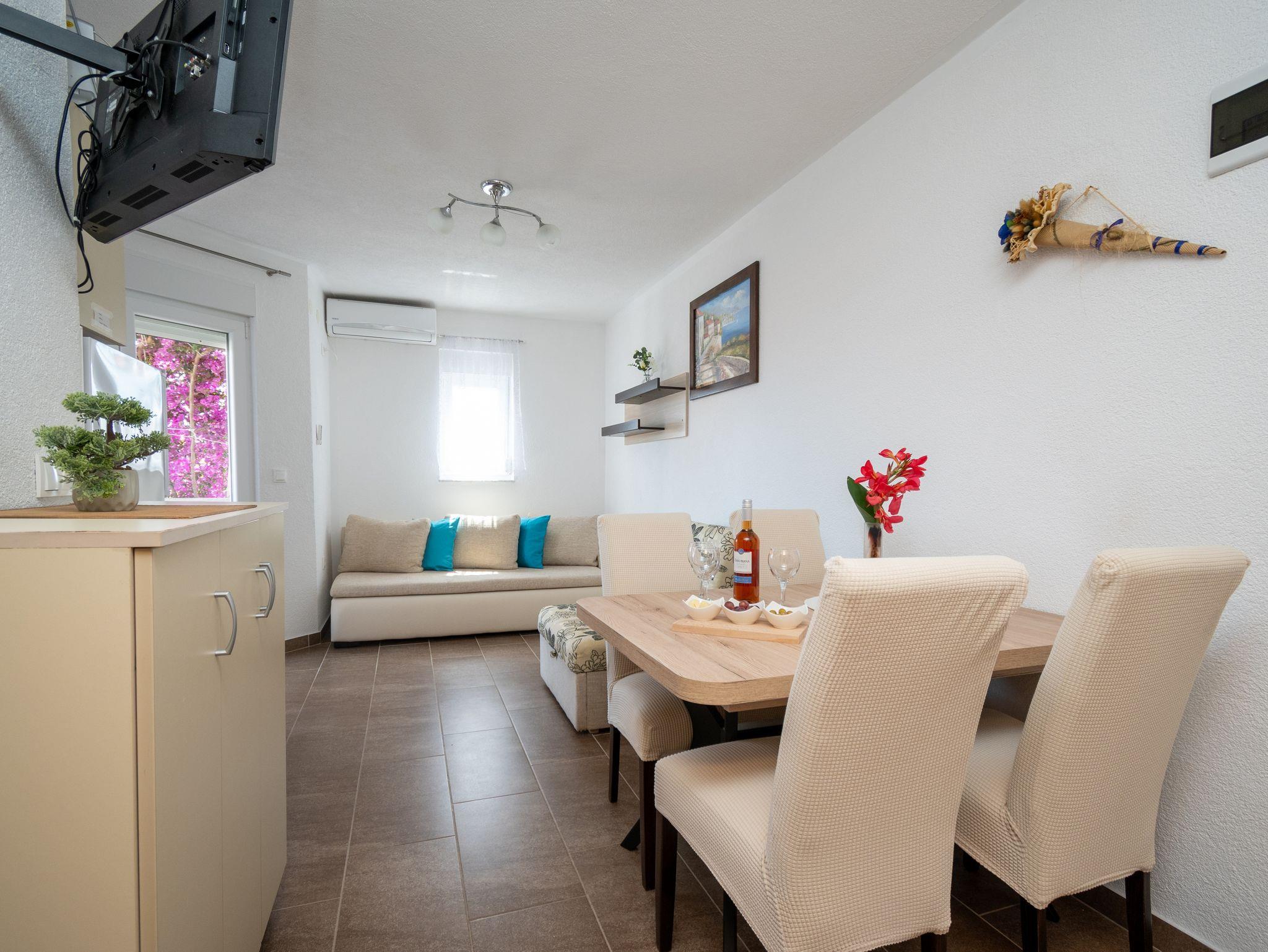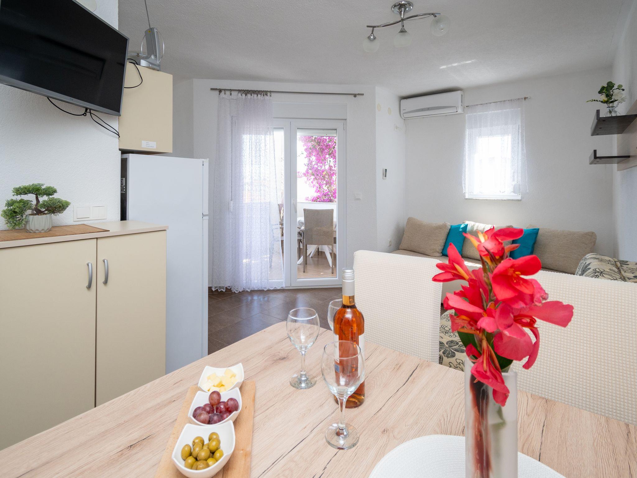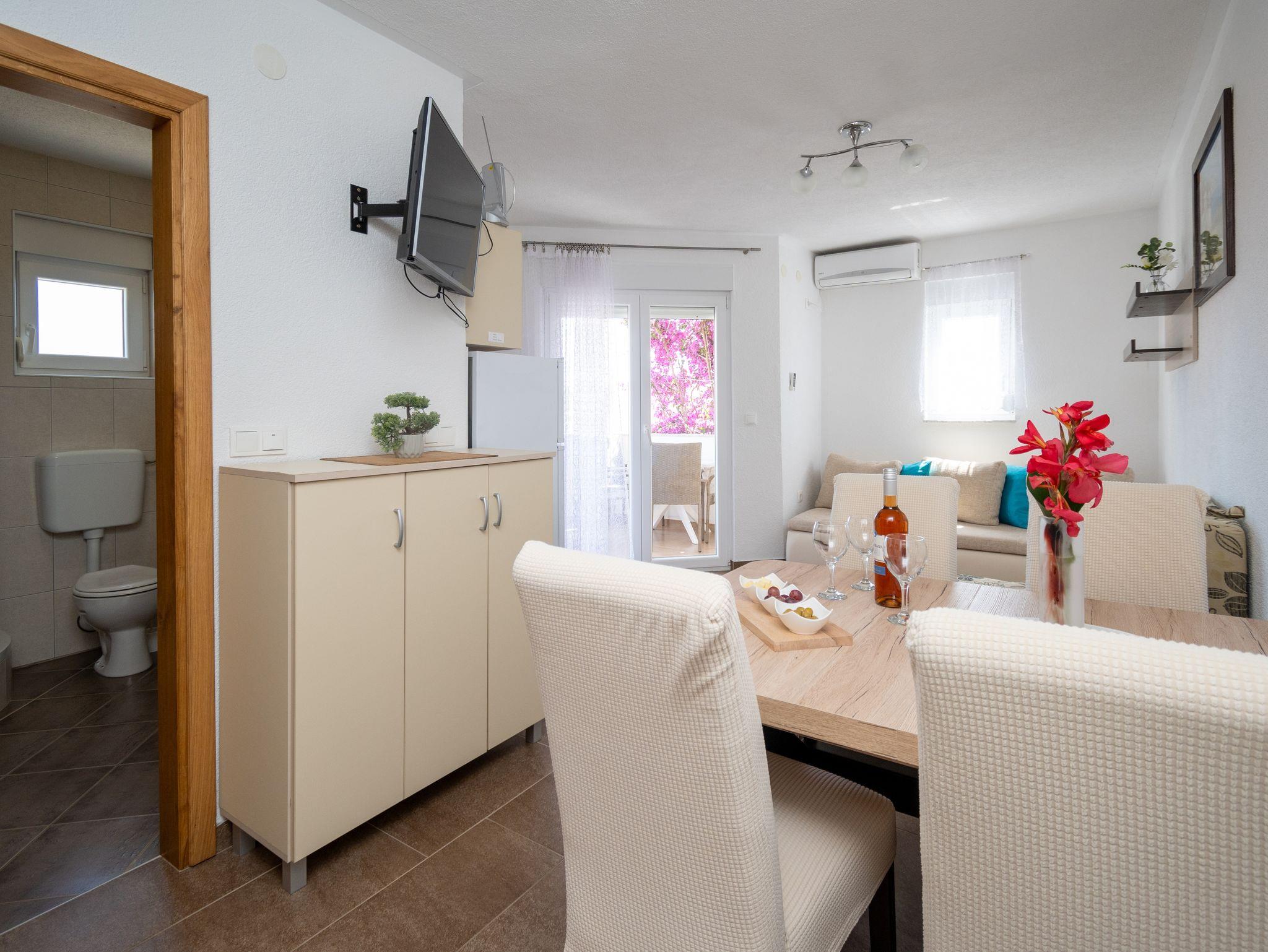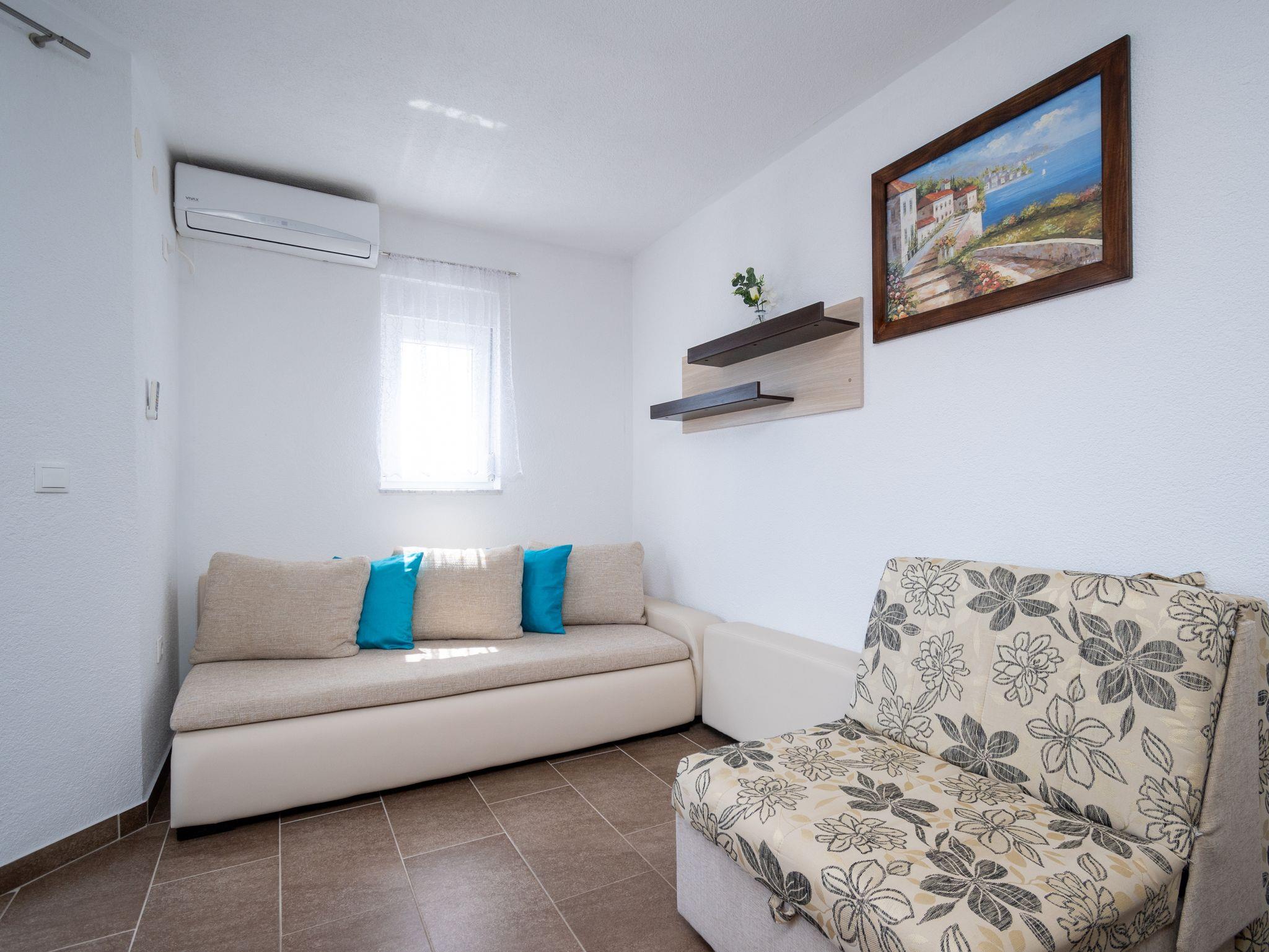Ferienwohnung bietet Platz für 4 Gäste. Die Betten sind in Schlafzimmern, die es 1 gibt, und in Wohnzimmer, innerhalb einer Gesamtfläche von 36m2, angeordnet. Die Gäste haben eine eigene Terrasse zur Verfügung, auf der sie in warmen Sommernächten genießen können. Das Apartment bietet Meerblick. Es ist erlaubt, Speisen auf dem Gemeinschafts-Grill vorzubereiten. IM PREIS INBEGRIFFEN: Kurtaxe, Endreinigung, Klimatisierung, Parkplatz, Internet. VERBINDLICHE ZUSÄTZLICHE KOSTEN: Aufzahlung für Kurzaufenthalte (prozentualer Zuschlag pro Nächtigungsanzahl: 30% - 1, 20% - 2, 10% - 3). Die Verfügbarkeit zusätzlicher Dienstleistungen in Ihrem reservierten Termin und die Preise derselben (falls nicht aufgeführt) müssen im Voraus überprüft werden. Zusätzliche Dienstleistungen die in der Zahlungsaufforderung nicht aufgeführt sind werden direkt beim Vermieter bezahlt, angenommen der Gast nutzt auch diese.