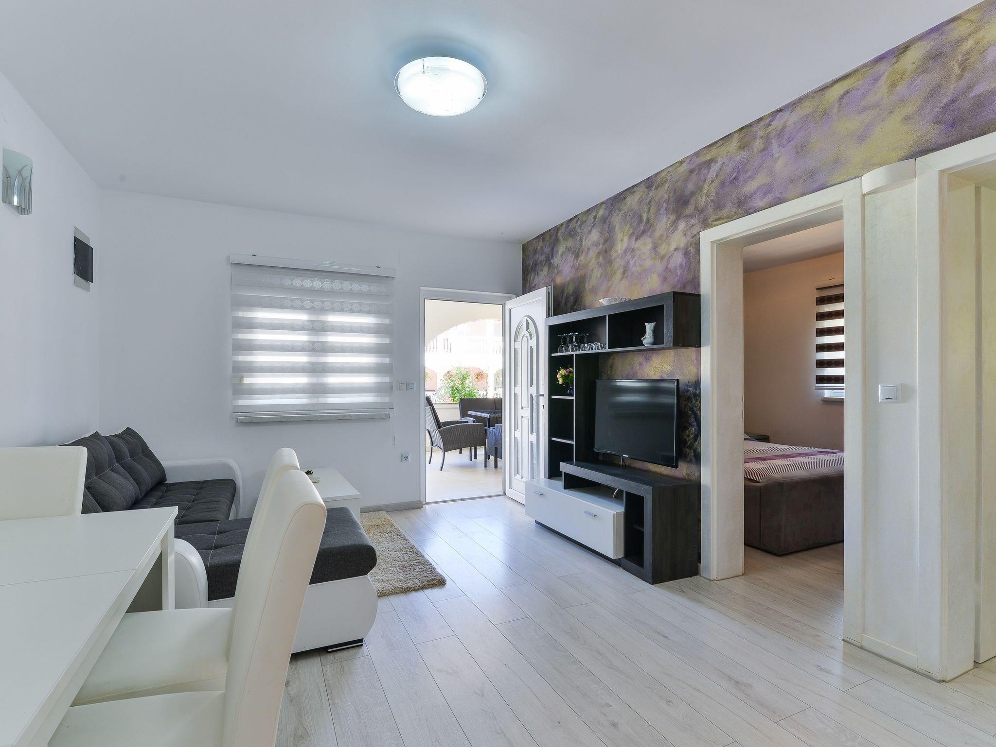 Ferienwohnung bietet Platz für 6 Gäste. Die Betten sind in Schlafzimmern, die es 2 gibt, und in Wohnzimmer, innerhalb einer Gesamtfläche von 47m2, angeordnet. Die Gäste haben eine eigene Terrasse zur Verfügung, auf der sie in warmen Sommernächten genießen können. Es ist erlaubt, Speisen auf dem Gemeinschafts-Grill vorzubereiten. IM PREIS INBEGRIFFEN: Kurtaxe, Endreinigung, Klimatisierung, Parkplatz, Internet, Wäschewaschen, Kinderbett. VERBINDLICHE ZUSÄTZLICHE KOSTEN: Aufzahlung für Kurzaufenthalte (prozentualer Zuschlag pro Nächtigungsanzahl: 30% - 1, 20% - 2, 10% - 3). Die Verfügbarkeit zusätzlicher Dienstleistungen in Ihrem reservierten Termin und die Preise derselben (falls nicht aufgeführt) müssen im Voraus überprüft werden. Zusätzliche Dienstleistungen die in der Zahlungsaufforderung nicht aufgeführt sind werden direkt beim Vermieter bezahlt, angenommen der Gast nutzt auch diese.