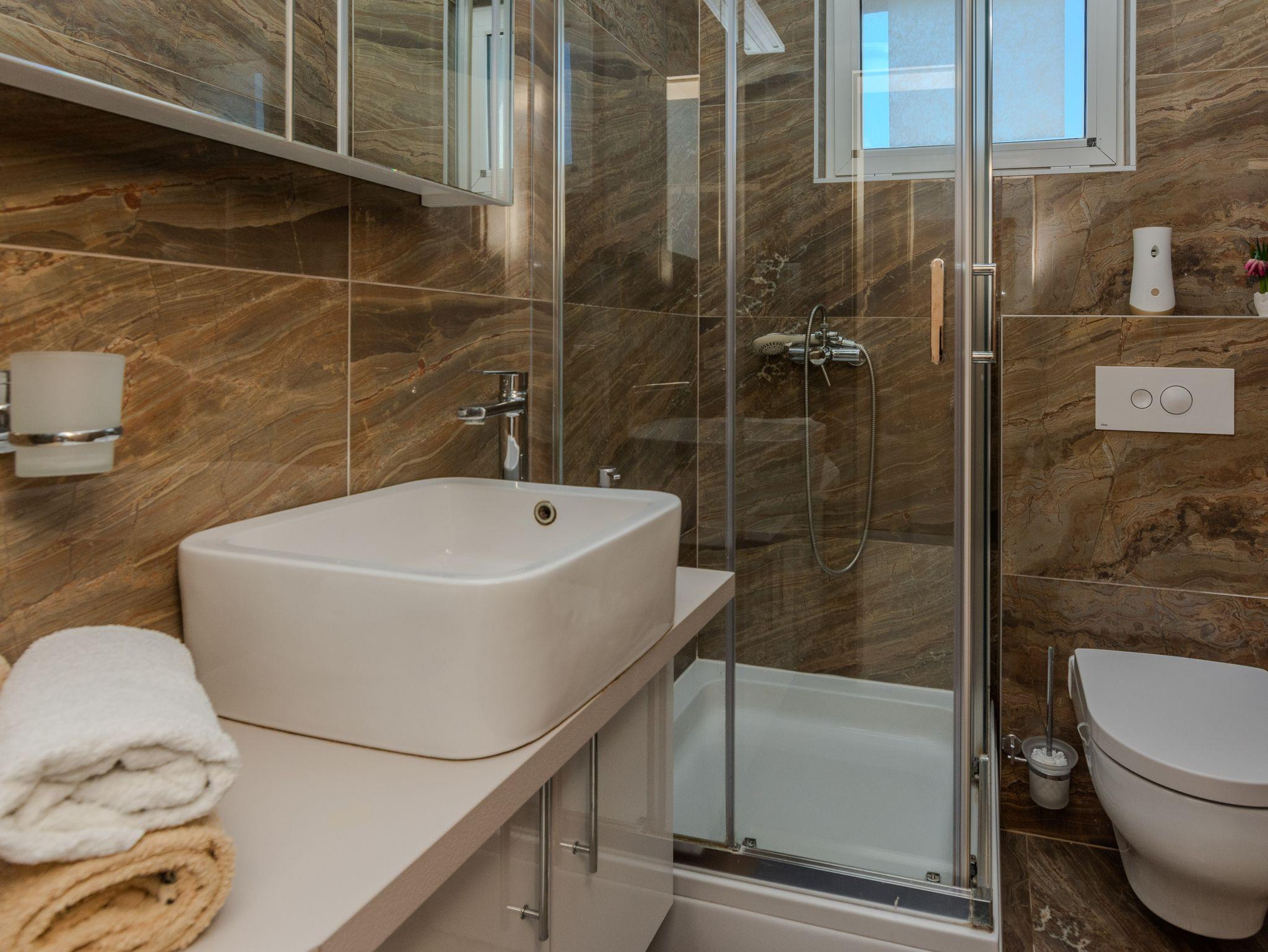 Ferienwohnung bietet Platz für 4 Gäste. Die Betten sind in Schlafzimmern, die es 1 gibt, und in Wohnzimmer, innerhalb einer Gesamtfläche von 42m2, angeordnet. Die Gäste haben eine eigene Terrasse zur Verfügung, auf der sie in warmen Sommernächten genießen können. Das Apartment bietet Meerblick. Es ist erlaubt, Speisen auf dem Gemeinschafts-Grill vorzubereiten. IM PREIS INBEGRIFFEN: Kurtaxe, Endreinigung, Klimatisierung, Parkplatz, Internet, Wäschewaschen, Kinderbett, Föhn. VERBINDLICHE ZUSÄTZLICHE KOSTEN: Aufzahlung für Kurzaufenthalte (prozentualer Zuschlag pro Nächtigungsanzahl: 30% - 1, 20% - 2, 10% - 3). Die Verfügbarkeit zusätzlicher Dienstleistungen in Ihrem reservierten Termin und die Preise derselben (falls nicht aufgeführt) müssen im Voraus überprüft werden. Zusätzliche Dienstleistungen die in der Zahlungsaufforderung nicht aufgeführt sind werden direkt beim Vermieter bezahlt, angenommen der Gast nutzt auch diese.