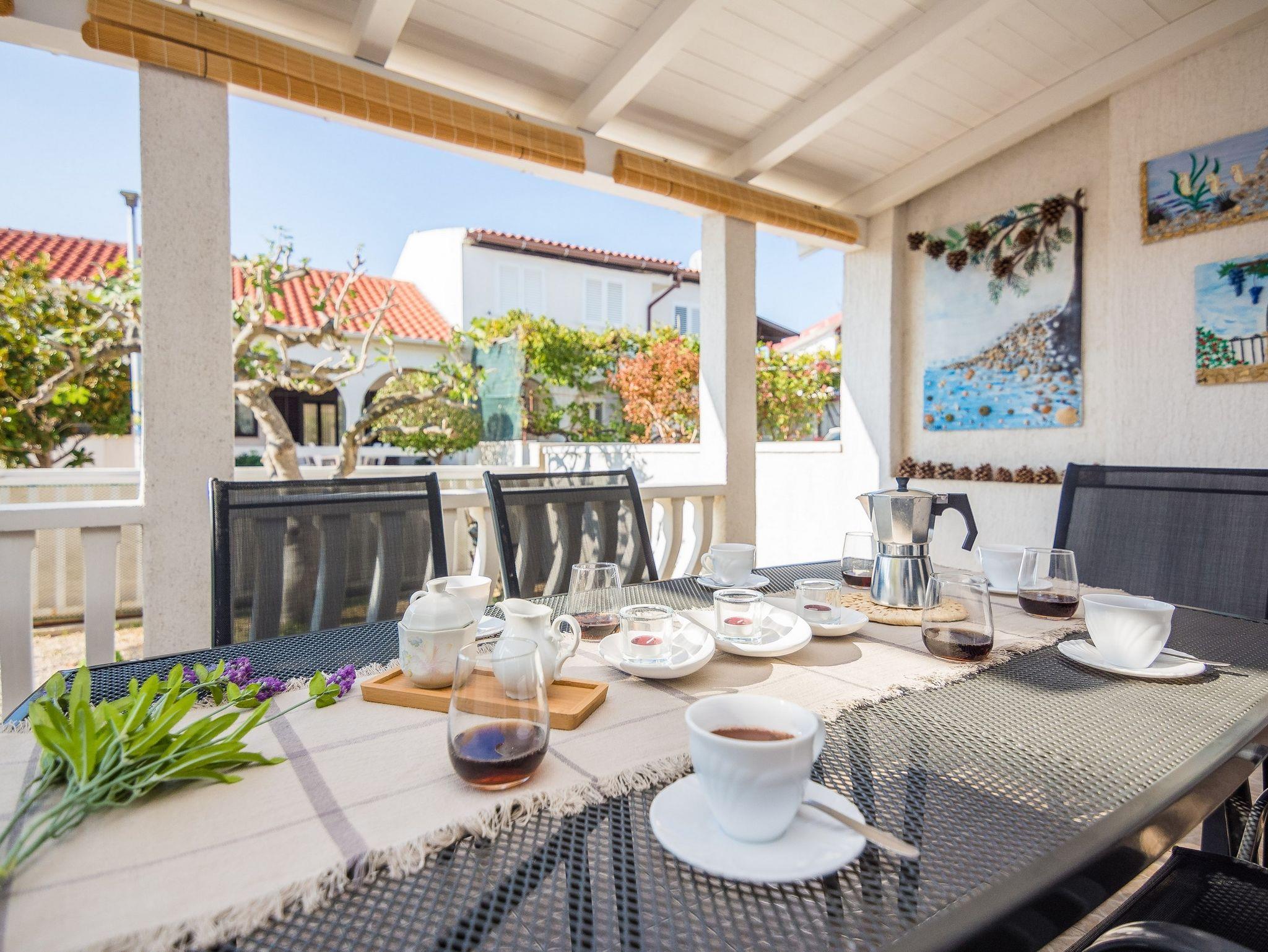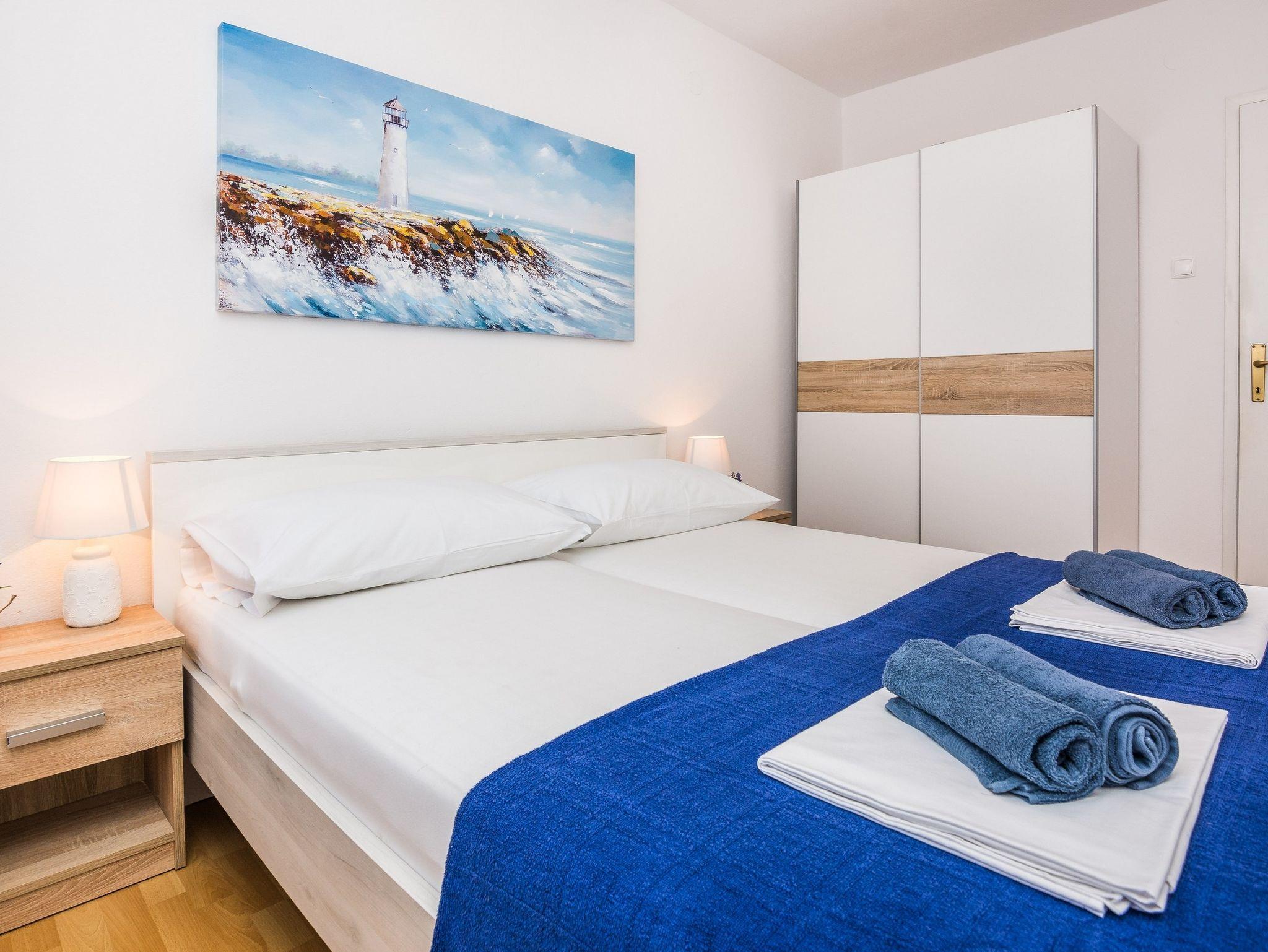 Ferienwohnung bietet Platz für 6 Gäste. Die Betten sind in Schlafzimmern, die es 2 gibt, und in Wohnzimmer, innerhalb einer Gesamtfläche von 46m2, angeordnet. Die Gäste haben eine eigene Terrasse zur Verfügung, auf der sie in warmen Sommernächten genießen können. Es ist erlaubt, Speisen auf dem Gemeinschafts-Grill vorzubereiten. IM PREIS INBEGRIFFEN: Kurtaxe, Endreinigung, Klimatisierung, Parkplatz, Internet, Bügeleisen, Bügelbrett, Föhn. VERBINDLICHE ZUSÄTZLICHE KOSTEN: Aufzahlung für Kurzaufenthalte (prozentualer Zuschlag pro Nächtigungsanzahl: 30% - 1, 20% - 2, 10% - 3). Die Verfügbarkeit zusätzlicher Dienstleistungen in Ihrem reservierten Termin und die Preise derselben (falls nicht aufgeführt) müssen im Voraus überprüft werden. Zusätzliche Dienstleistungen die in der Zahlungsaufforderung nicht aufgeführt sind werden direkt beim Vermieter bezahlt, angenommen der Gast nutzt auch diese.