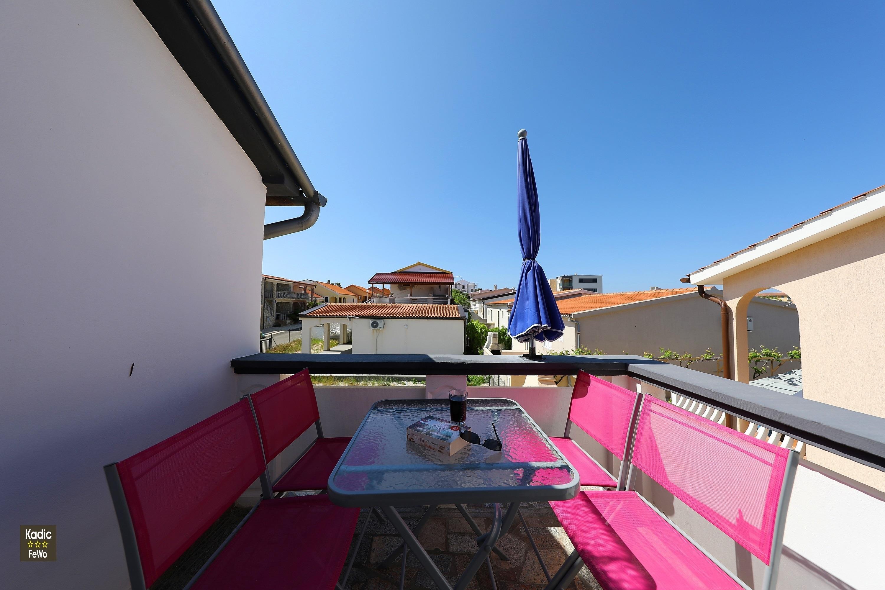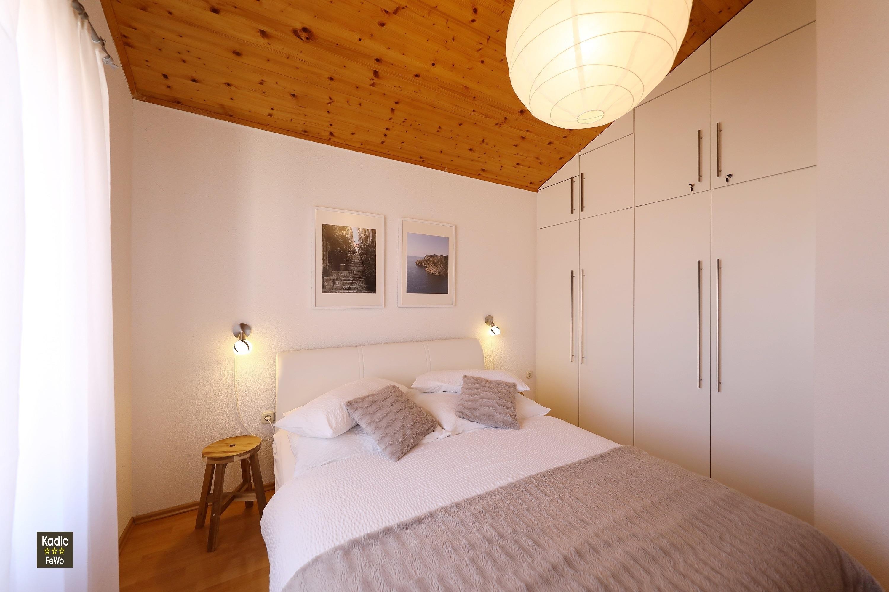 Nichtraucher Apartment für bis 4 Personen (2E + 2K ) Wohnzimmer mit Schlafcouch, Balkon mit Meerblick, 1 Schlafzimmer mit Doppelbett, Küche, Duschbad, Parkplatz, WLAN, Obergeschoss.