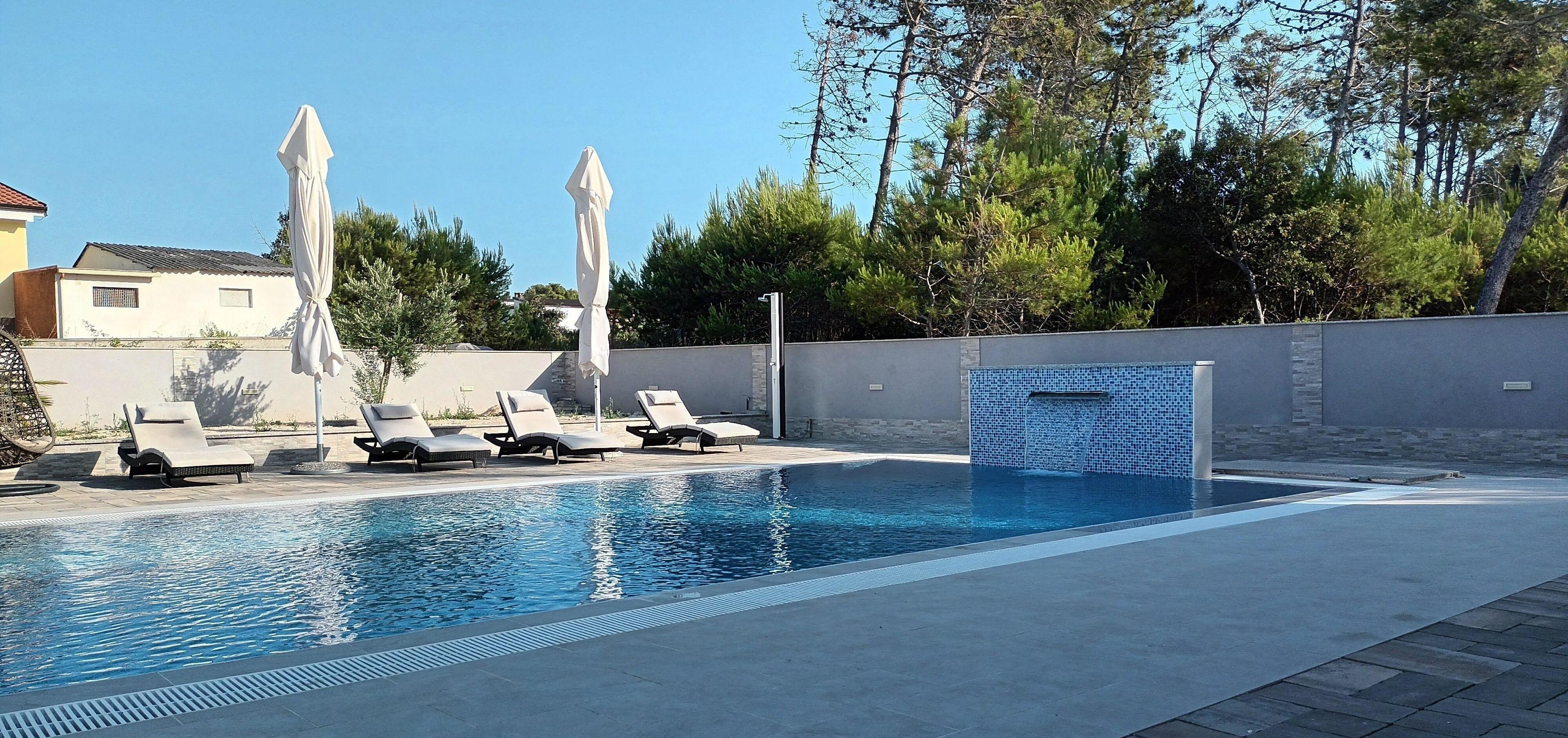 Auf dem ummauerten, abgeschlossenen Grundstück in einer Größe von 700 qm befindet sich der 65 qm grosse, 1,5m tiefe beheizbare Swimmingpool mit Massagedüsen und Wasserfall, sowie einer Aussendusche. Ebenfalls ein Grill, sowie Sitz- und Liegegelegenheiten.