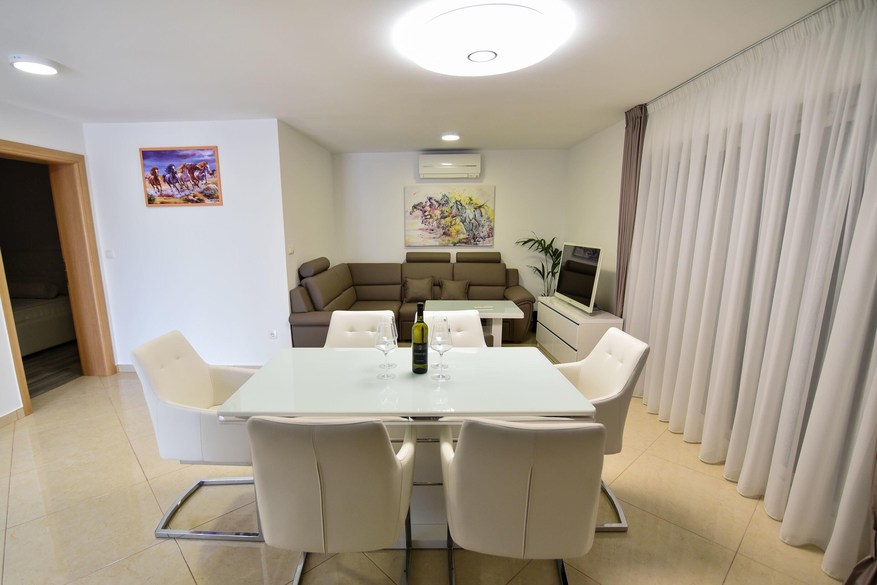 Das steinerne Haus wurde in einem modernen Baustil direkt am Meer erbaut und das Apartment bietet Platz für maximal 5 Personen. Es besitzt einen Balkon mit Blick auf das Meer und das Velebit Gebirge.
