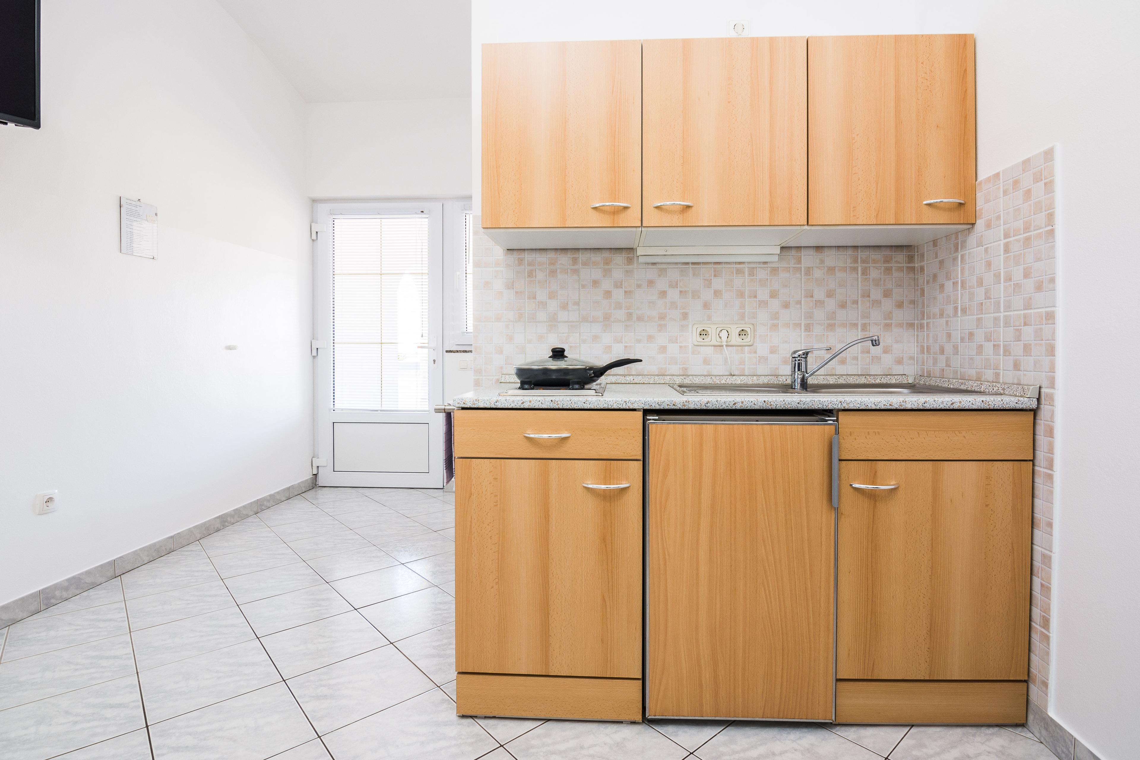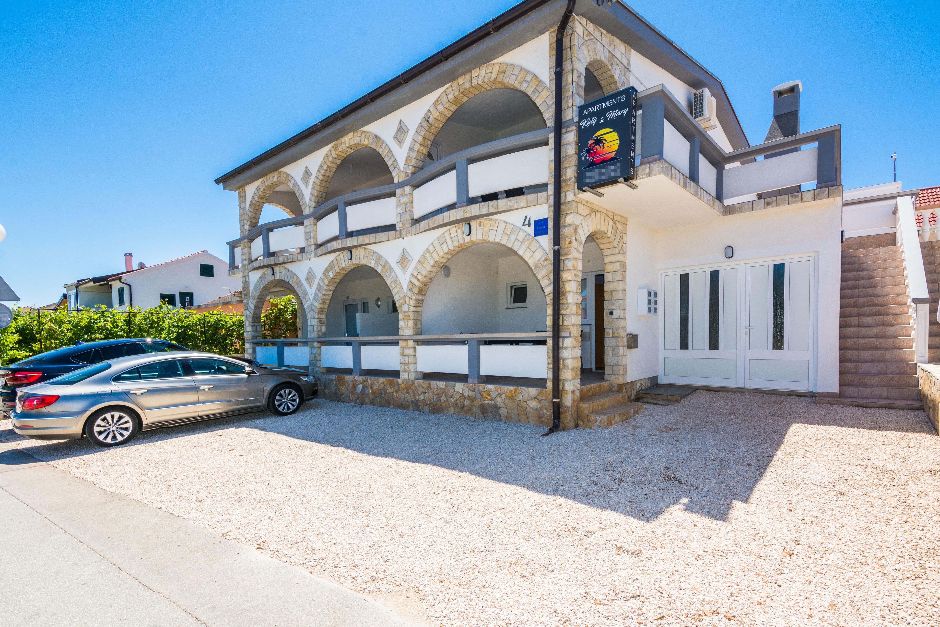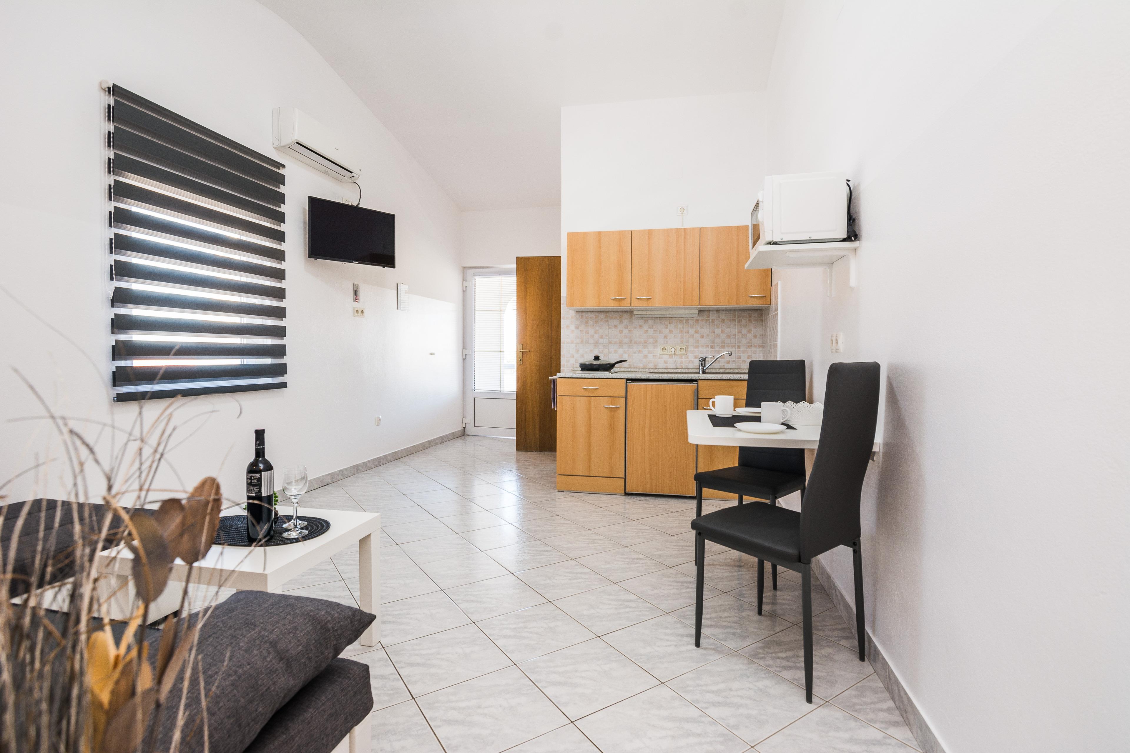 Die 30 m2 FeWo befindet sich im ersten Stock des Hauses und ist auf ein Wohnzimmer mit Essbereich und Küche, ein Schlafzimmer mit einem Doppelbett und ein Badezimmer mit Dusche unterteilt. Im Wohnzimmer gibt es ein Schlafsofa für zwei Personen. Vom Wohnzimmer aus gelangen Sie auf einen 10 m2 überdachten Balkon mit Tisch und Stühlen. Klimaanlage, WLAN, Sat-TV, Safe, Parkplatz auf dem Grundstück und ein zusätzlicher und gemeinsamer Balkon im ersten Stock mit Grill, Tisch und Stühlen sind nur einige der Merkmale dieses Apartments, die den Gästen zur Verfügung stehen. Restaurants, Einkaufladen und das Zentrum der Insel Vir sind nur wenige Gehminuten entfernt.