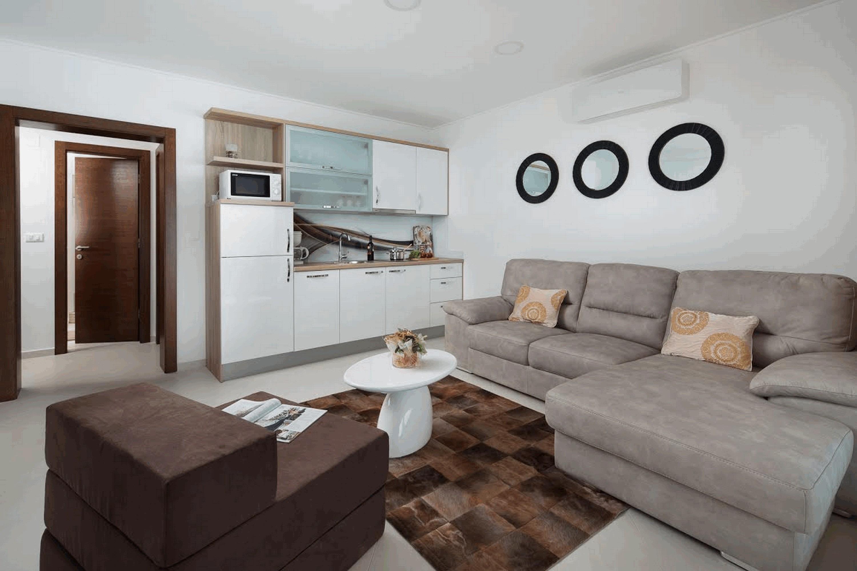 Die 50 m² große Wohnung im 2. Etage des Hauses teilt sich auf in ein Schlafzimmer, ein Badezimmer mit Dusche sowie einen Ess- & Wohnbereich mit komplett ausgestatteter Küche auf. Im Wohnraum befindet sich eine Schlafcouch für zwei Personen. Geschirrspülmaschine, Waschmaschine, Klima, Sat-Tv und Internetzugang per WLAN zählen zu den weiteren Ausstattungsmerkmalen. Die zum Apartment gehörende Balkon mit einem atemberaubenden Meerblick die mit Tisch, Stühlen und Liegen ausgestattet ist lädt zum Entspannen ein und bietet Platz zum gemeinsamen Frühstücken und Essen. Im Außenbereich stehen Ihnen und allen Gästen ein überdachter Pavillon mit Gartenmöbeln auf Verfügung. Der nächste Badestrand ist ungefähr 10 m vom Anwesen entfernt. Dieser Kieselstrand Strand liegt auf eine 7 km lange Promenade entlang die Küste mit einem herrlichen Sonnenuntergang. Ideal für entspannendes abends Spaziergänge oder mehr anspruchsvolle schnelles Gehen oder Laufen.