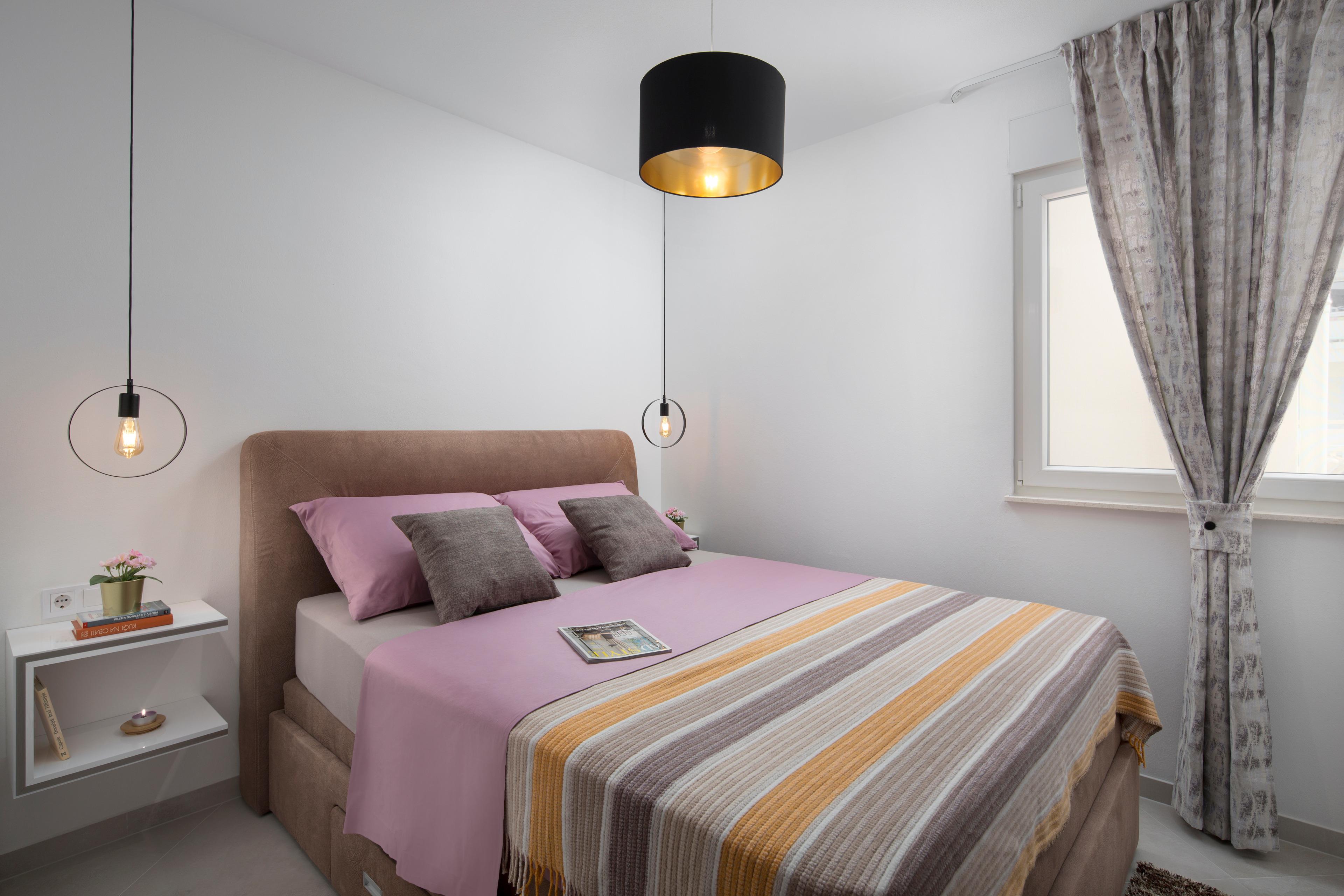 Die 63 m² Ferienunterkunft im Erdgeschoss des Hauses teilt sich auf ein Wohn- /Essbereich mit voll ausgestatteter Küche, zwei Schlafzimmern mit Doppelbett und ein Badezimmer mit Duschkabine. Zur Wohnung gehört eine 9 m² überdachte Terrasse mit Tisch und Stühlen und mit einem teilweisen Meerblick. Zu den weiteren Annehmlichkeiten gehören Waschmaschine, Geschirrspüler, Klimaanlage, Internet per WLAN, Sat-TV, Safe und Parkplatz auf dem Grundstück. Ein gemeinsamer Balkon und Lounge Bereich (85 m²) auf dem Dach des Hauses (3. Stock) mit Grill Pavillon, Sitzgarnitur, Liegestühlen und einem atemberaubenden Meerblick ist ein idealer Ort, um dem Alltag in den abendlichen Sonnenuntergang Atmosphäre zu entkommen. Am nahegelegenen Kiesstrand Lucica mit kristallklarem Meer können Sie Sonnenbaden, Schwimmen und Tauchen. Entlang der Küste erstreckt sich eine 7 km lange Promenade. Für diejenigen, die einen mehr aktiven Ferienurlaub bevorzugen, ist diese Promenade ideal für schnelles Gehen oder Laufen. Shops und Restaurants sind nur wenige Gehminuten entfernt.