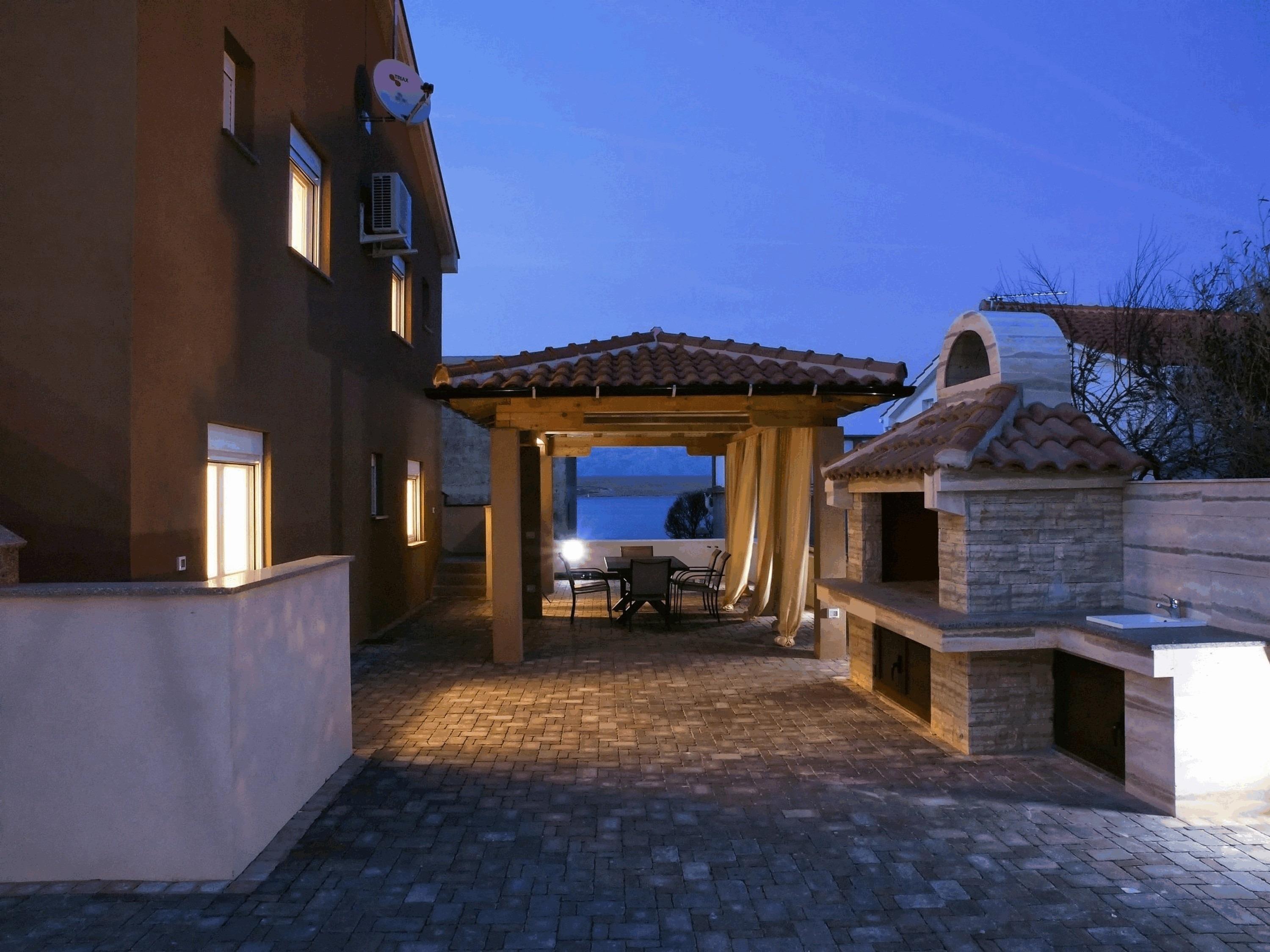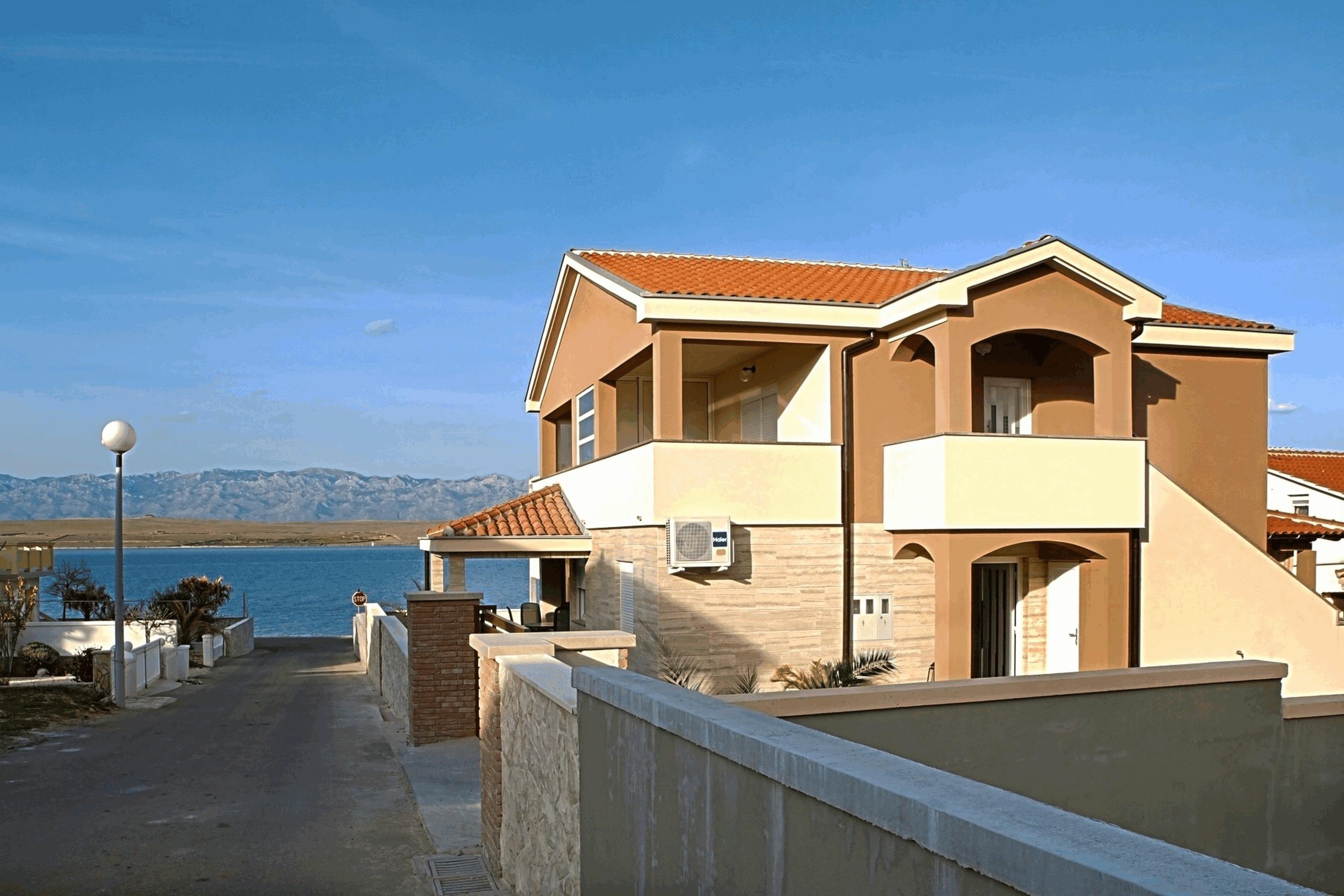 Zum Apartment gehört auch eine 300 m² großer Innenhof, der Ihnen und allen Gästen des Hauses zur Verfügung steht. Im Hof gibt es auch einen Pavillon mit Esstisch, Sitzgelegenheit und Grilmöglichkeit. Die 100 m² große Wohnung in dem Erdgeschoß des Hauses teilt sich auf zwei Schlafzimmern, ein Badezimmer mit Dusche sowie einen Ess- & Wohnbereich mit Küche auf. Im Wohnraum befinden sich eine Schlafcouch für zwei Personen. Eine gut ausgestattete Küche, Klima, Sat-TV und Internetzugang per WLAN zählen zu den weiteren Ausstattungsmerkmalen. Die zum Apartment gehörende Terrasse mit Meerblick, die mit Tisch, Stühlen und Liegen ausgestattet ist lädt zum Entspannen ein und bietet Platz zum gemeinsamen Frühstücken und Essen. Einkaufsmöglichkeiten und Restaurants erreichen Sie innerhalb weniger Gehminuten. Ungefähr 20 m vom Haus entfernt erwarten Sie schon erwähnt schönes Kiesel Strand die ladet zum Sonnenbaden ein. Dieser Strand liegt auf eine 7 km lange Promenade entlang Küste mit einem herrlichen Sonnenuntergang. Ideal für entspannendes abends Spaziergänge oder mehr anspruchsvolle schnelles Gehen oder Laufen.