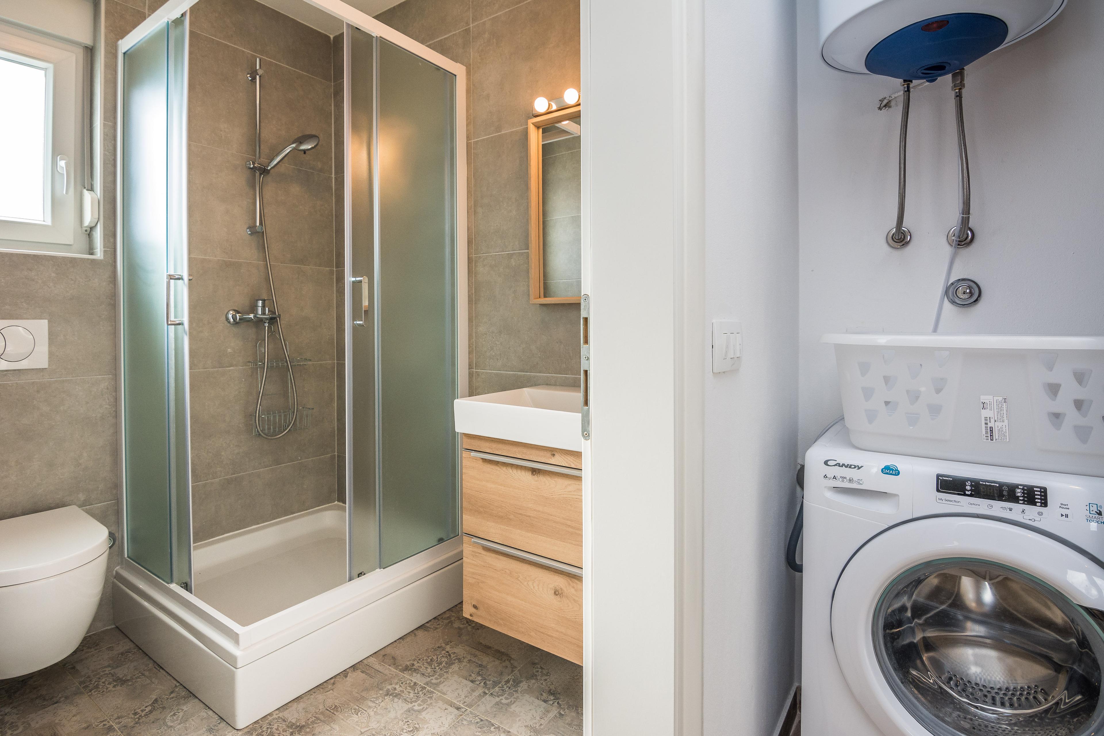 Die Wohnung ist aufgeteilt auf ein Wohnzimmer und Esszimmer mit Küche, ein Schlafzimmer mit Doppelbett und ein Badezimmer mit Dusche. Im Wohnzimmer befindet sich ein Schlafsofa für zwei weitere Personen. Vom Wohnzimmer aus erreichen Sie auf eine überdachte und möblierte 7 m² Balkon. Im Innenhof des Hauses (200 m²) befindet sich der Grill. Die Entfernung zum nächsten Restaurant und Geschäft beträgt 150 m. Zu den weiteren Ausstattungsmerkmale gehören Klimaanlage, WLAN, Sat-TV, Waschmaschine und Parkplatz auf dem Grundstück. Kinderbett und Hochstuhl sind auf Anfrage kostenlos erhältlich. Haustiere sind gegen einen Aufpreis von 15 EUR pro Tier und Nacht willkommen.