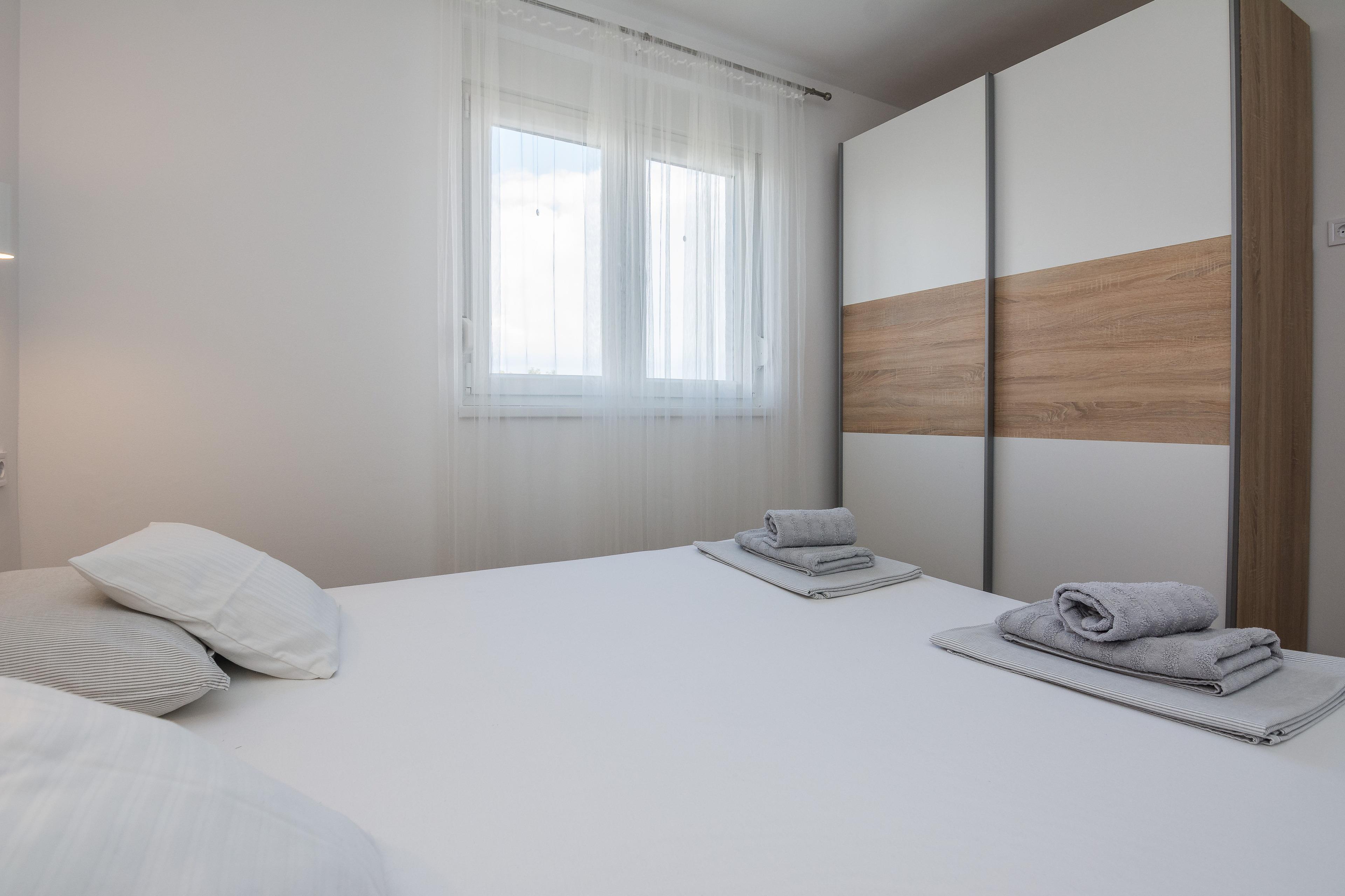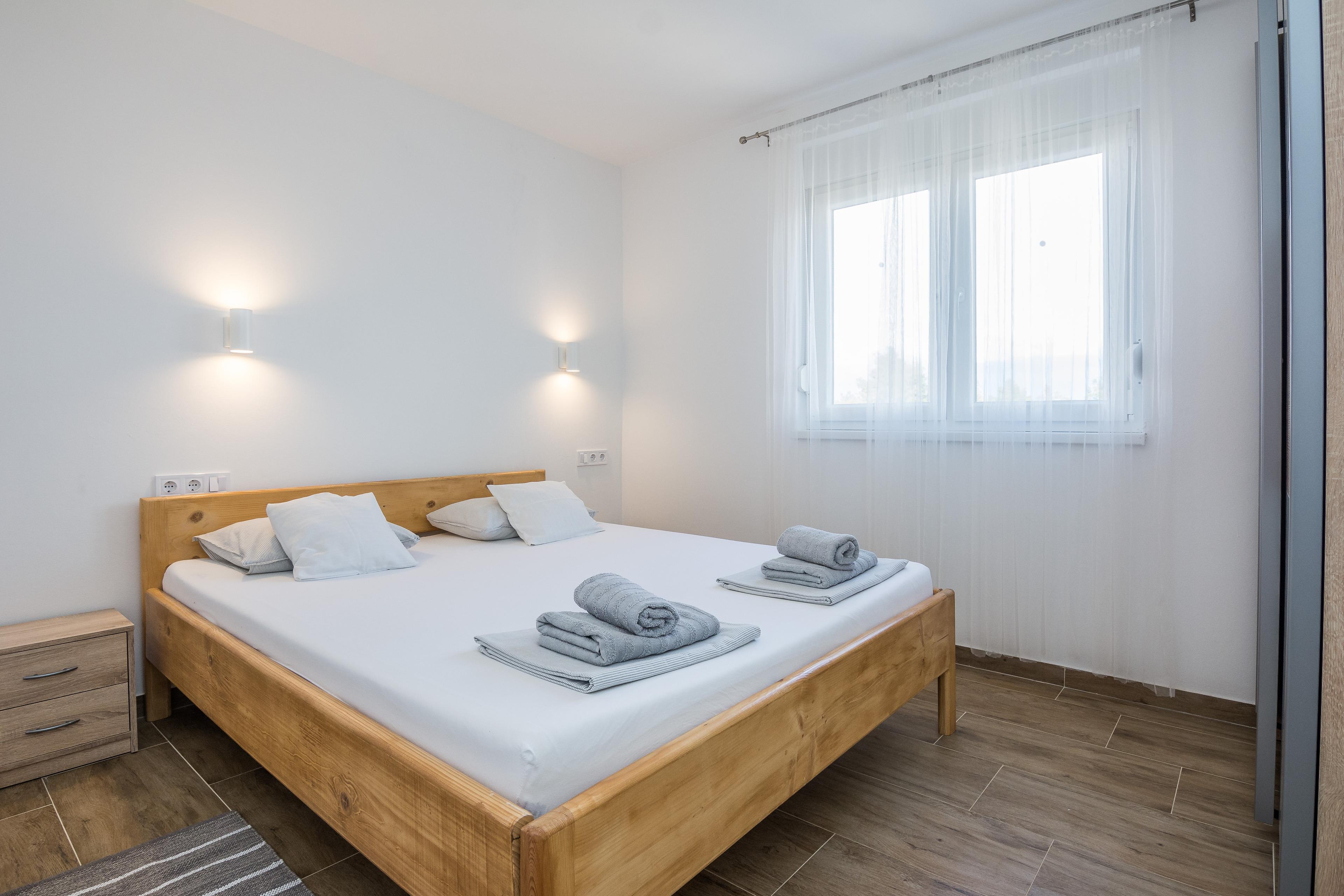 Diese modern eingerichtete Ferienwohnung (38 m²) für 2-4 Personen im erste Stock des Hauses befindet sich in Zentrum der Insel Vir und ist nur 700 m vom Kieselstrand Jadro entfernt.