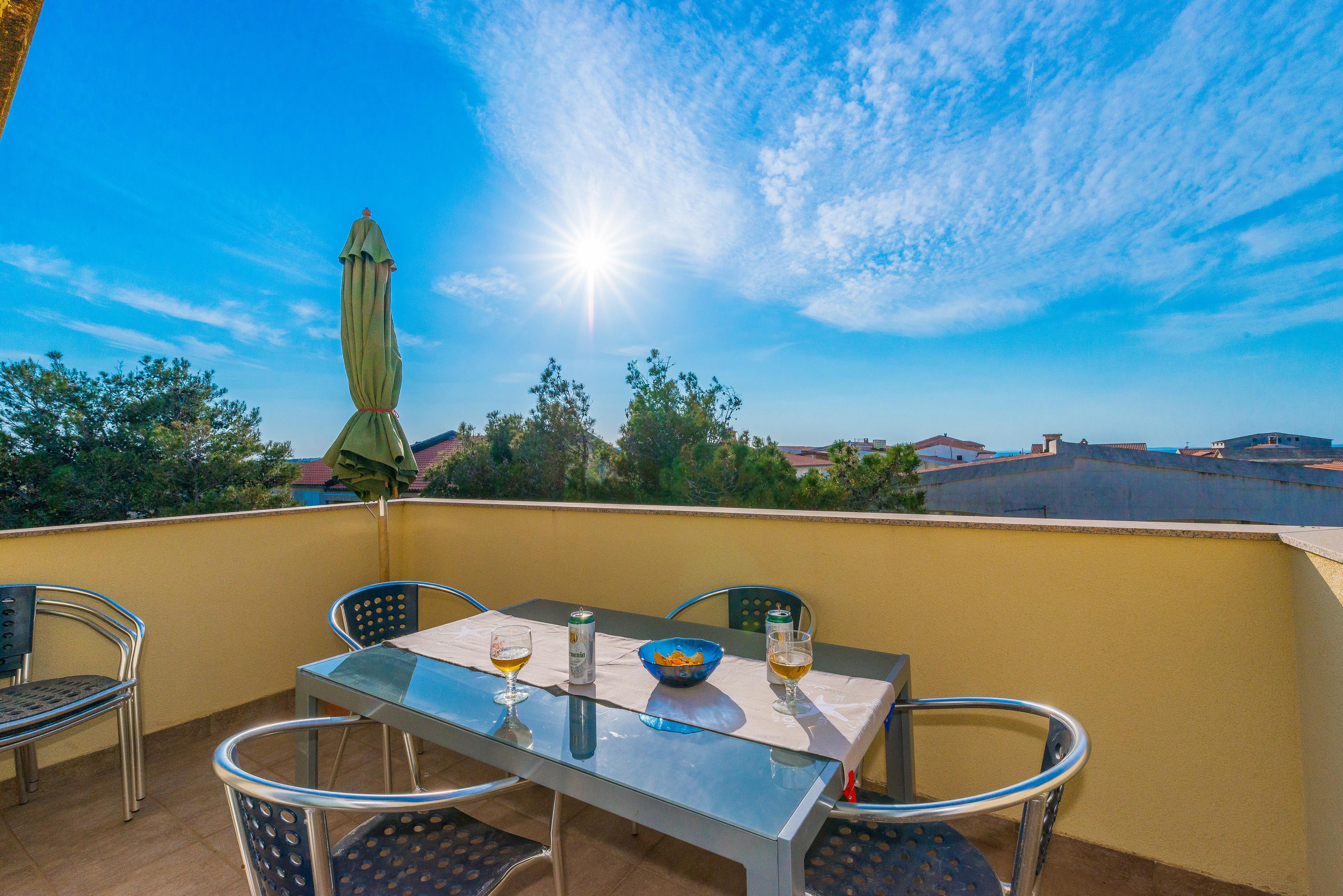 Die Wohnung ist aufgeteilt in ein Wohnzimmer mit Küche und Esszimmer, ein Doppelzimmer mit einem Doppelbett, zwei Einzelzimmer mit einem Bett für eine Person und ein Badezimmer mit Dusche. Im Wohnzimmer befindet sich ein Schlafsofa für zwei weitere Personen. Vom Wohnzimmer aus gelangt man auf eine möblierte und überdachter 8 m² Balkon. Zu den weiteren Annehmlichkeiten gehören Klimaanlage, SAT-TV, WLAN. Kinderbett auf Anfrage. Eine gemeinsame Lounge befindet sich im Keller des Hauses die umfasst eine Bar, Sitzplätze, Darts, SAT TV, Radio, Klimaanlage und Kühlschrank mit Gefrierfach. Hinter dem Haus gibt es einen Parkplatz für Fahrräder. Im geräumigen Innenhof des Hauses (200 m²) befindet sich ein Pavillon mit Grill und Gartenmöbeln, ideal für Versammlungen in warmen Sommerabenden. Die Wohnung befindet sich in einer Entfernung von 70 m vom Meer und 150 m von Shops und Restaurants. Haustiere sind gegen einen Aufpreis von 15 EUR pro Tier und Nacht willkommen.