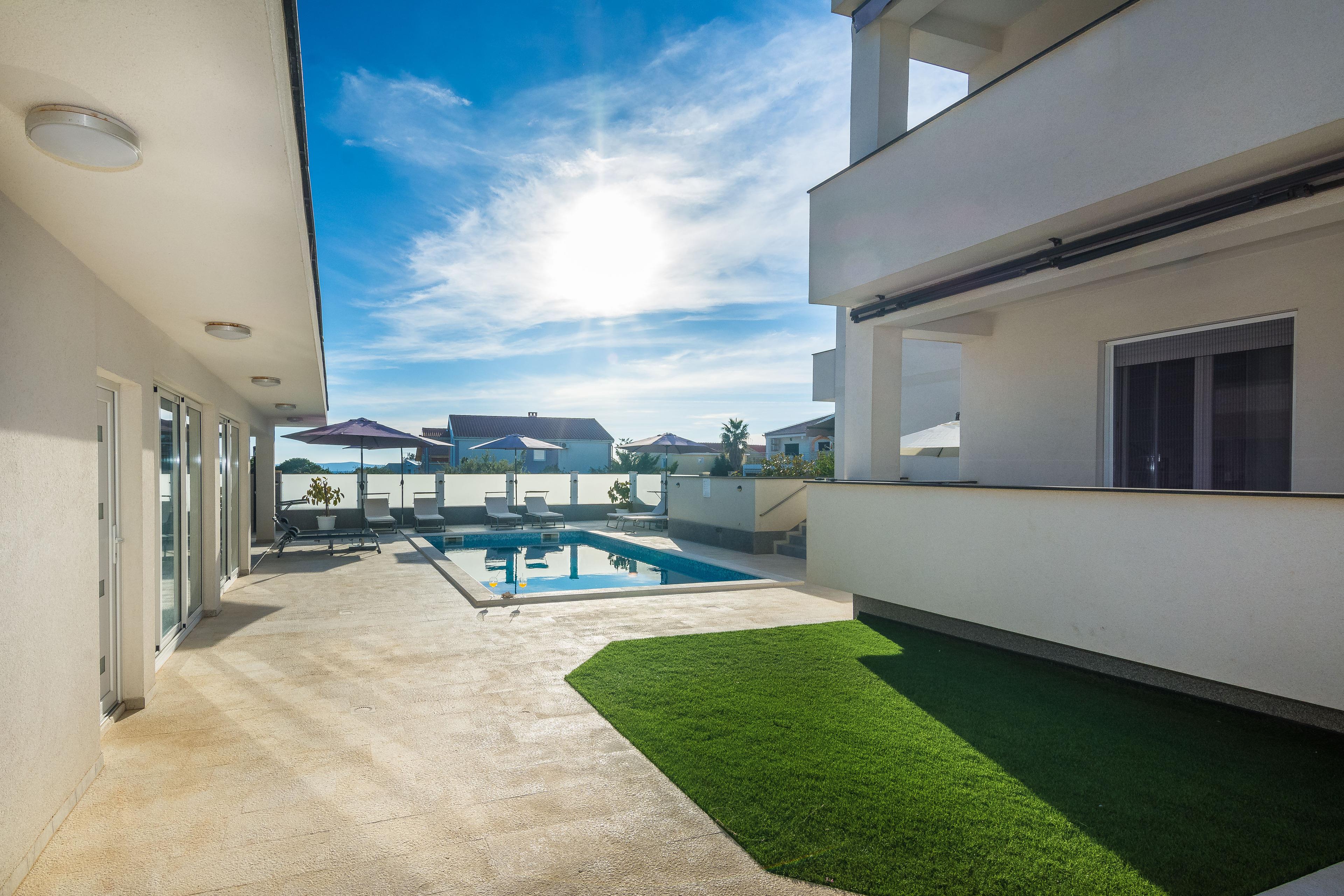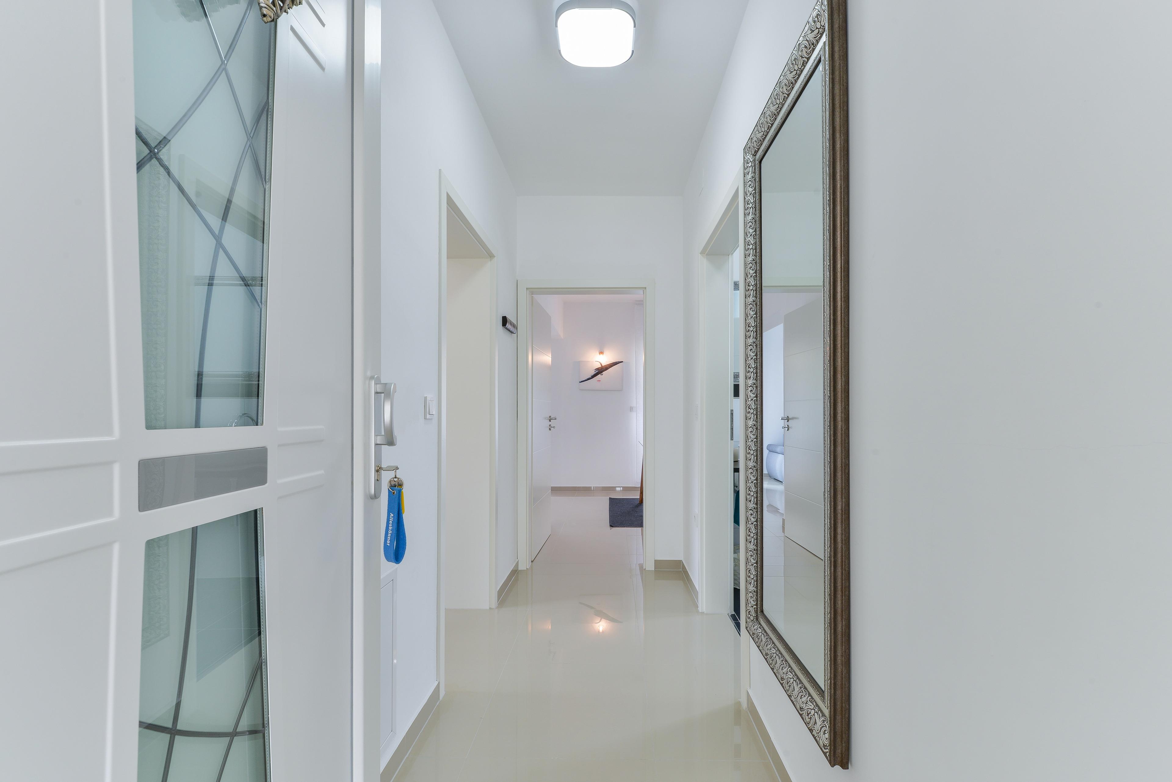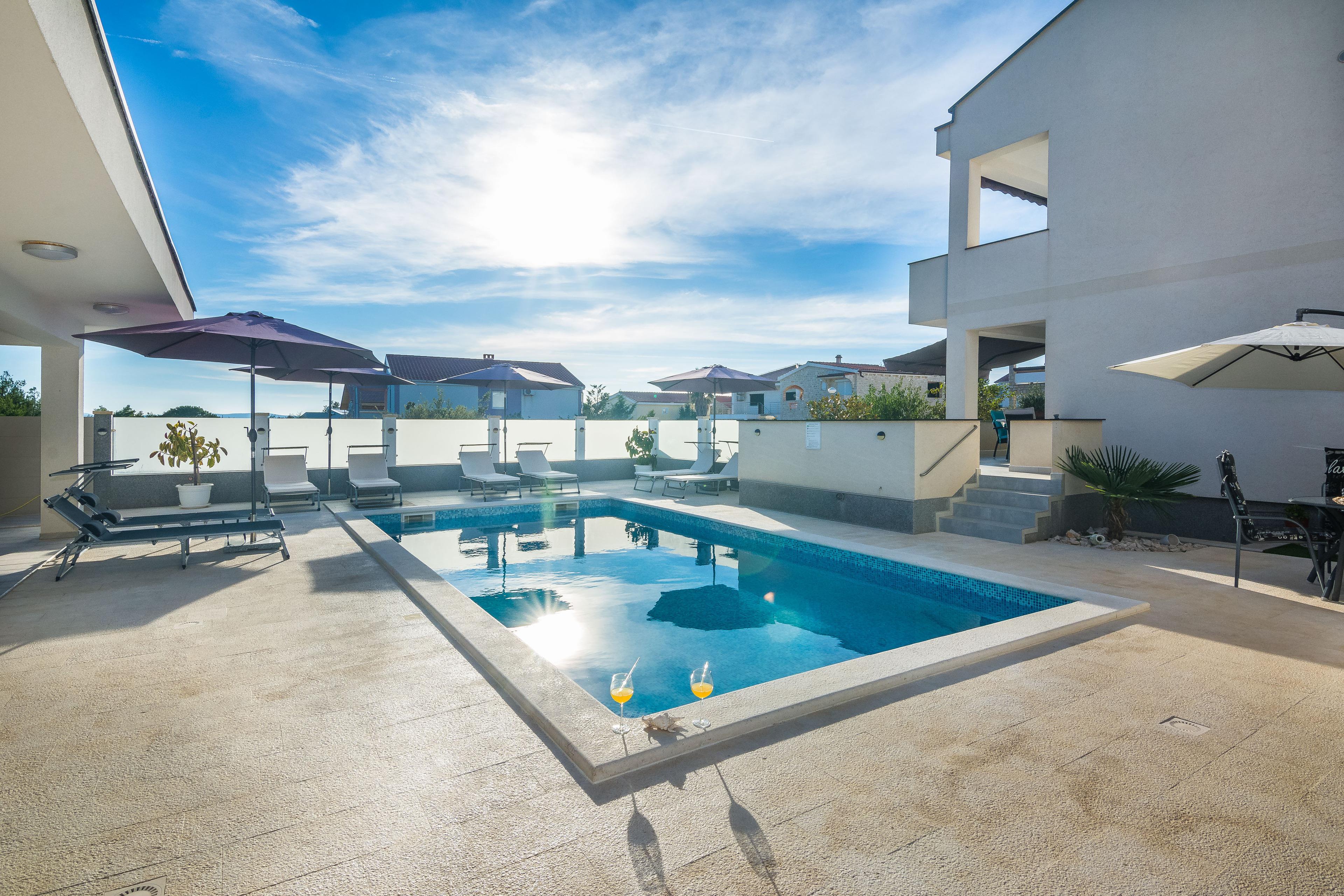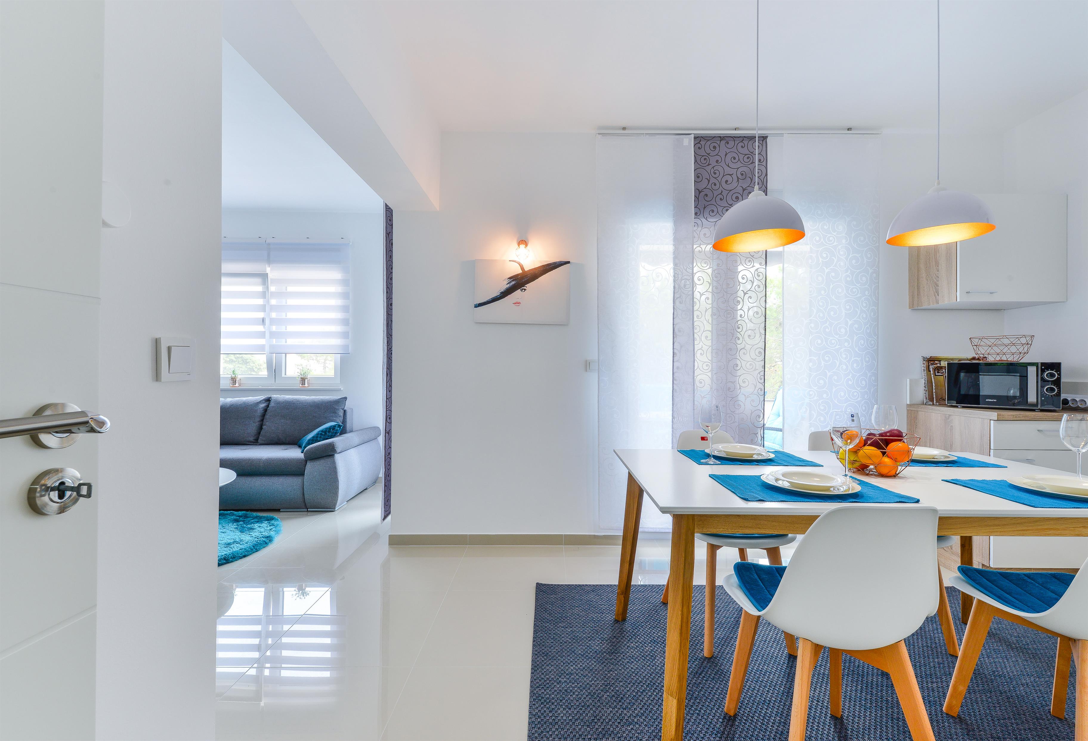 Die 59 m² Wohnung im ersten Stock des Hauses teilt sich auf einen Wohn- und Essbereich mit komplett ausgestatteter Küche, ein Doppelzimmer mit Doppelbett und ein Badezimmer mit Dusche. Im Wohnzimmer befindet sich ein Schlafsofa für zwei weitere Personen. Vom Wohnbereich aus erreichen Sie auf einen möblierten Balkon mit Meerblick und Blick aufs Pool (8 m²). Klimaanlage, WLAN im Appartement und auf dem Anwesen, Geschirrspüler, Espressomaschine und Parkplatz auf dem Grundstück sind nur einige der Annehmlichkeiten dieser Wohnung und im Preis inbegriffen. Kinderbett und Kinderhochstuhl auf Anfrage und ohne Aufpreis. Im geschlossenen Innenhof des Hauses (500 m²) befindet sich ein 32m² Pool (8 m lang, 4 m breit, 1,5 m tief) mit Liegestühlen, Sonnenschirmen, Außendusche und Toilette sowie ein geräumiger überdachter Pavillon mit Grill und Sitzgarnitur. Restaurants und Shops erreichen Sie in wenigen Gehminuten. Das Zentrum der Insel Vir ist 2000 m entfernt.