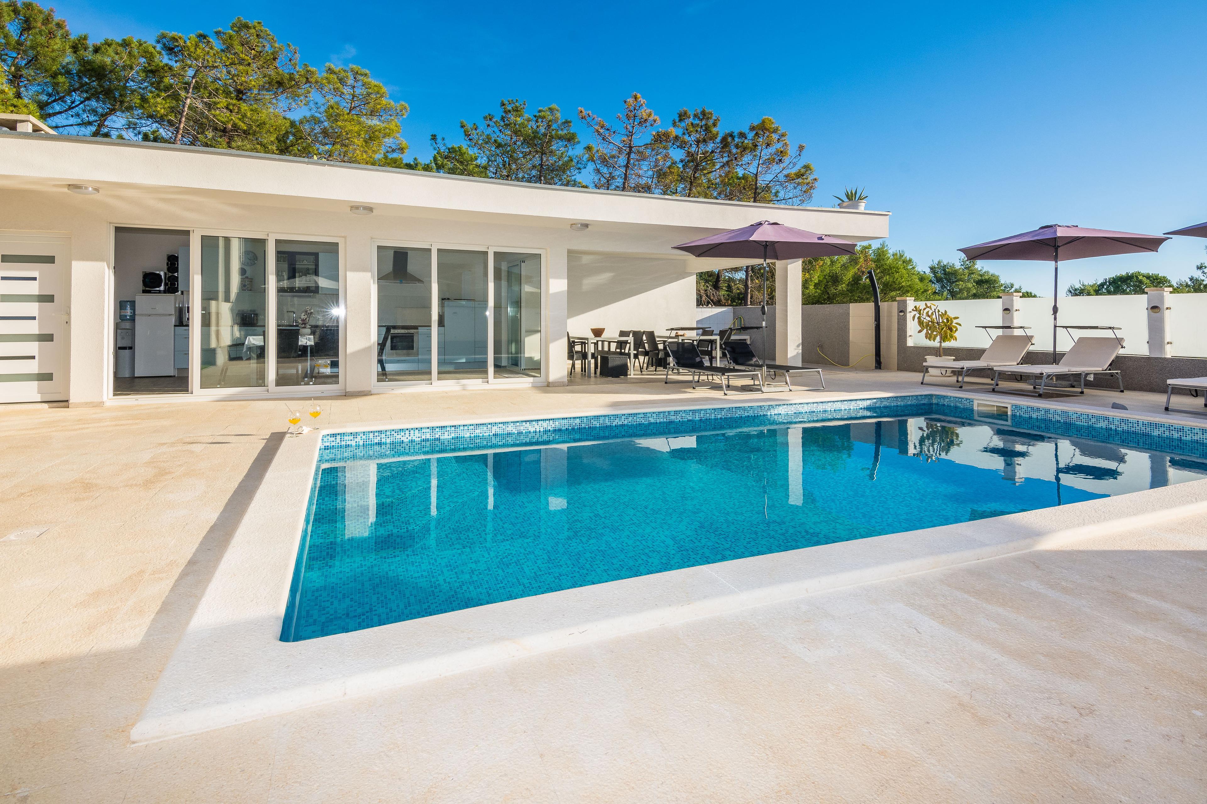 Diese Ferienwohnung mit Pool und Meerblick ideal für 2 - 4 Personen befindet sich in einer ruhigen Gegend der Insel Vir nur 200 m vom den Kiesstrand Kozjak entfernt.