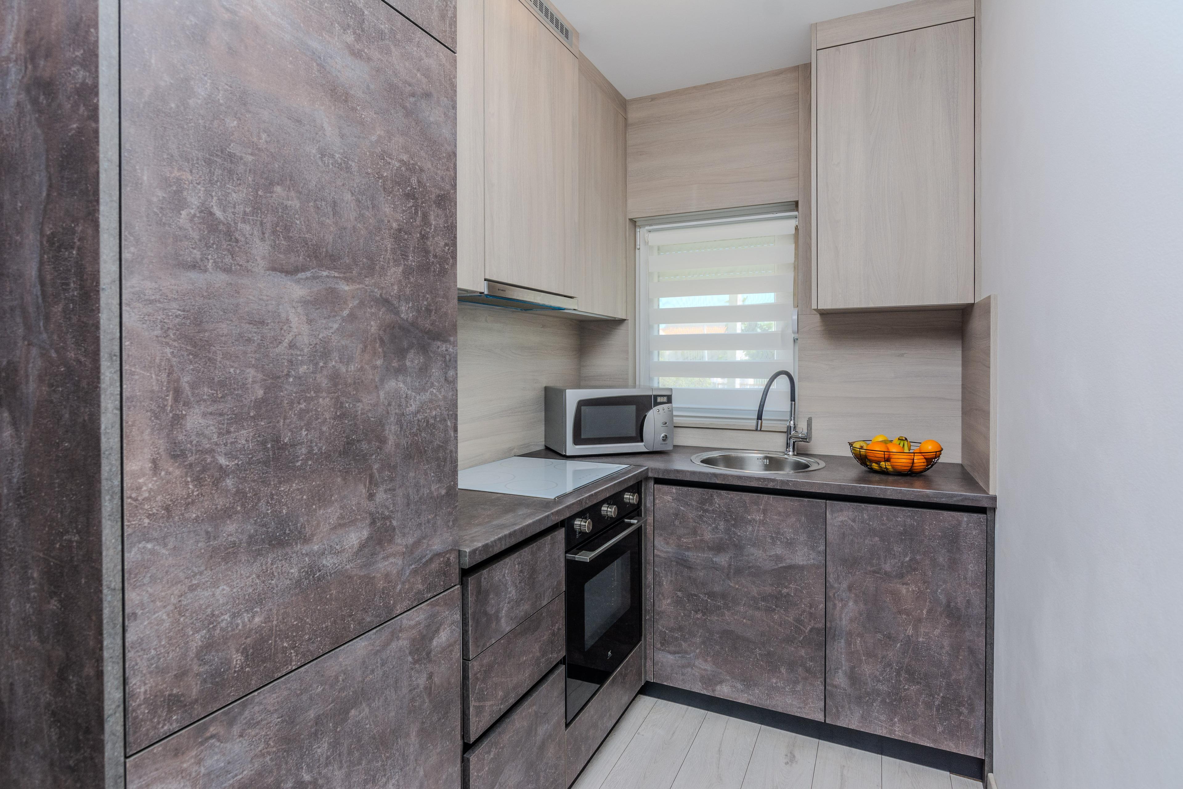 Luxuriöse und modern eingerichtete 52m2 Wohnung im Erdgeschoß des Hauses teilt sich auf einem Wohnzimmer, Esszimmer, gut ausgestattete Küche, zwei Schlafzimmern mit Doppelbett und ein Badezimmer mit Dusche und Toilette. Im Wohnzimmer befindet sich ein Schlafsofa für zwei weitere Personen. Vom Wohnzimmer aus erreichen Sie eine 13m2 Terrasse, ausgestattet mit Tisch und Stühlen, ideal für gemeinsames Frühstück oder Abendessen. Klimaanlage, Sat-TV, Internetzugang und Parkplätze sind ebenfalls vorhanden und ohne Aufpreis. Der nächste Strand ist nur 30 Meter vom Haus entfernt, wo Sie Sonnenbaden, Schwimmen oder Tauchen in den erfrischenden Meer können.