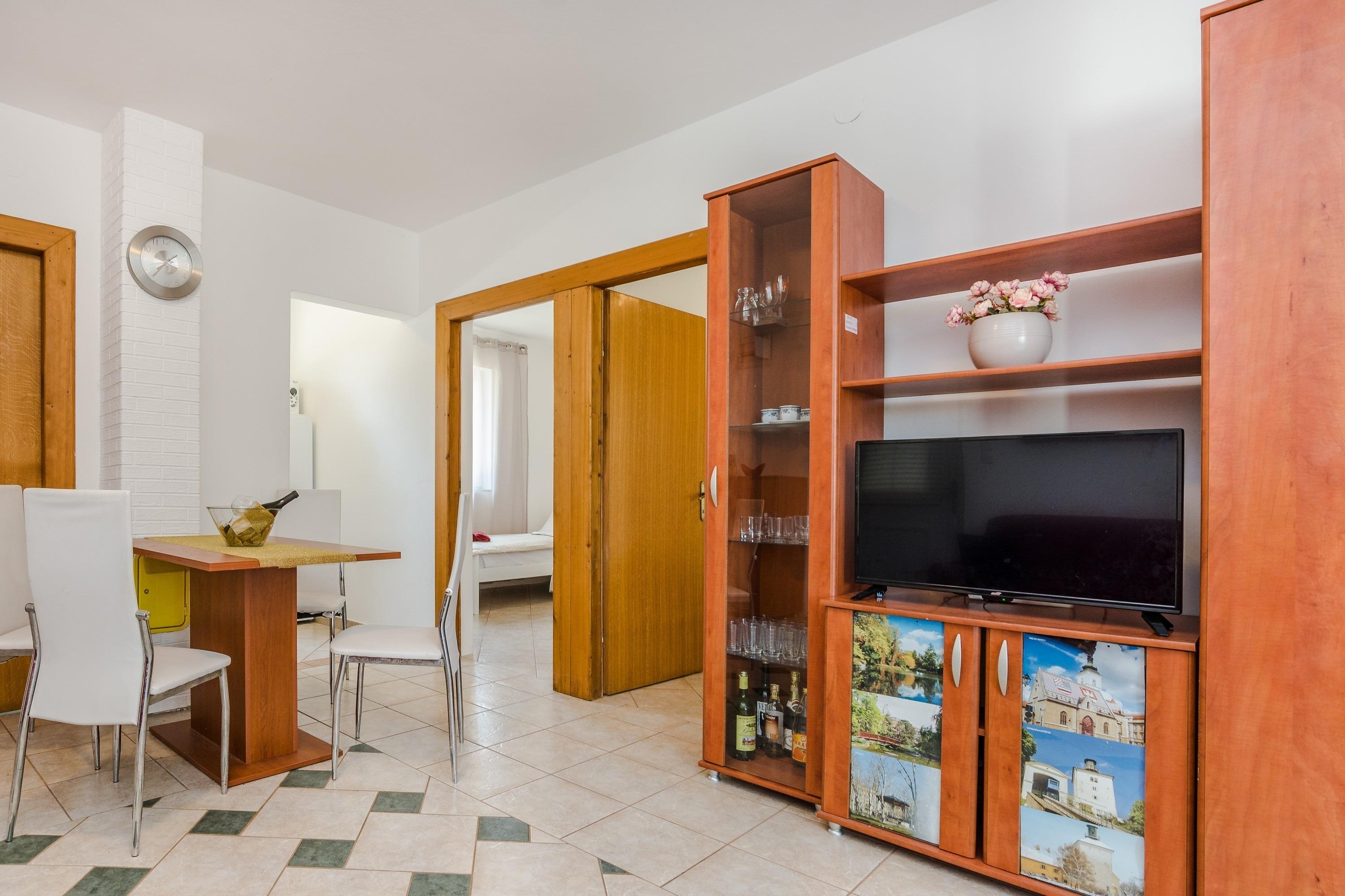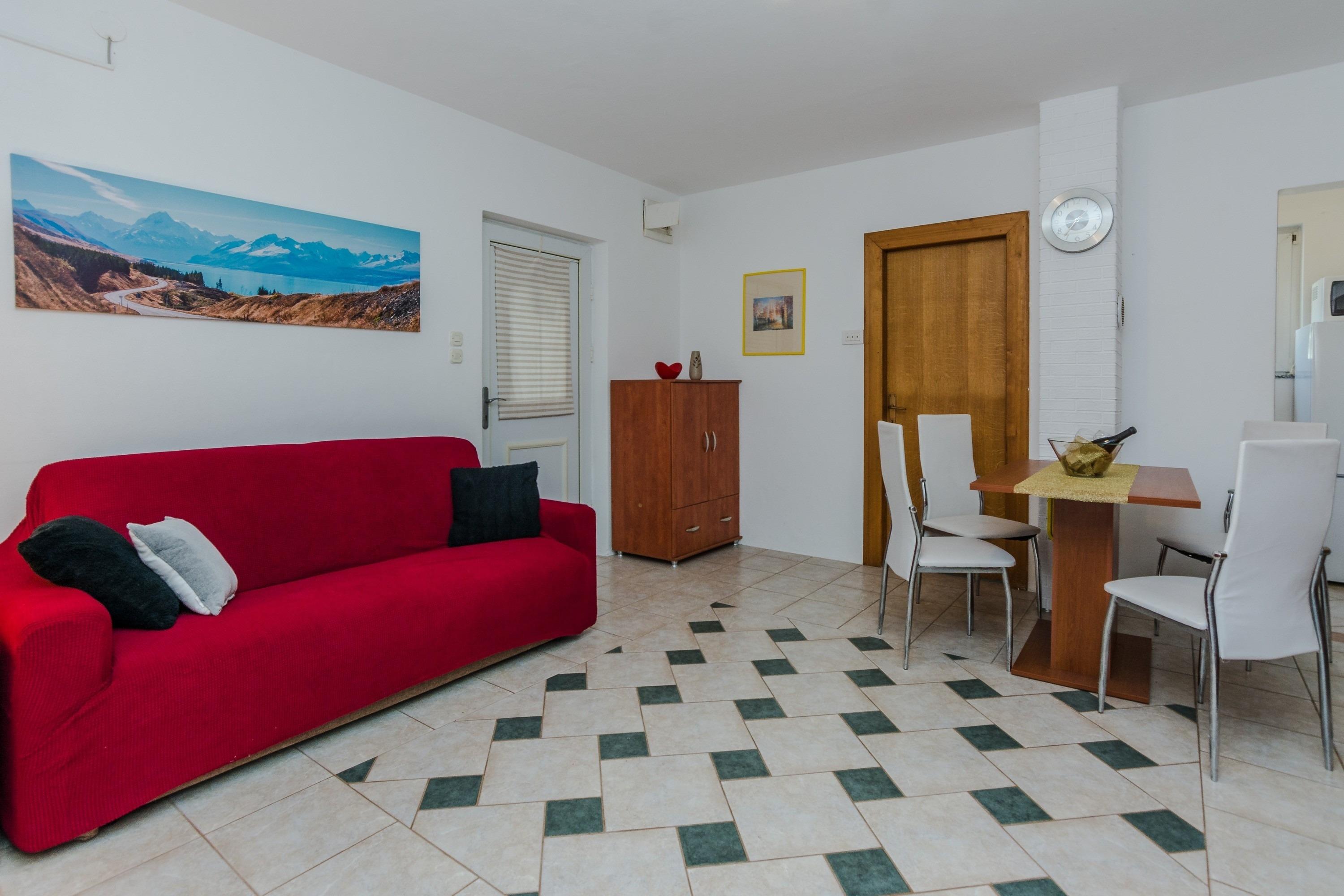 Die Wohnung ist mit Klimaanlage und Internet per WLAN ausgestattet. Die beliebte Kieselstrand Jadro ist nur 400 vom Haus entfernt. Die Wohnung im Erdgeschoss des Hauses teilt sich auf ein Wohnzimmer mit Esszimmer und Küche, zwei Schlafzimmer (eine mit Doppelbett und eine mit zwei getrennten Betten), ein Badezimmer mit Dusche sowie eine klimatisierte, geschlossene und möblierte 30m2 Terrasse mit Küche und 20m2 Außenterrasse mit Grill. Im Wohnzimmer befindet sich ein Schlafsofa für zwei weitere Personen. Grill und Parkplatz auf dem Grundstück stehen Ihnen zur Verfügung und ohne Aufpreis. Restaurants und Einkaufsmöglichkeiten sind in wenige Gehminuten entfernt. Haustiere sind gegen einen Aufpreis von 15 EUR pro Tier und Nacht willkommen.