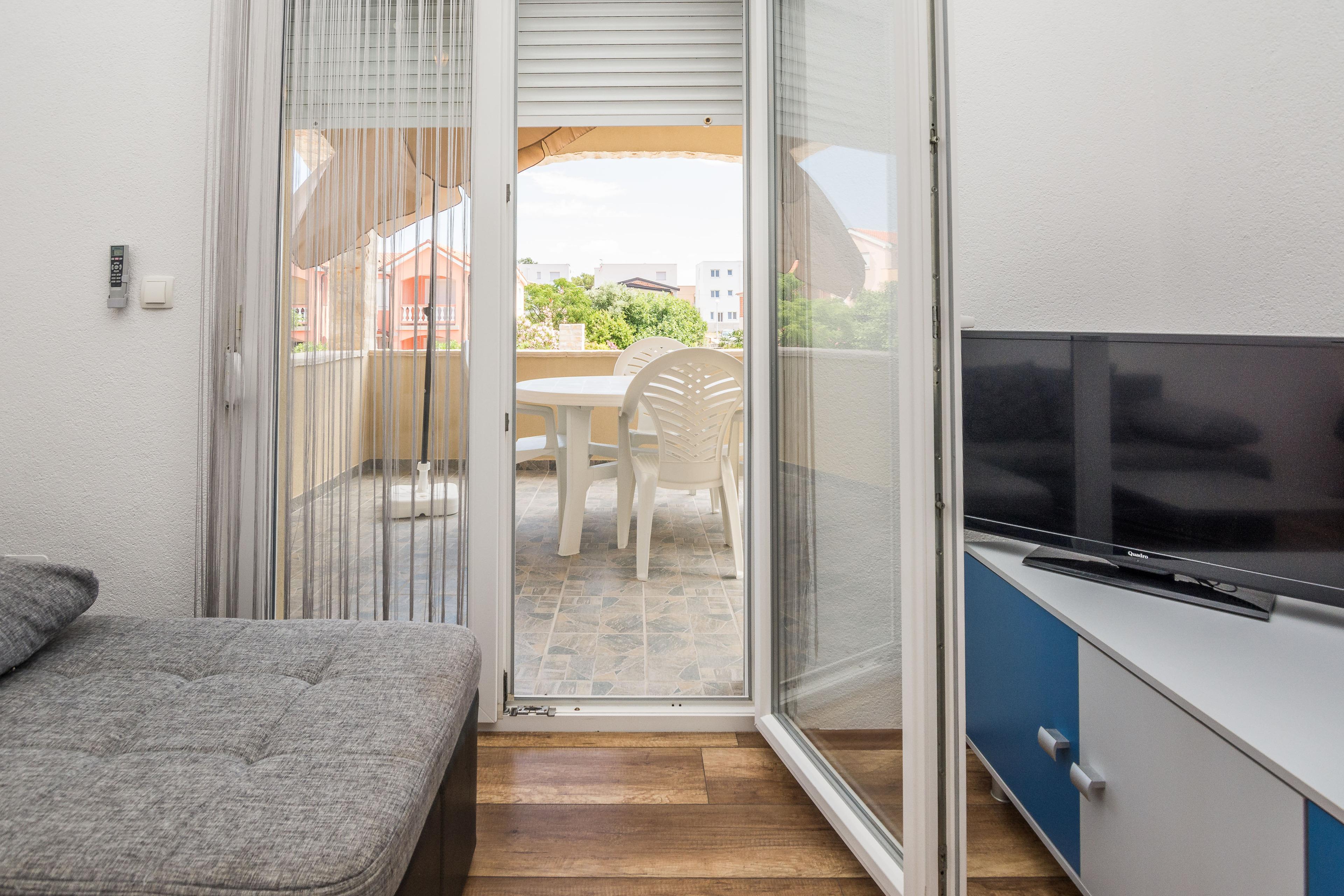 35-Quadratmeter-Wohnung für 2-4 Personen in Bobovik auf der Insel Vir. Sie verfügt über ein Schlafzimmer, ein Badezimmer, eine Küche mit Wohn- und Essbereich, sowie einen eigenen Balkon.