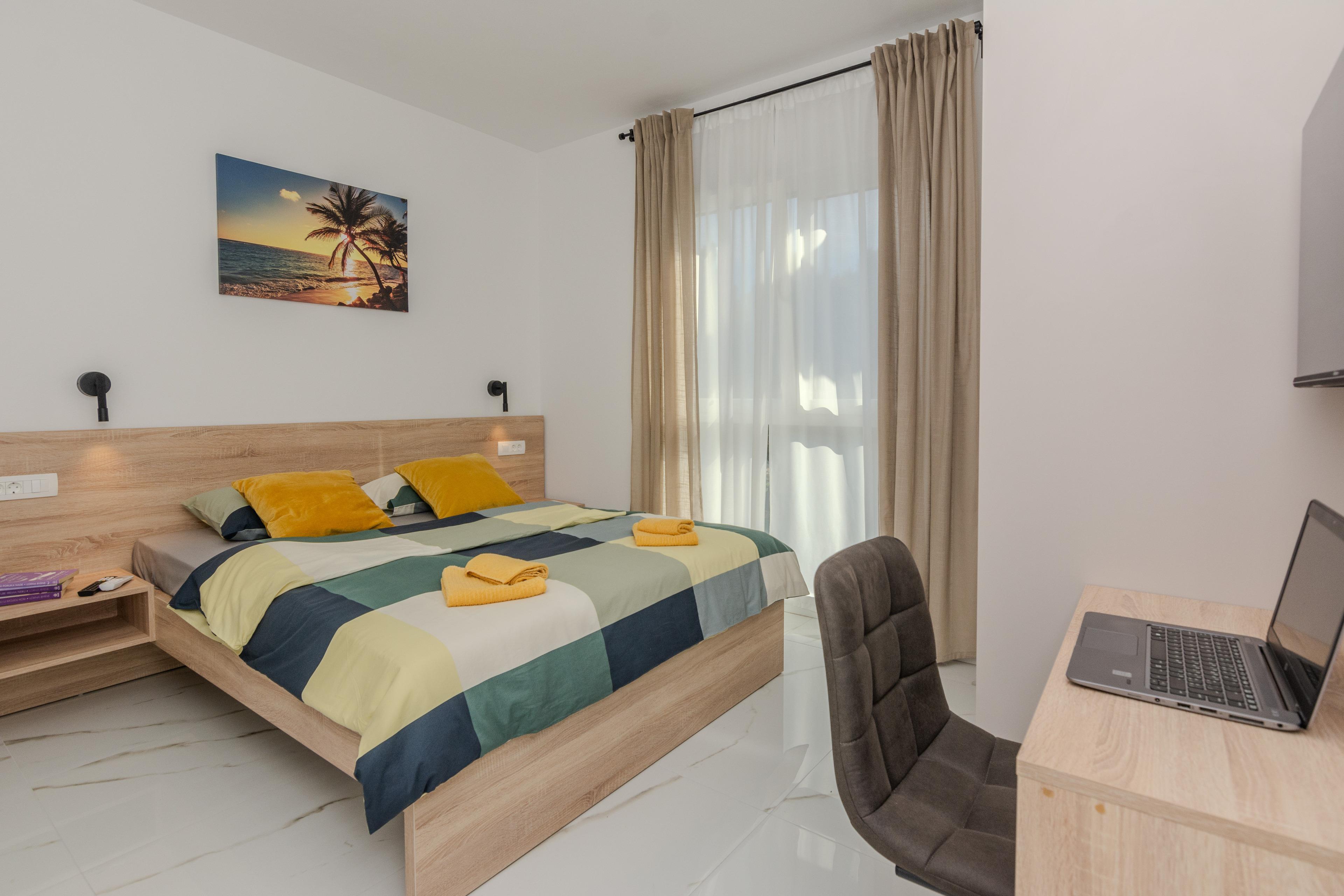 Das Apartment (56 m²) ist aufgeteilt in ein Wohnzimmer, eine voll ausgestattete Küche, zwei Schlafzimmer mit Doppelbetten und ein Badezimmer mit Dusche. Zu dem Apartment gehört ein überdachter Balkon (12 m²) mit Meerblick sowie Liegen, Tisch und Stühlen. Zu dem Apartment gehört eine gemeinschaftlich genutzte Dachterrasse mit Meerblick und Liegen.