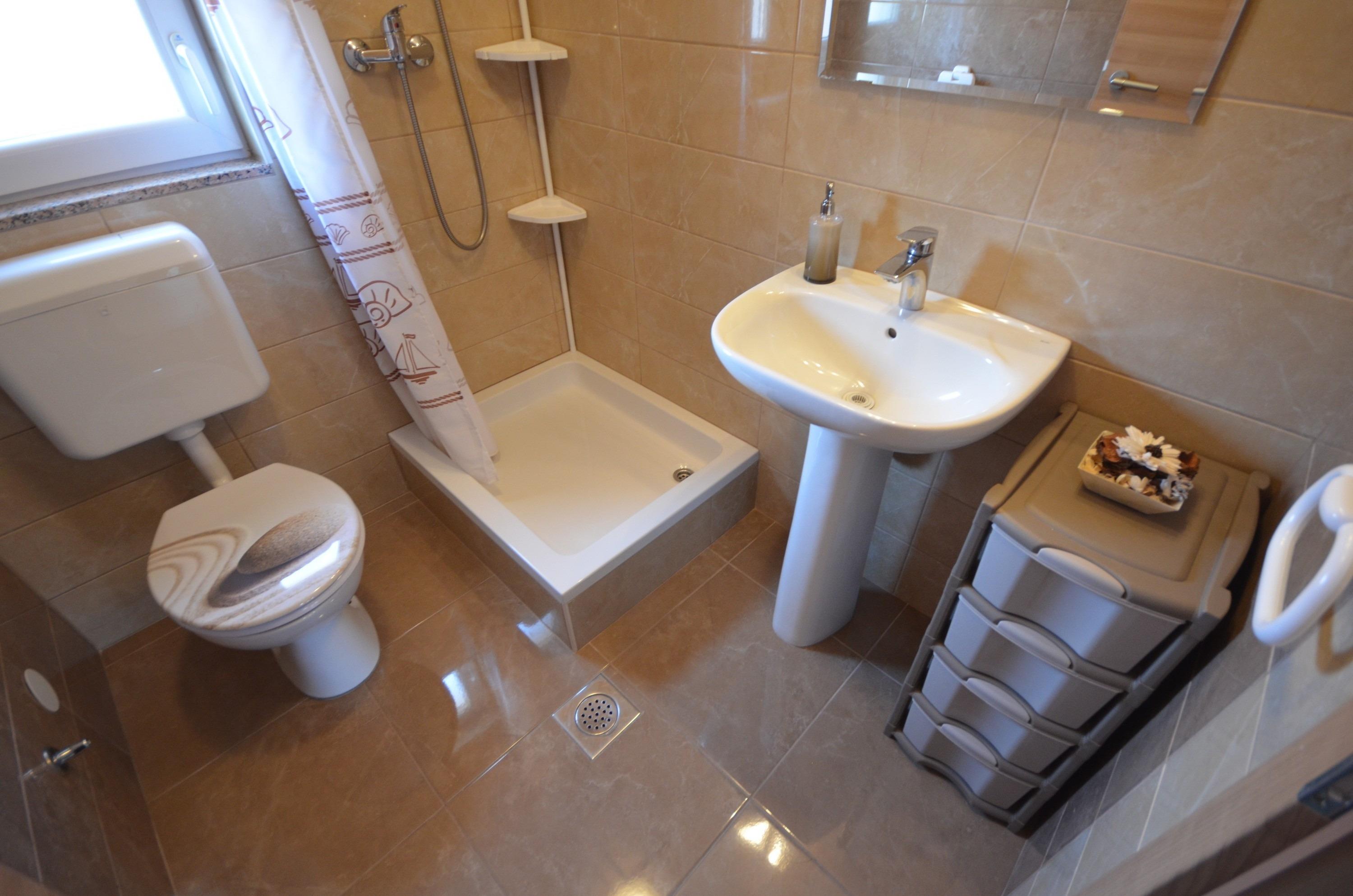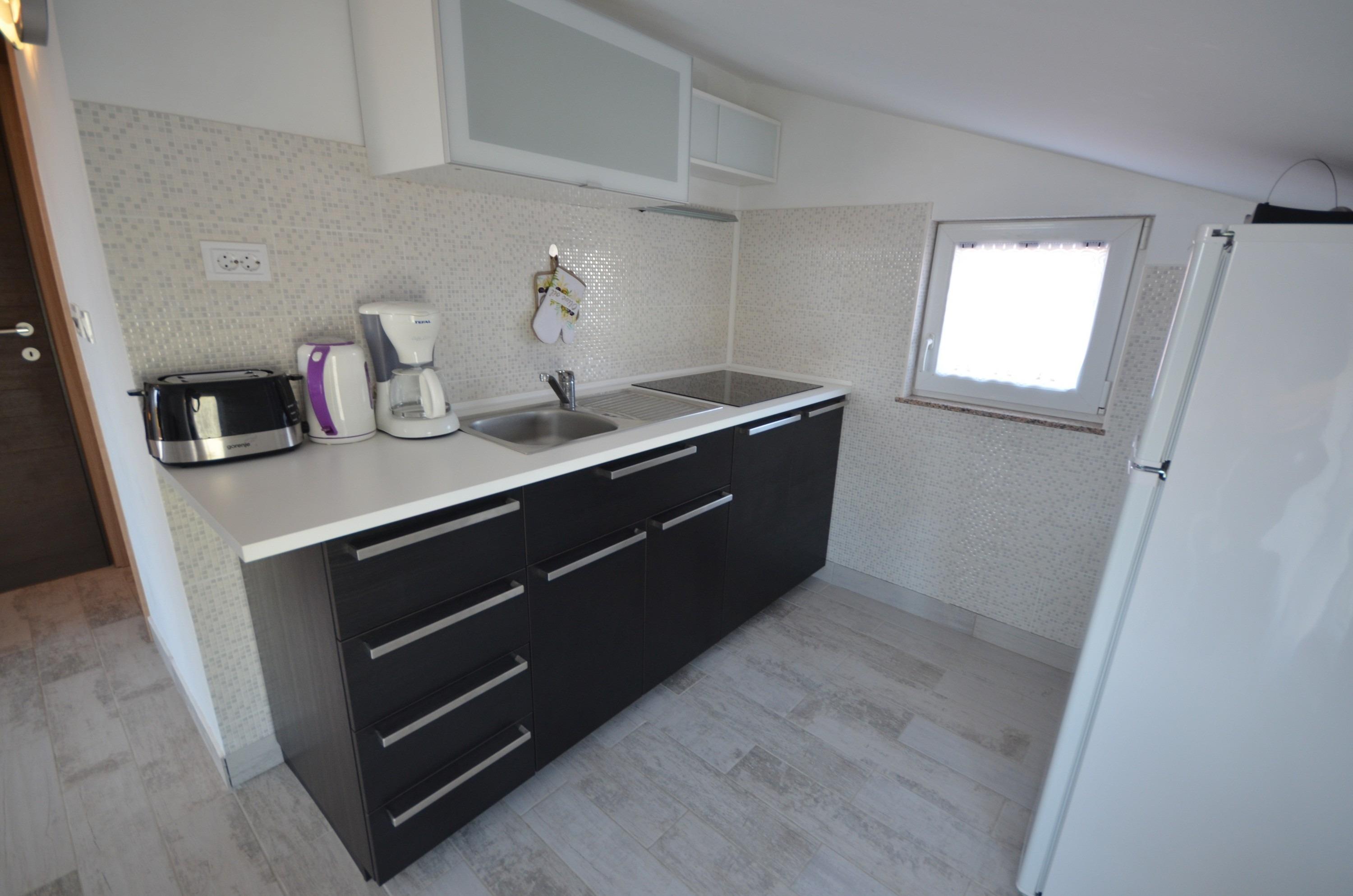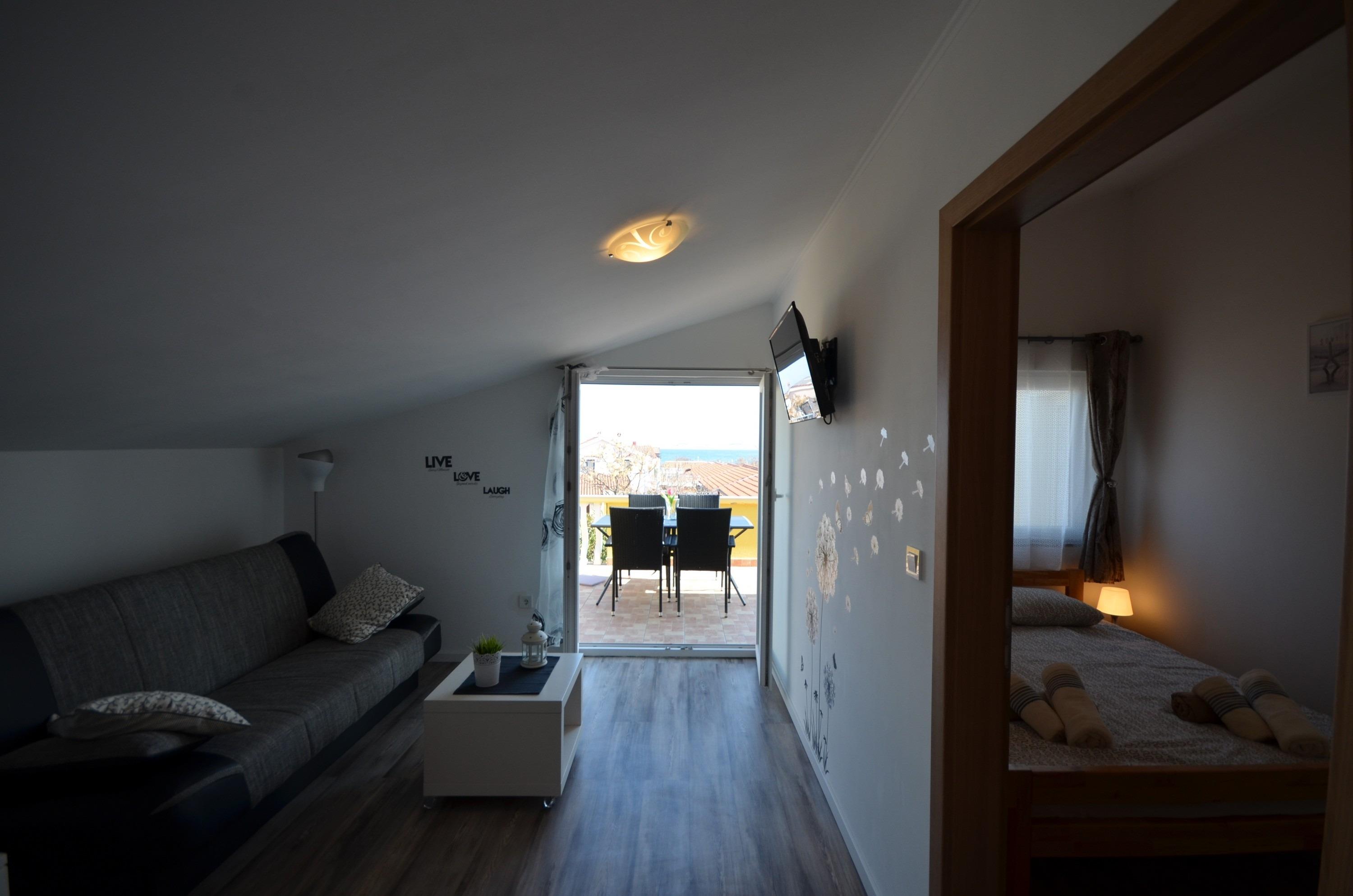 Die 32m² Wohnung im ersten Stock des Hauses teilt sich auf einem Wohn- und Essbereich und Küche, ein Schlafzimmer mit Doppelbett und Badezimmer mit Dusche. Im Wohnzimmer befindet sich ein Schlafsofa für zwei weitere Personen. Vom Wohnbereich aus gelangen Sie auf einen möblierten Balkon mit Meerblick und Panoramablick auf den Insel Pag und den Berg Velebit.