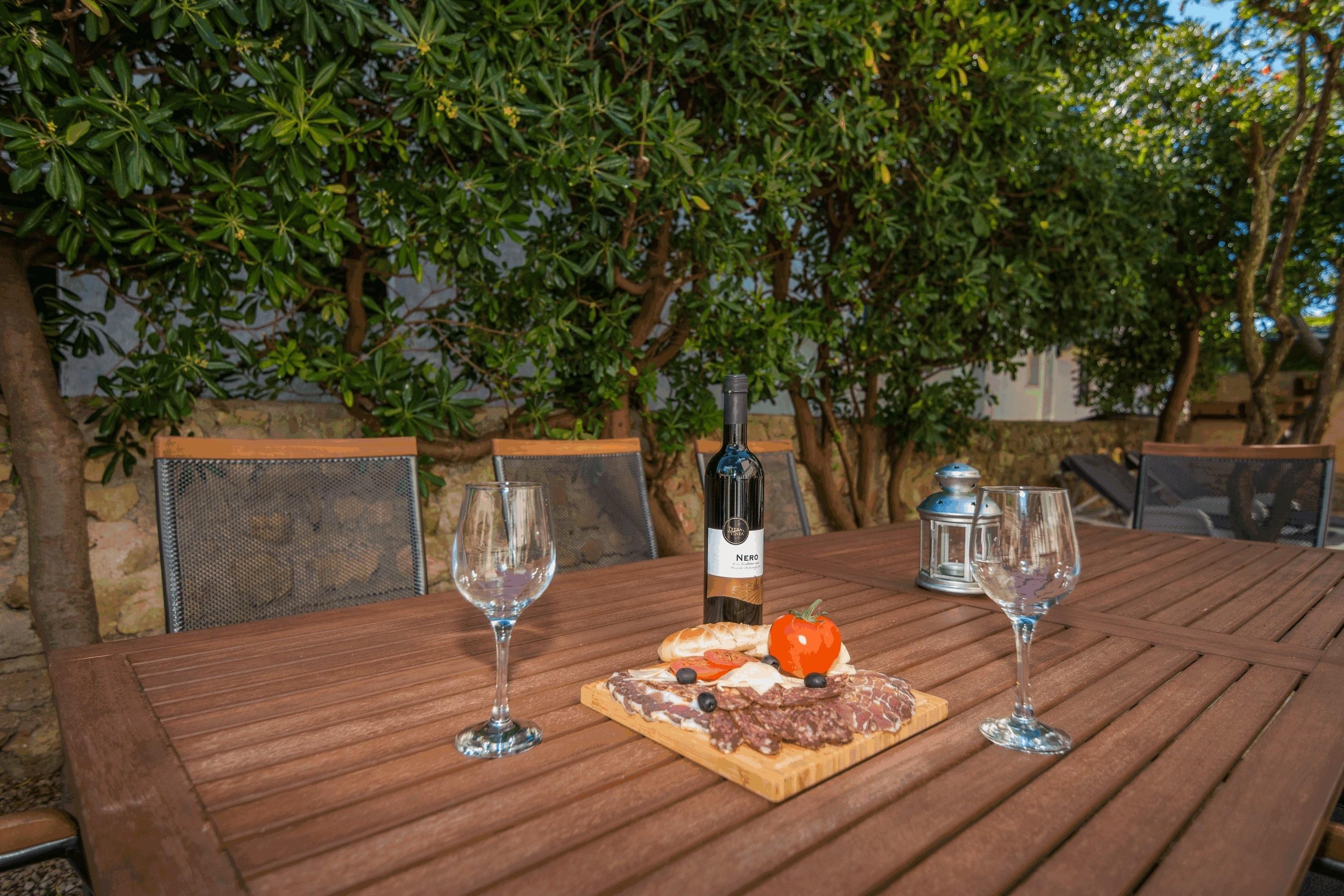 Gäste zur Verfügung stehen ebenso eine Gemeinschaftsterrasse und einen Gemeinschaftsbalkon die mit Tisch und Stühlen ausgestattet sind. Voll ausgestattete Küche, Klimaanlage, Internetzugang per WLAN, Sat-TV, Garten mit Grill, Parkplatz auf dem Grundstück zählen zu den weiteren Ausstattungsmerkmalen. Nur 250 m von der FeWo entfernt, befindet sich ein Kieselstrand mit betonierte Liegeflachen.