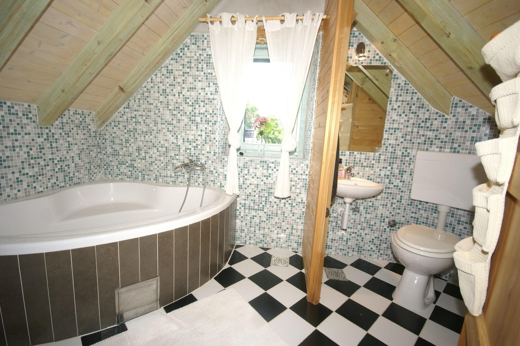 På 2. etage: (tekøkken(spisebord(4 personer), komfur(Komfur med to kogeplader, elektrisk), kaffemaskine, køleskab(+ fryser)), Stue/soveværelse(enkeltsovesofa, dobbeltseng eller 2 enkeltsenge Senge(dynebetræk), Fjernsyn(parabol, Tyske TV-kanaler), DVD-afspiller, stereoanlæg, klimaanlæg), badeværelse(badekar med bruser, håndvask, toilet)) vaskemaskine(deles med andre gæster), terrasse(deles med andre gæster, 20 m2), have(deles med andre gæster, indhegnet, oplyst, 150 m2), havemøbler, grill(deles med andre gæster), parkering, Parasol, cykler til rådighed(på anmodning)