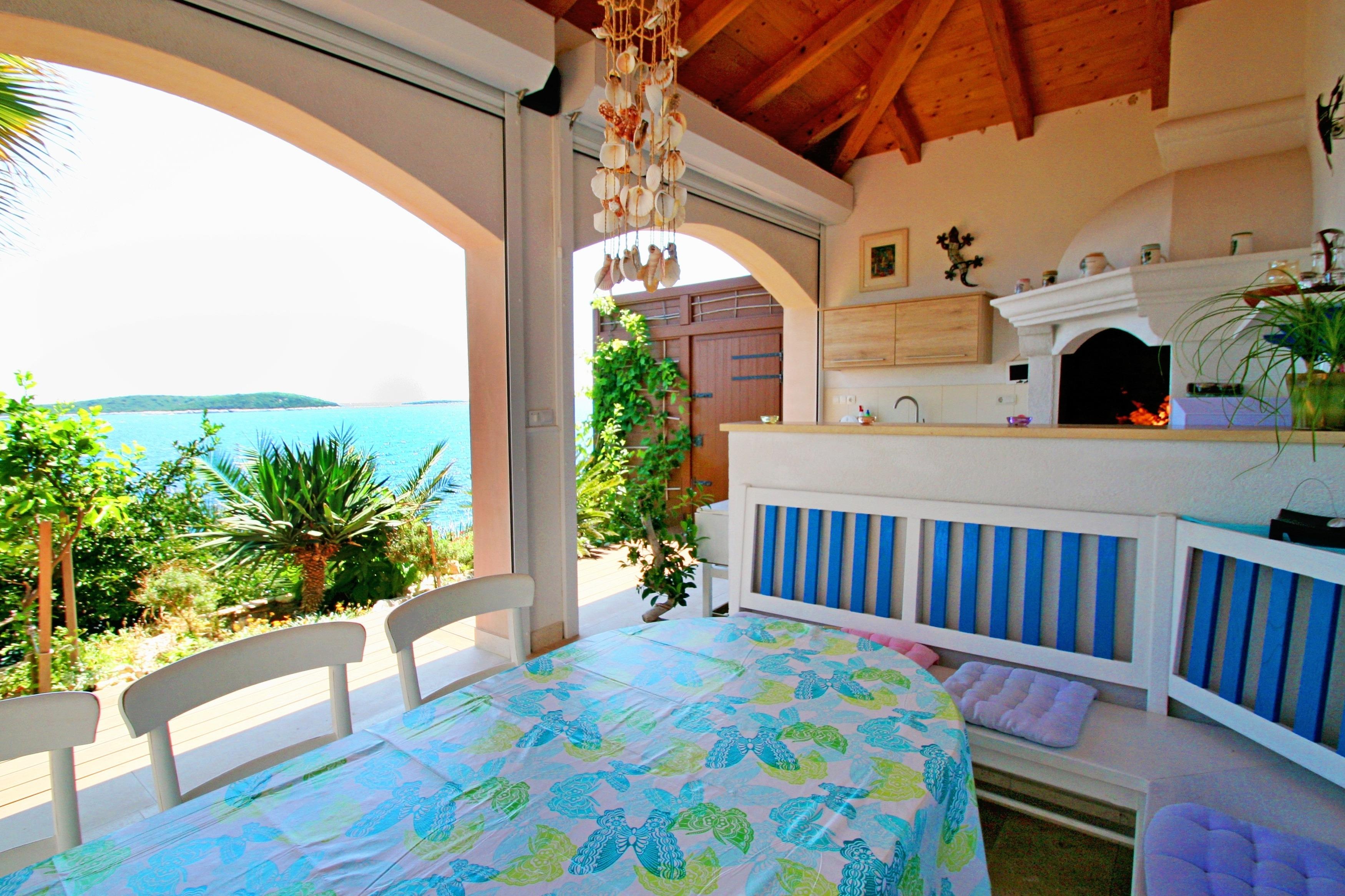 Ein Highlight der Villa SeaBreeze ist die Sommerküche mit Grill und überdachten zur Meerseite hin offenen Essbereich.
