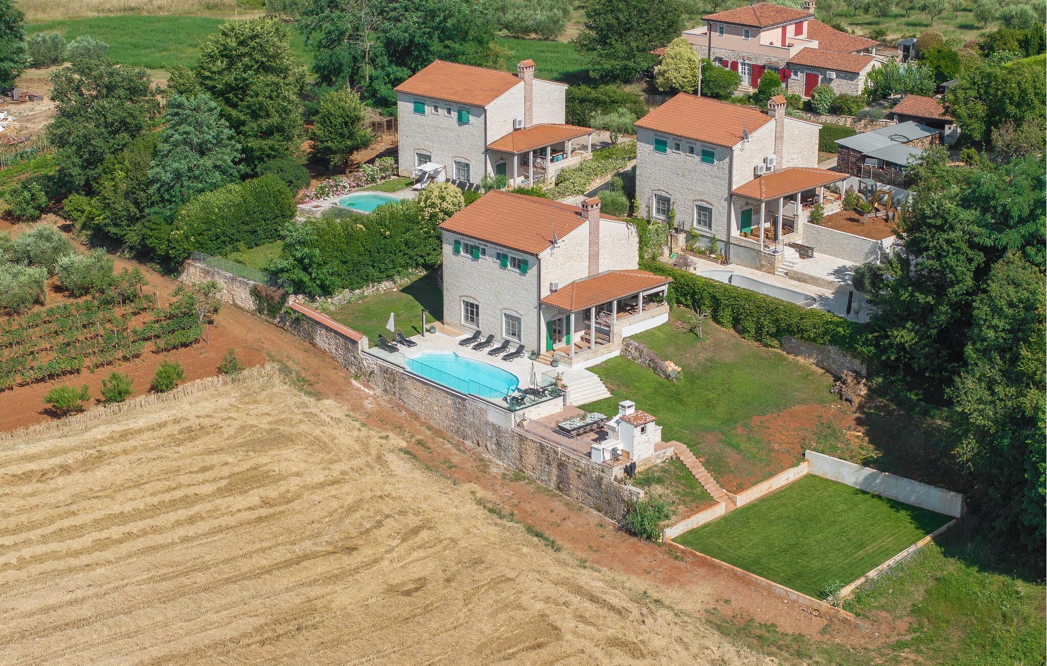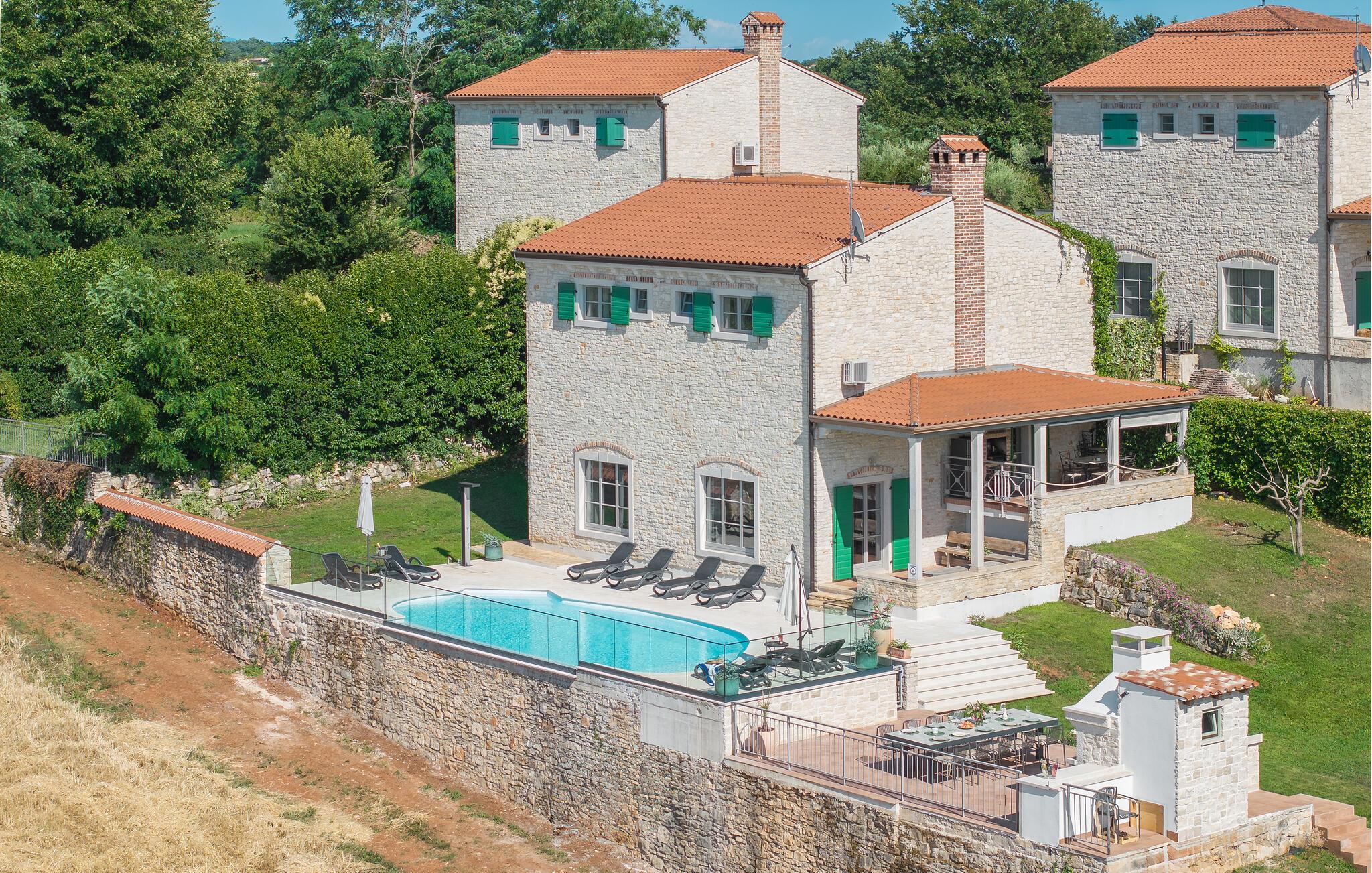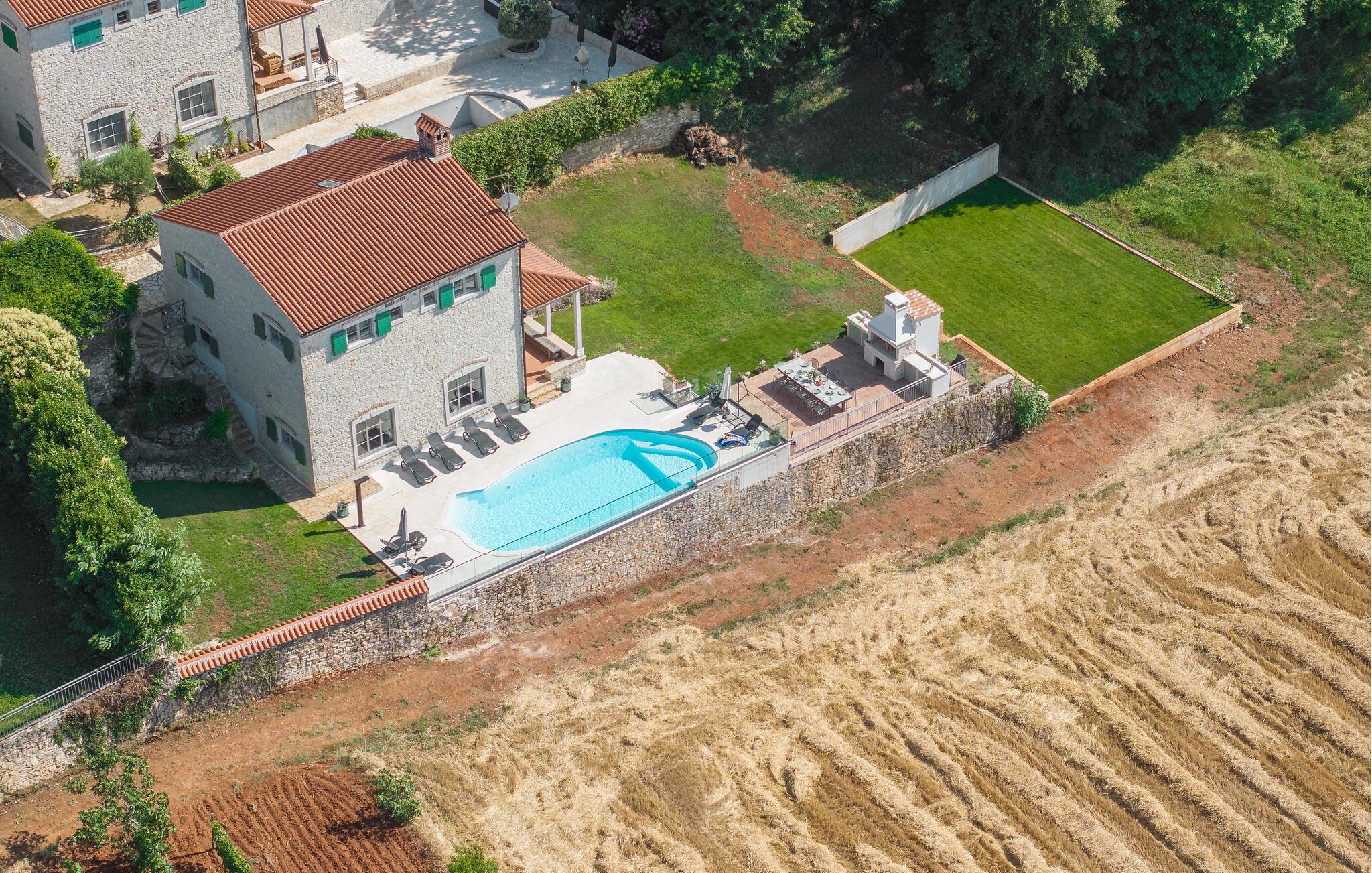 Dette rummelige og smagfulde stenhus byder dig velkommen med masser af plads og en stor swimmingpool og have. Undslip din hverdagsrutine og find noget hvile nær en skov i den lille landsby Baldasi. Det indbydende hus er lyst og komfortabelt og tilbyder dig og din udvidede familie den ideelle planløsning på flere niveauer til din afslappende ferie. Nyd det åbne rumdesign, så du kan deltage i, hvad der sker i stuen fra køkkenet og få gode samtaler. Udearealet er heller ikke på nogen måde ringere end huset. Glæd dig til den overdækkede terrasse, som er et godt sted at grille og til socialt samvær om aftenen med god mad, leg og snak. Du kan tilbringe sommerdagene med at bade og solbade i og omkring poolen og se dine børn lege og boltre sig i haven. Oplev det istriske landskab, mens du cykler eller vandrer. Du kan også besøge de omkringliggende byer på Adriaterhavskysten. En kort køretur tager dig til den smukke havneby Porec, et populært sommerferiested med en historisk gammel bydel og en berømt basilika fra det 6. århundrede. For aktive feriegæster er der talrige muligheder for vandsport ved havet, men der er også meget at opdage inde i landet. Men du kan også bare slappe af på stenstrandene og lade din sjæl dingle til lyden af havet!