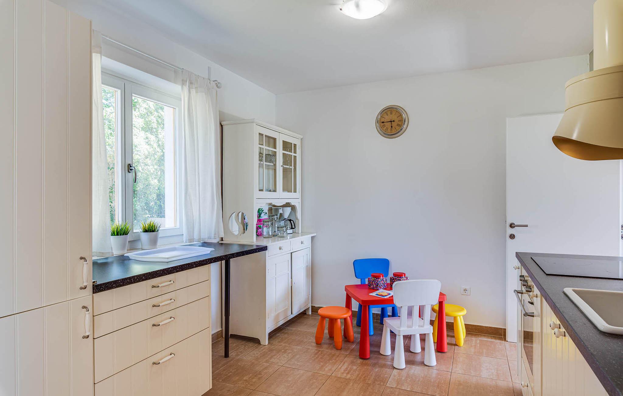 Indenfor byder huset jer velkommen med en rolig og enkel atmosfære, der er perfekt til familier eller større grupper. Opholdsområdet giver plads til samtaler, fælles hygge og afslappede filmaftener. Saml jer omkring det store spisebord, mens der bliver lavet mad i det åbne køkken, og planlæg jeres næste udflugter. Også de mindste vil føle sig godt tilpas her og kan lege både ude og inde i deres eget tempo.