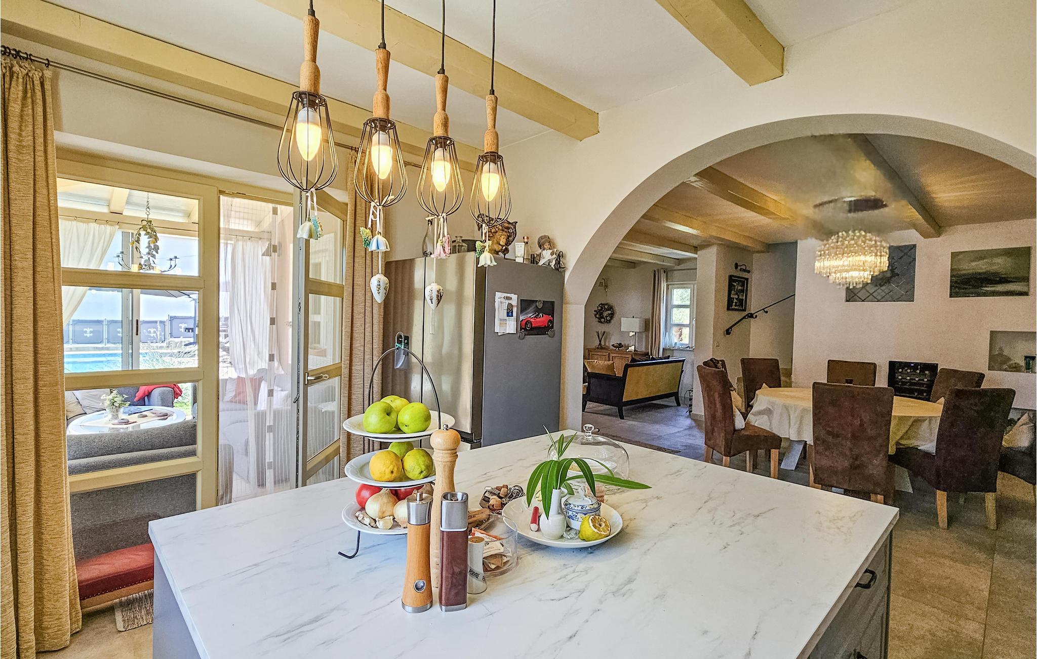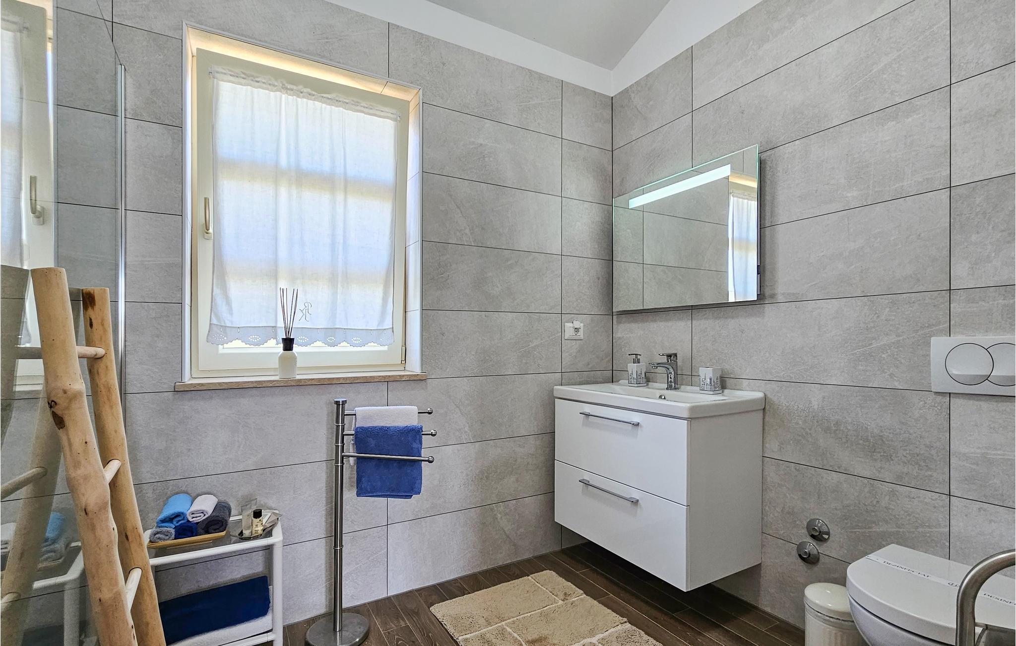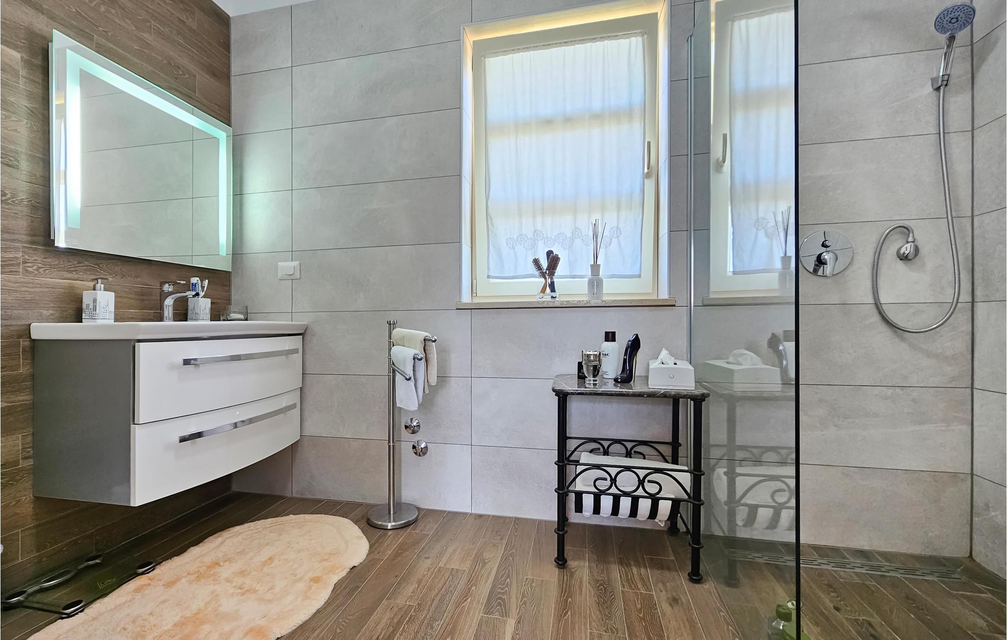 Den imponerende Villa Ginocchetti, bygget i 2018, ligger gemt væk i den istriske by Valentici, en del af Kaštelir kommune. Villaen er omgivet af smuk olivengrønt, hvilket gør din ferie ekstra afslappende. Du kan også slappe af på den stenede strand, som ligger kun 7 kilometer fra villaen. Inde i villaen er der et soveværelse i stueetagen og tre soveværelser på øverste etage, hvoraf det ene har udsigt over rækkerne af oliventræer og de to andre har udsigt til morgensolen og det krystalklare hav. De klimatiserede soveværelser har en dobbeltseng (180 x 200 cm). Hvis du tager dine små med til villaen, er en barneseng (60 x 120 cm) tilgængelig på anmodning. I stueplan er der opholdsstue med TV og køkken, som kan rumme 8 personer i spisestuen. Villaen har fire en-suite badeværelser med bruser. Villaen har også et separat toilet. Kombinationen af moderne indretning og rustik udvendig stil tilbyder dig komfort og luksus under dit ophold. I villaens gårdhave er der en swimmingpool (50 m2), hvor I kan slappe af og nyde udsigten til de smukke oliventræer, der skaber en rigtig rustik atmosfære. Også omkring poolen er der 6 liggestole og et opholdsområde, hvor du kan nyde naturen med dine kære. Der er to parkeringspladser på ejendommen ved siden af villaen og mere end tre uden for ejendommen. Villaen er fuldt indhegnet, så du kan nyde privatlivets fred i det istriske paradis. Valentici ligger nær byen Porec, som har historiske monumenter, der vil transportere dig til den kroatiske kulturarvs fortid. Også i Porec er der smukke strande med krystalklart hav, hvor du kan nyde udsigten over det mediterende åbne hav. Der er tre golfbaner inden for en radius af 20 km. Den nærmeste tennisbane ligger 8 km væk, og der er restauranter og pubber 500 m. Fra næste sæson 2023 vil villaen have en ladestation (vægboks) til elbiler (inkluderet i lejeprisen). Besøg den smukke Villa Ginocchetti med dine kære, som vil give dig hvile og afslapning i smukke Istrien! Kæledyr er tilladt på denne ejendom efter ejerens skøn eller mod et gebyr.