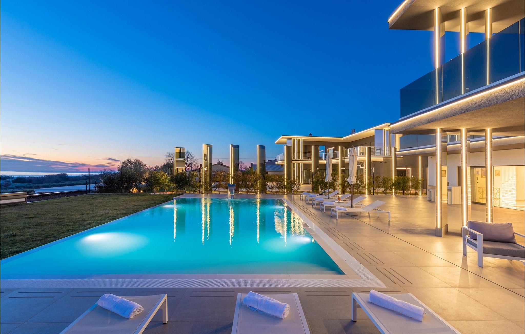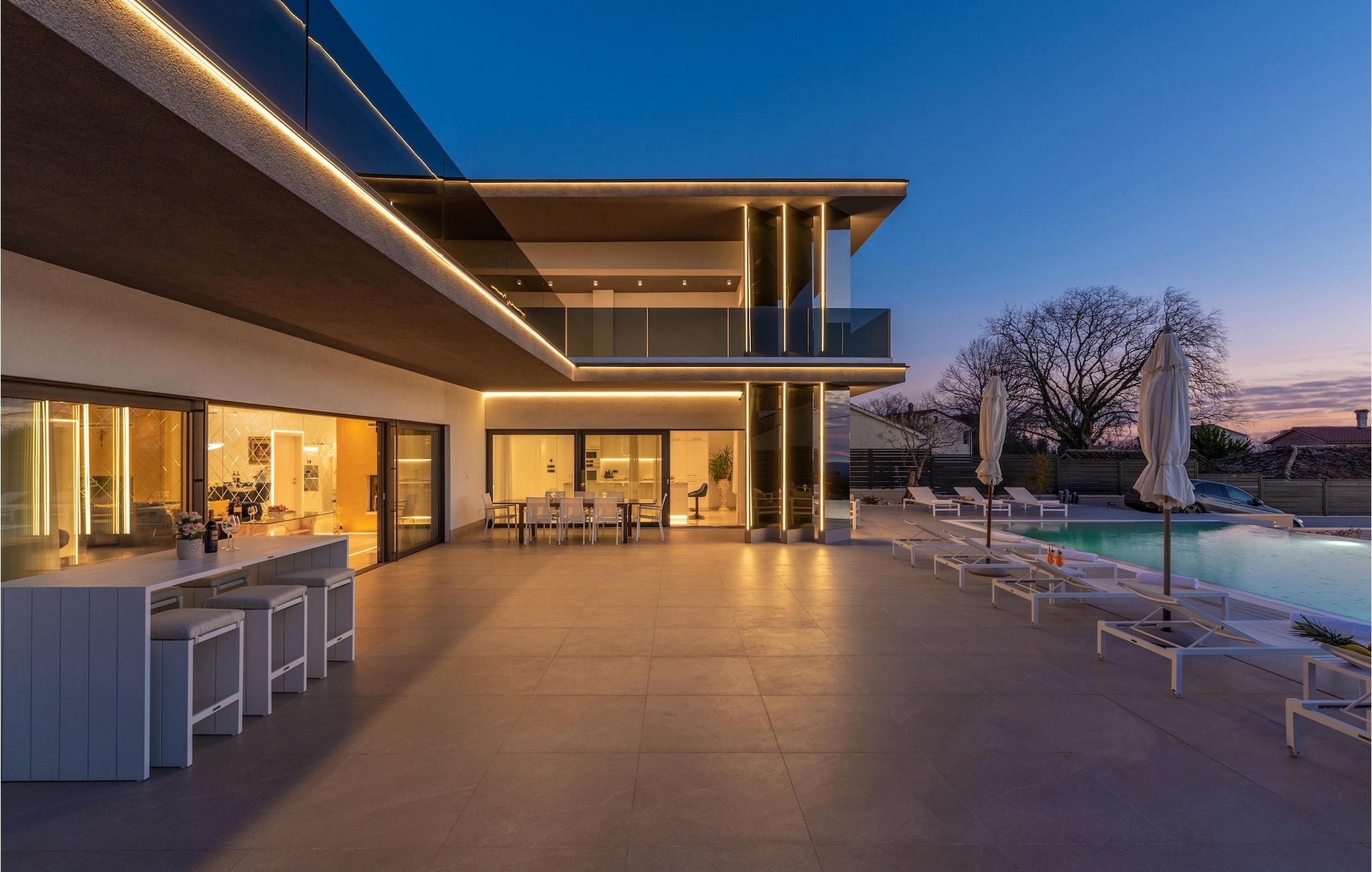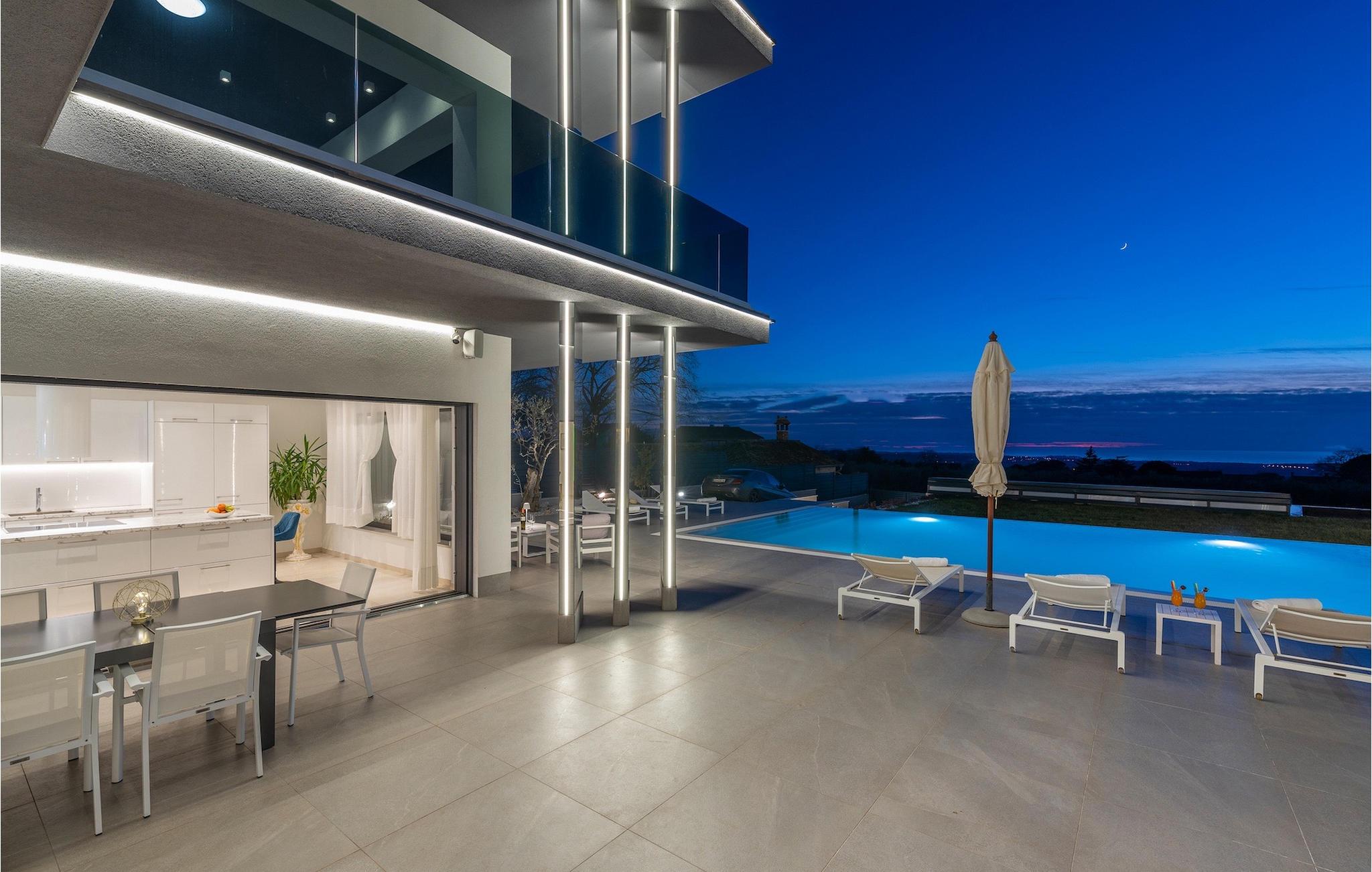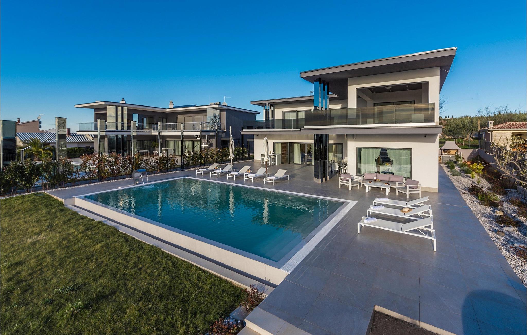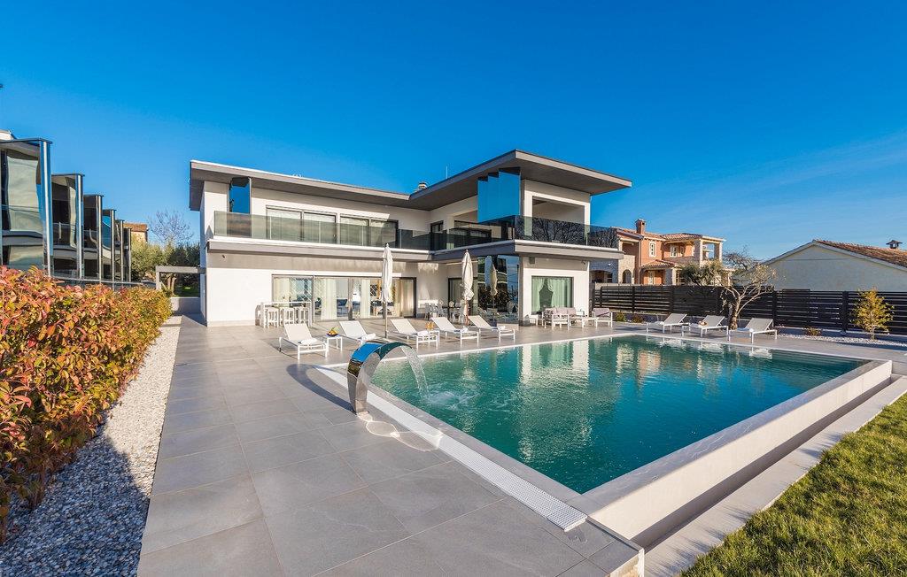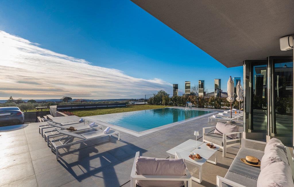 Das ist die Traumvilla, die Sie so lange gesucht haben! Die Designer-Villa Sara Kastelir nahe Porec ist der perfekte Ort für einen luxuriösen Urlaub mit Familie und Freunden! Schon das Exterieur zeugt von Stil. Ein 66m2 großer Pool ist eindeutig der Blickfang, wenn Sie das Grundstück betreten. Hier werden Sie sich an heißen Sommertagen im kühlen Nass erfrischen und die Zeit mit Ihren Liebsten genießen. Die Terrasse mit der Lounge und dem Esstisch lädt dazu ein, hier viele gemütliche Sommerabende zu verbringen. Aber auch der erste Kaffe am Morgen zu einem herrlichen Blick aufs Meer und die Landschaft wird hier zu einem ganz besonderen Erlebnis.