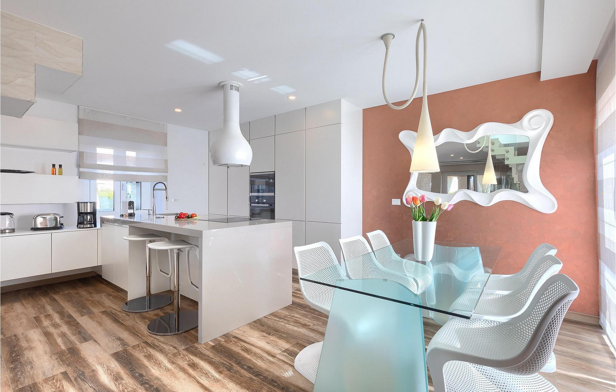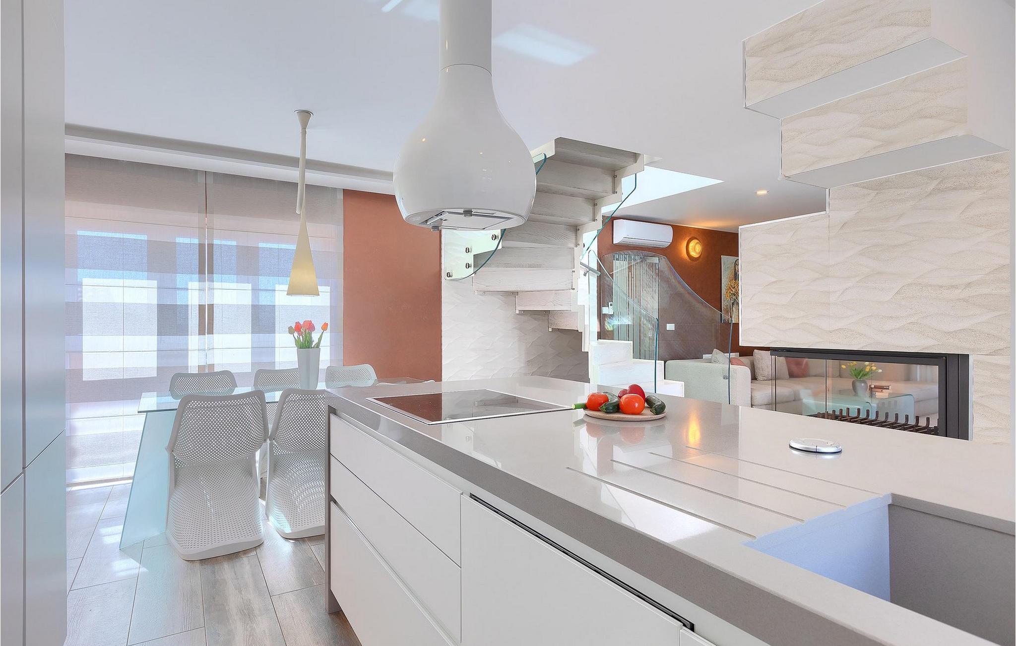 Herfra kommer du ind i moderne, lyst og fuldt klimatiseret interiør, hvor opholdsstue, spiseplads og veludstyret køkken er i ét plan med gæstetoilet og vaskeri. På øverste etage vil du tilbringe afslappende nætter i 3 komfortable soveværelser, som også omfatter 2 badeværelser med bruser. To soveværelser har komfortable dobbeltsenge, børneværelset har to enkeltsenge og en ekstra udtræksseng.