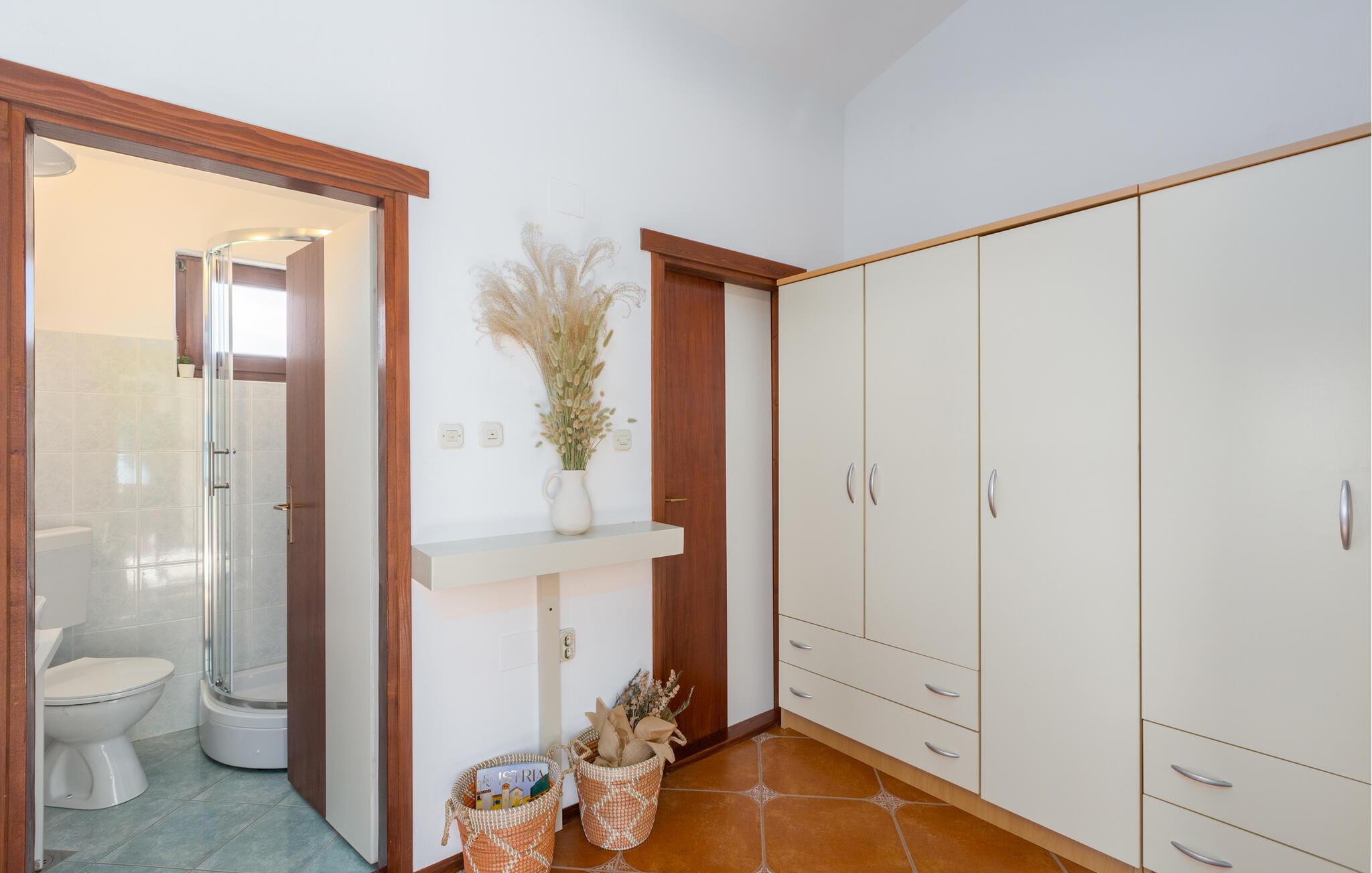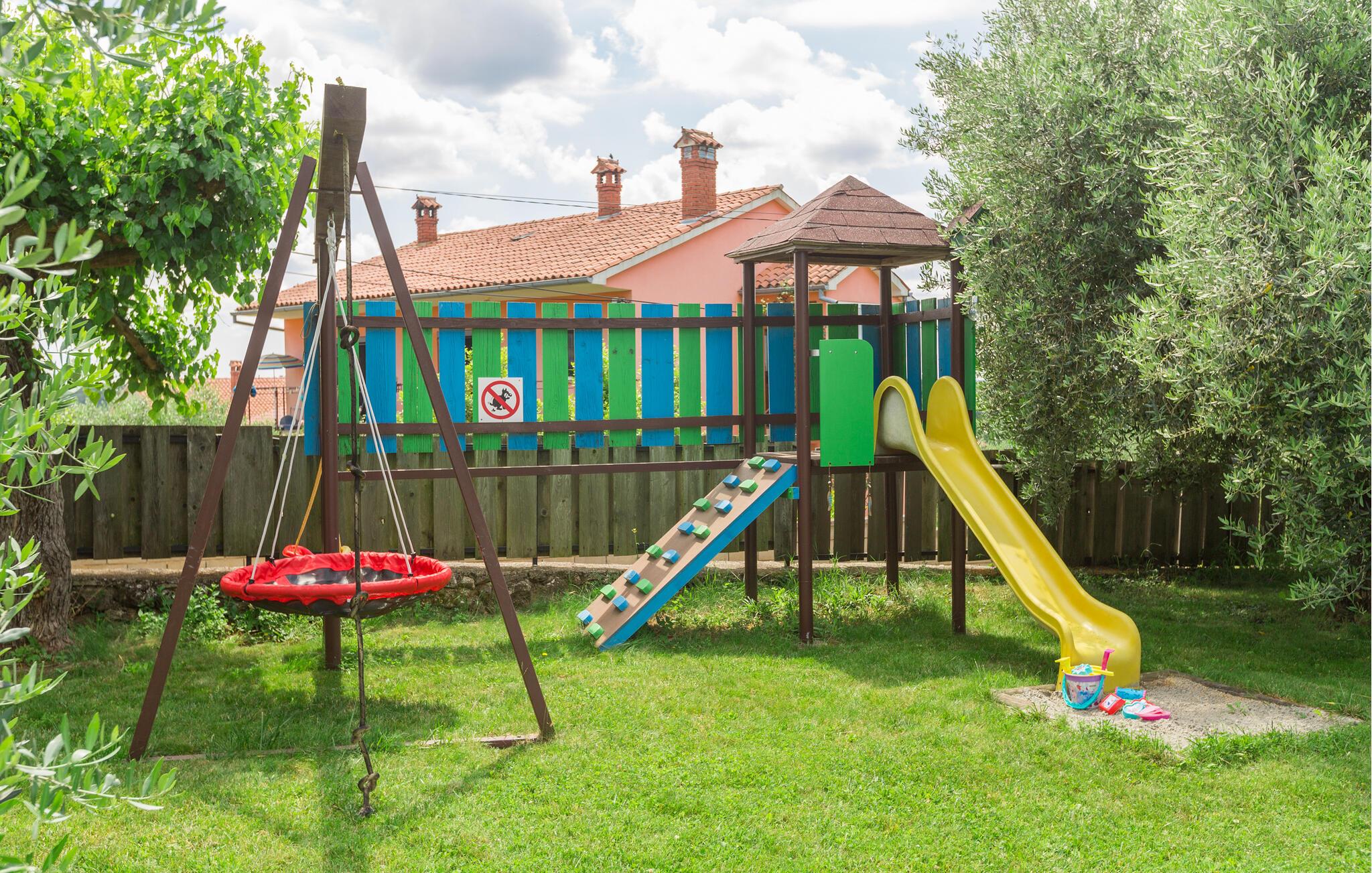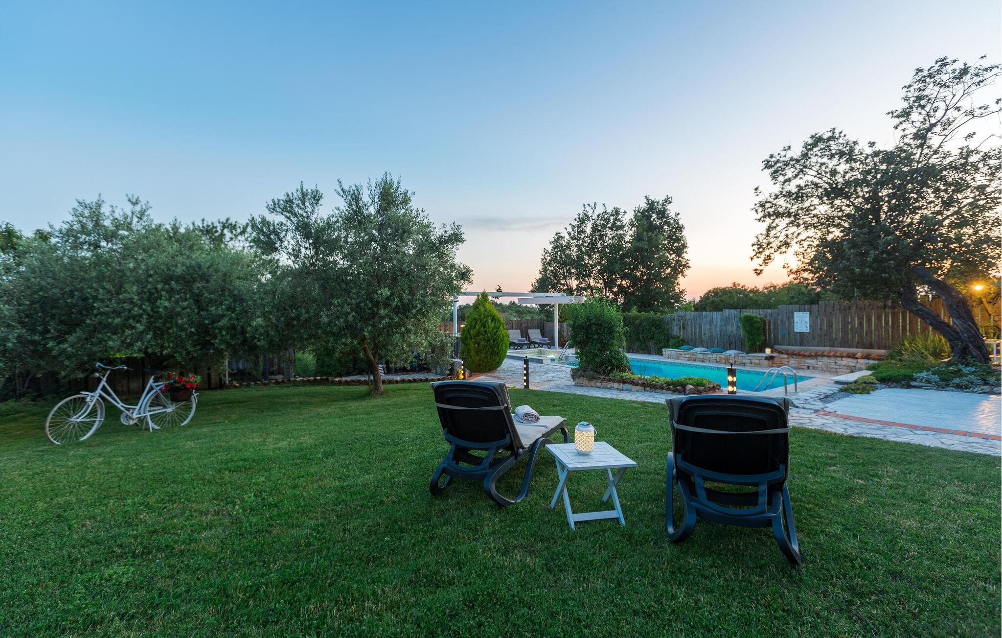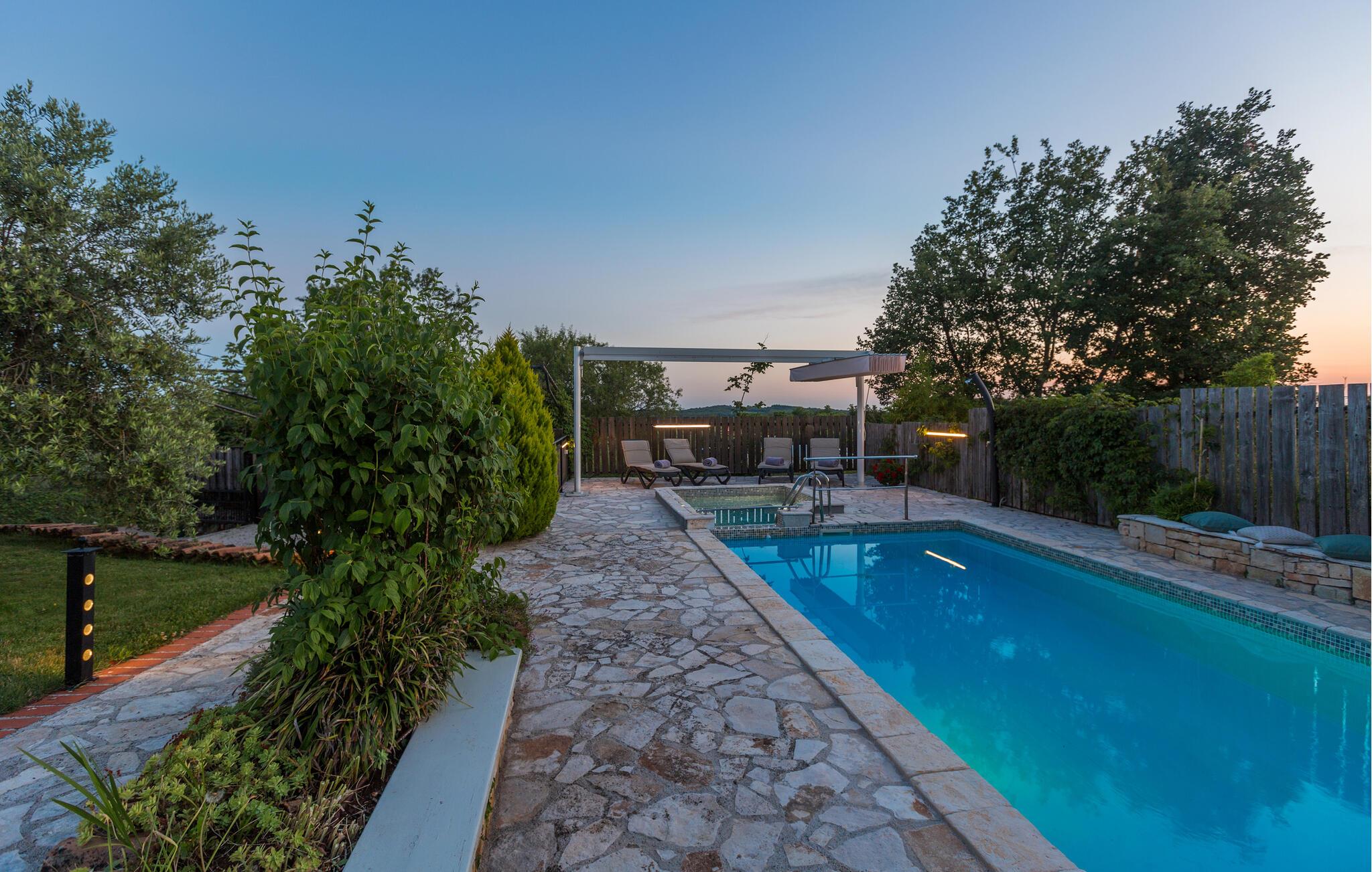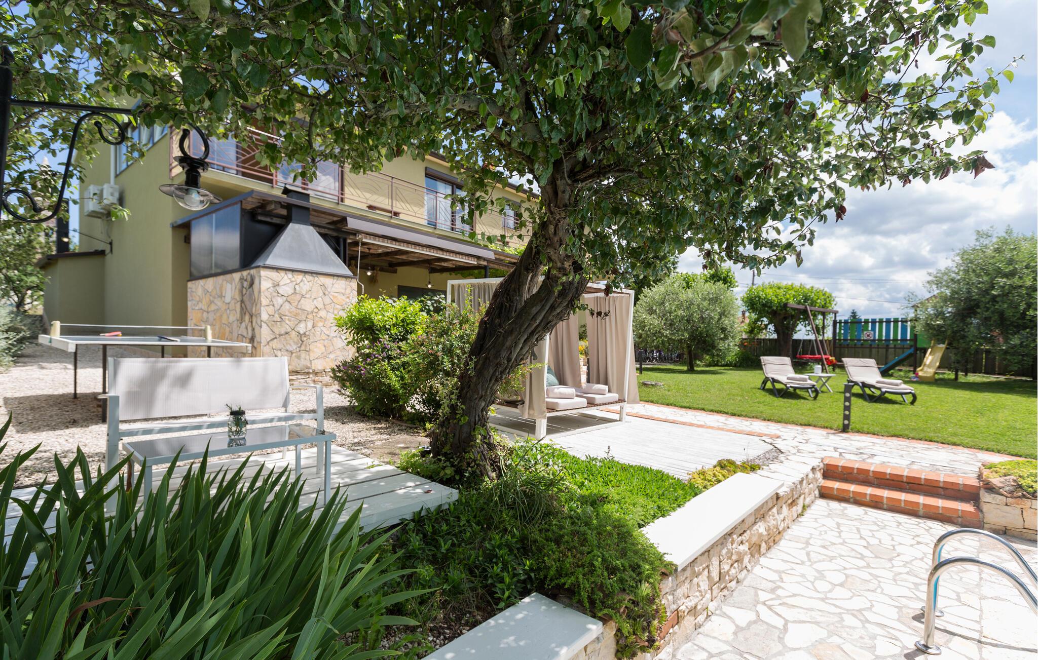 Dette charmerende feriehus med 4 soveværelser tilbyder privatliv og en flot udsigt til afslappende familieferier. Fra ejendommen kan du hvile dig, mens du nyder den fjerne havudsigt, Alperne i Italien og Ucka-bjerget. Haven er velholdt, og interiøret er pænt dekoreret med opmærksomhed på den traditionelle istriske arv. I stueetagen, ved siden af poolområdet, er et sommerkøkken med et stort spisebord. For yngre gæster er der en sandkasse med legetøj for at holde dem glade. På øverste etage (for at komme ind via en udvendig trappe) finder du stuen, som er hyggelig, rummelig og forbundet med køkken og spiseplads. Der er i alt 4 soveværelser, også placeret på øverste etage - hvoraf det ene har en dobbelt king-size seng, to har 2 enkeltsenge hver og et har en sovesofa, der giver ekstra sovemulighed for 2 gæster. Det store soveværelse har udgang til overdækket terrasse, og der er i alt to badeværelser og to ekstra toiletter på ejendommen. Et af badeværelserne har jacuzzi, hvor du kan slappe af. Ejendommen er veludstyret og har aircondition, en højhastigheds-internetforbindelse er gratis tilgængelig for gæster. På ejendommen er der cykler til din rådighed - den bedste måde at udforske omgivelserne på, og de er selvfølgelig også gratis. Omkring 3 kilometer fra ejendommen passerer den såkaldte 'Parenzana' - den første istriske jernbane, som forbandt Trieste med Porec. Denne jernbane blev for nylig omdannet til en cykelsti. For dem, der elsker mountainbike eller gåture, er det det ideelle sted. Denne ejendom er beliggende i en fredelig beliggenhed i en lille istrisk landsby kaldet Ritosin Brig. Denne lille og charmerende landsby tilbyder privatlivets fred for perfekte familieferier såvel som denne indhegnede ejendom. På den anden side er Villa Vital kun 15-20 minutter væk fra Porec - det største turistområde i Istrien. Hvis du leder efter aktivitet, bemærkelsesværdige oplevelser og rig kulturarv, er Porec med sine 100 års erfaring inden for gæstfrihed og turisme stedet for dig.