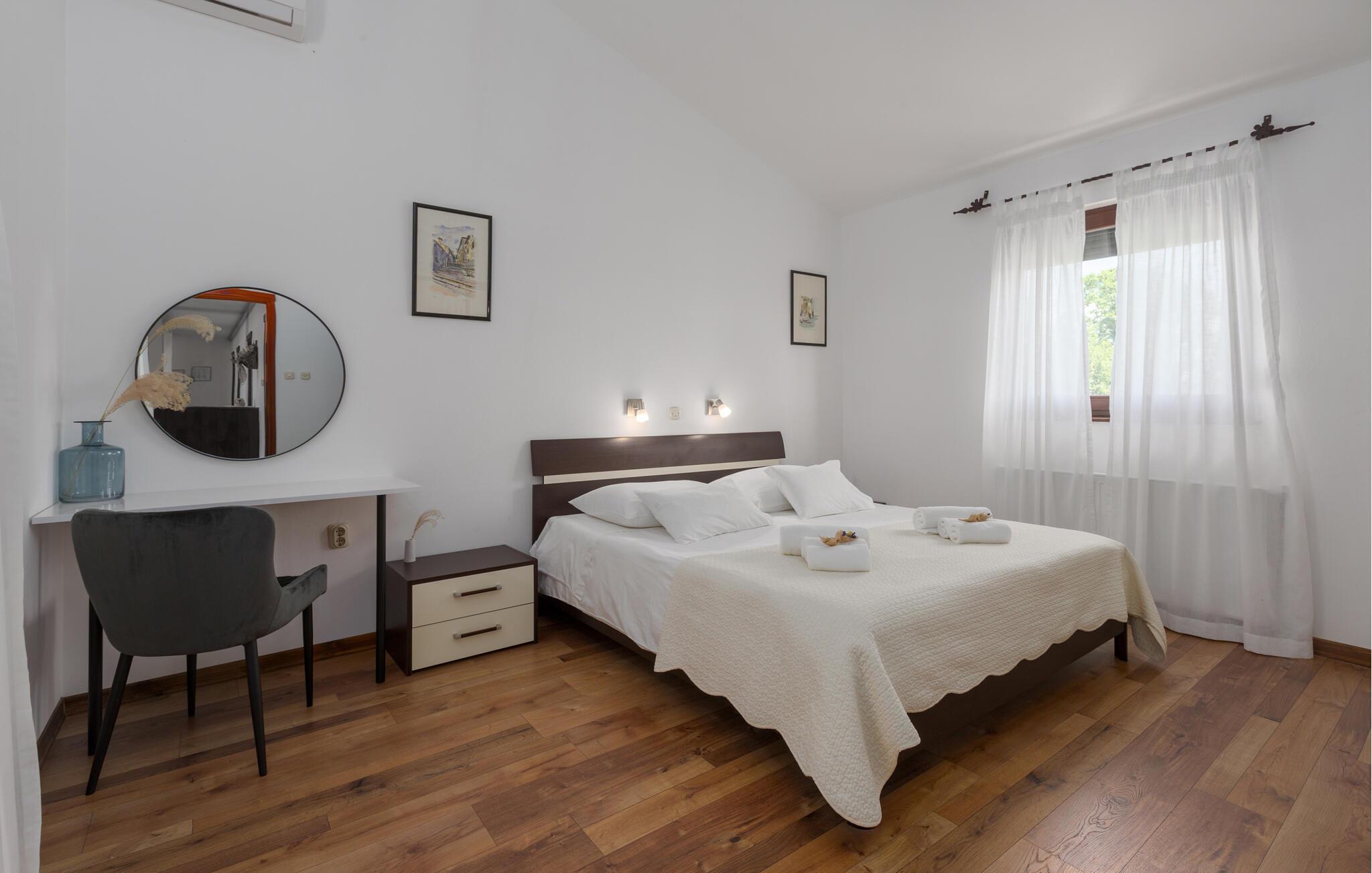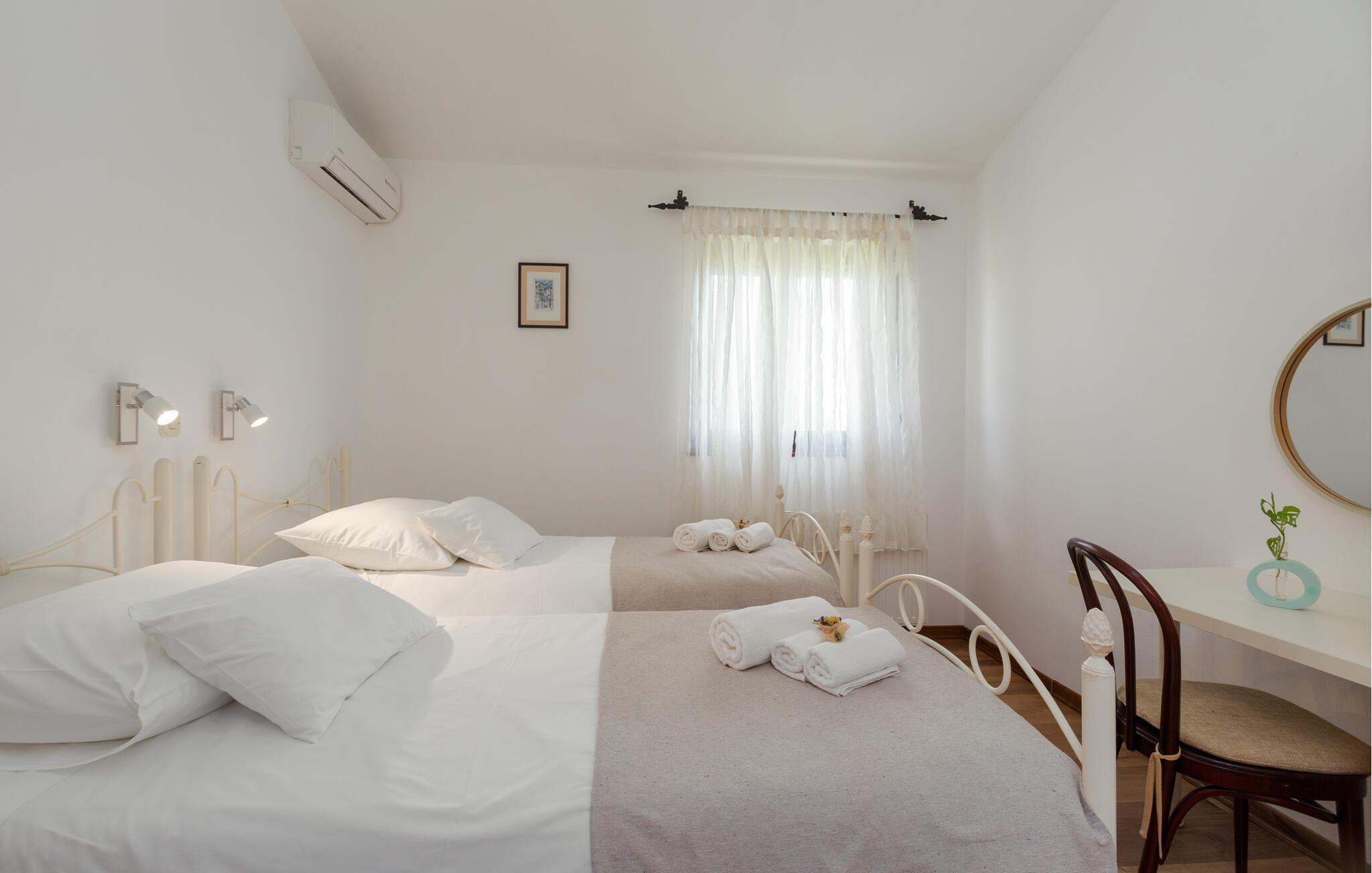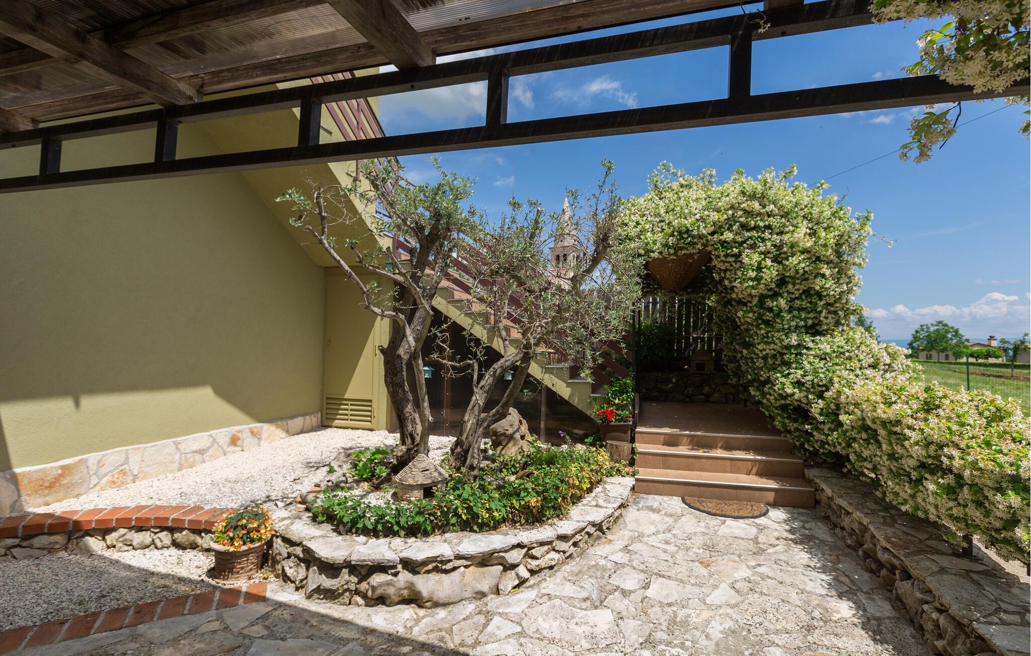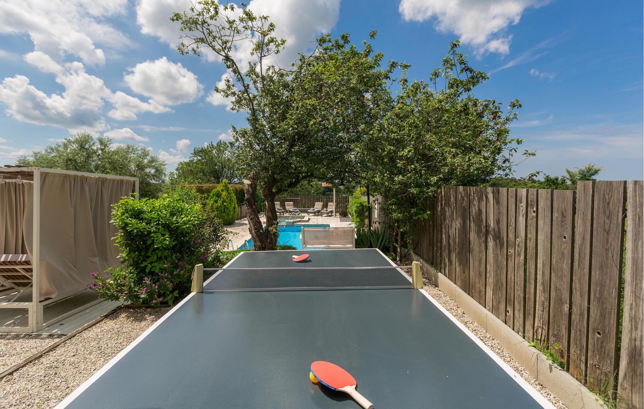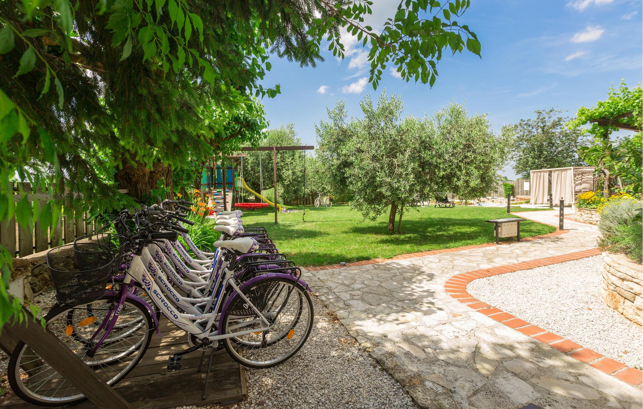 Dette charmerende feriehus med 4 soveværelser tilbyder privatliv og en flot udsigt til afslappende familieferier. Fra ejendommen kan du hvile dig, mens du nyder den fjerne havudsigt, Alperne i Italien og Ucka-bjerget. Haven er velholdt, og interiøret er pænt dekoreret med opmærksomhed på den traditionelle istriske arv. I stueetagen, ved siden af poolområdet, er et sommerkøkken med et stort spisebord. For yngre gæster er der en sandkasse med legetøj for at holde dem glade. På øverste etage (for at komme ind via en udvendig trappe) finder du stuen, som er hyggelig, rummelig og forbundet med køkken og spiseplads. Der er i alt 4 soveværelser, også placeret på øverste etage - hvoraf det ene har en dobbelt king-size seng, to har 2 enkeltsenge hver og et har en sovesofa, der giver ekstra sovemulighed for 2 gæster. Det store soveværelse har udgang til overdækket terrasse, og der er i alt to badeværelser og to ekstra toiletter på ejendommen. Et af badeværelserne har jacuzzi, hvor du kan slappe af. Ejendommen er veludstyret og har aircondition, en højhastigheds-internetforbindelse er gratis tilgængelig for gæster. På ejendommen er der cykler til din rådighed - den bedste måde at udforske omgivelserne på, og de er selvfølgelig også gratis. Omkring 3 kilometer fra ejendommen passerer den såkaldte 'Parenzana' - den første istriske jernbane, som forbandt Trieste med Porec. Denne jernbane blev for nylig omdannet til en cykelsti. For dem, der elsker mountainbike eller gåture, er det det ideelle sted. Denne ejendom er beliggende i en fredelig beliggenhed i en lille istrisk landsby kaldet Ritosin Brig. Denne lille og charmerende landsby tilbyder privatlivets fred for perfekte familieferier såvel som denne indhegnede ejendom. På den anden side er Villa Vital kun 15-20 minutter væk fra Porec - det største turistområde i Istrien. Hvis du leder efter aktivitet, bemærkelsesværdige oplevelser og rig kulturarv, er Porec med sine 100 års erfaring inden for gæstfrihed og turisme stedet for dig.