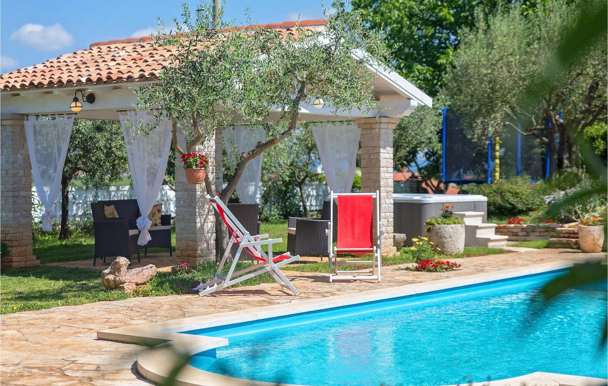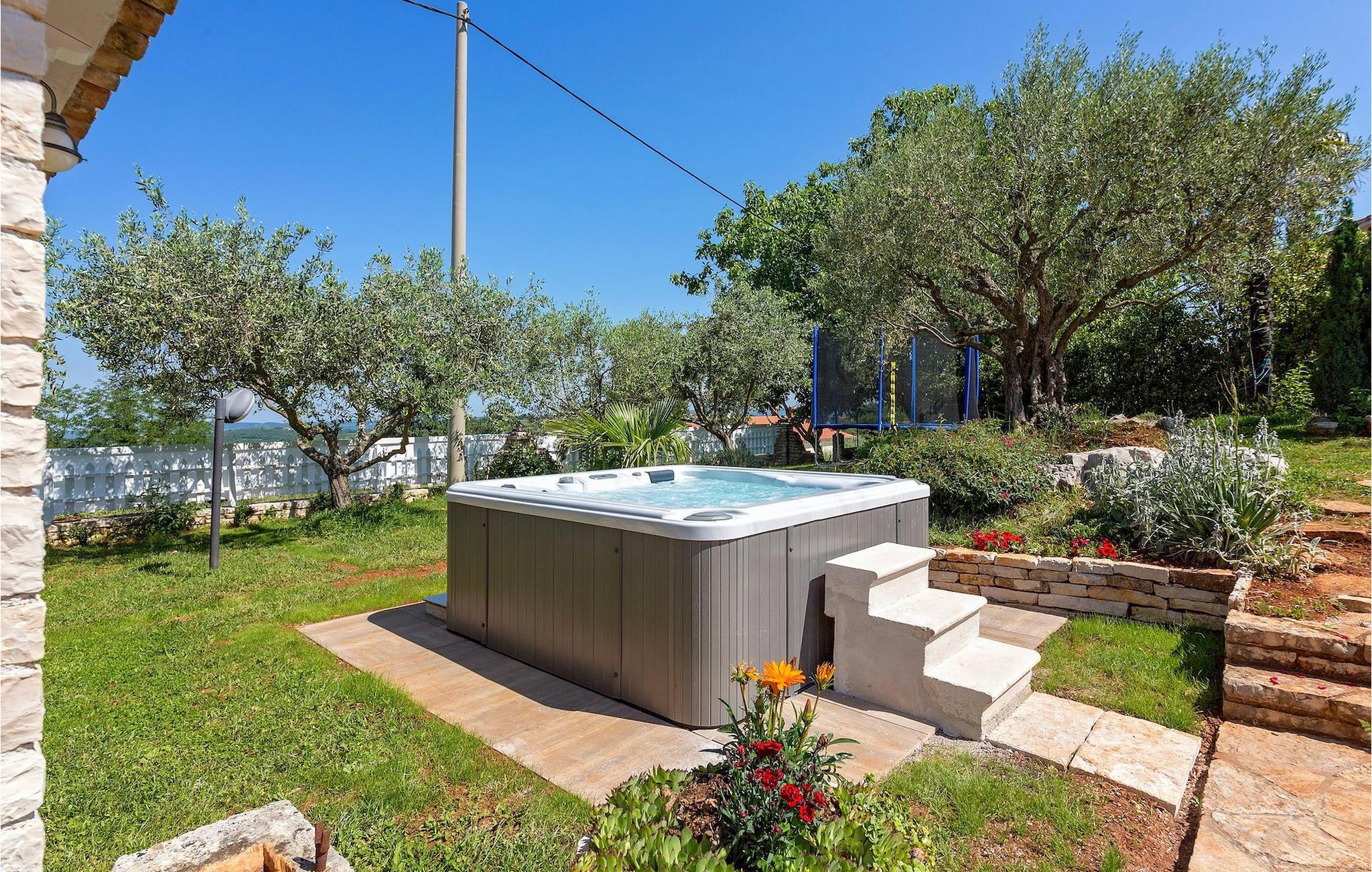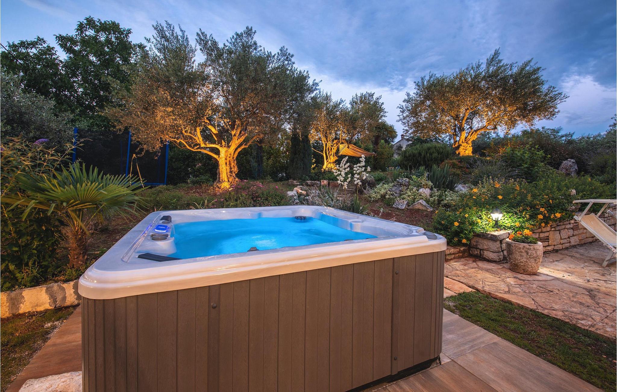 Den omhyggeligt plejede have med pool er absolut et af de største aktiver i denne villa. Dens store terrasse er det perfekte sted at nyde det istriske klima, slappe af i den indbydende udendørs jacuzzi, læse en bog og bare nyde din velfortjente ferie.