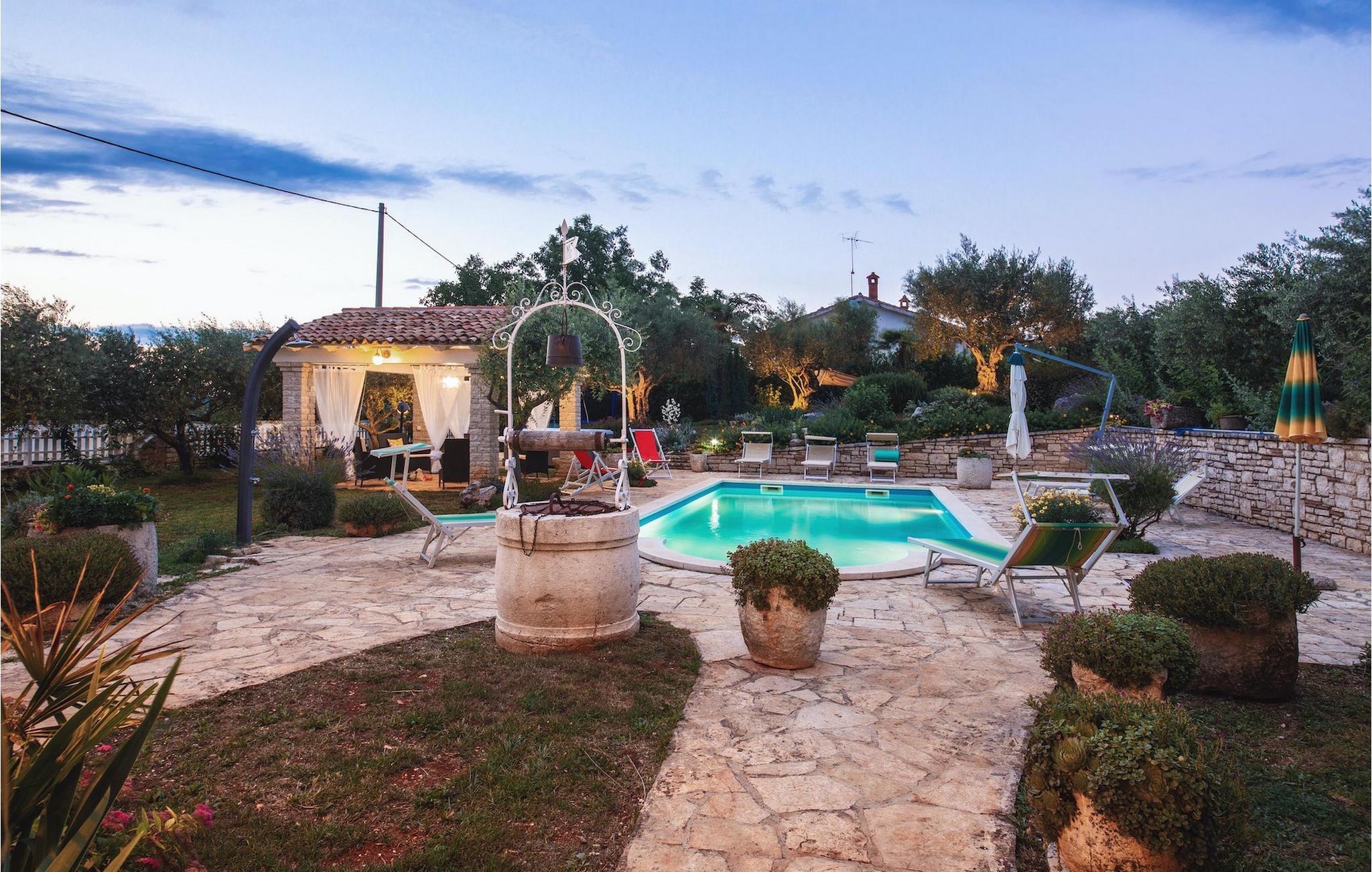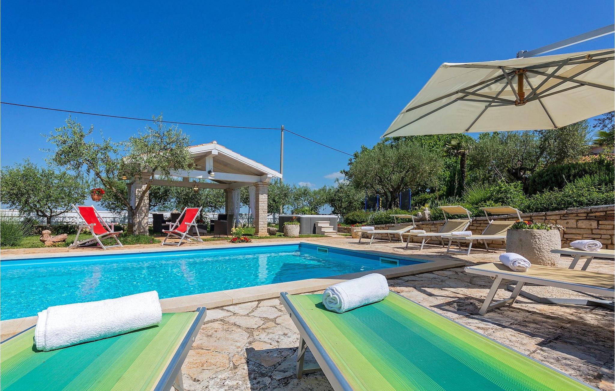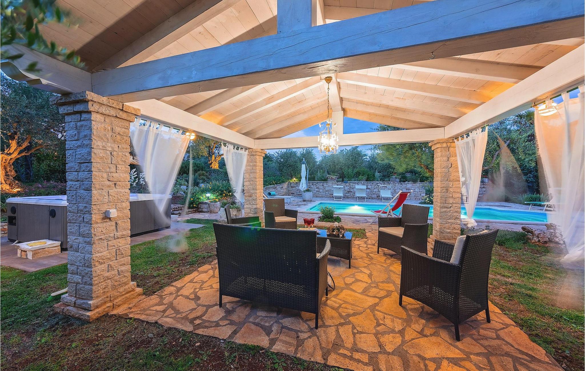 Den omhyggeligt plejede have med pool er absolut et af de største aktiver i denne villa. Dens store terrasse er det perfekte sted at nyde det istriske klima, slappe af i den indbydende udendørs jacuzzi, læse en bog og bare nyde din velfortjente ferie.