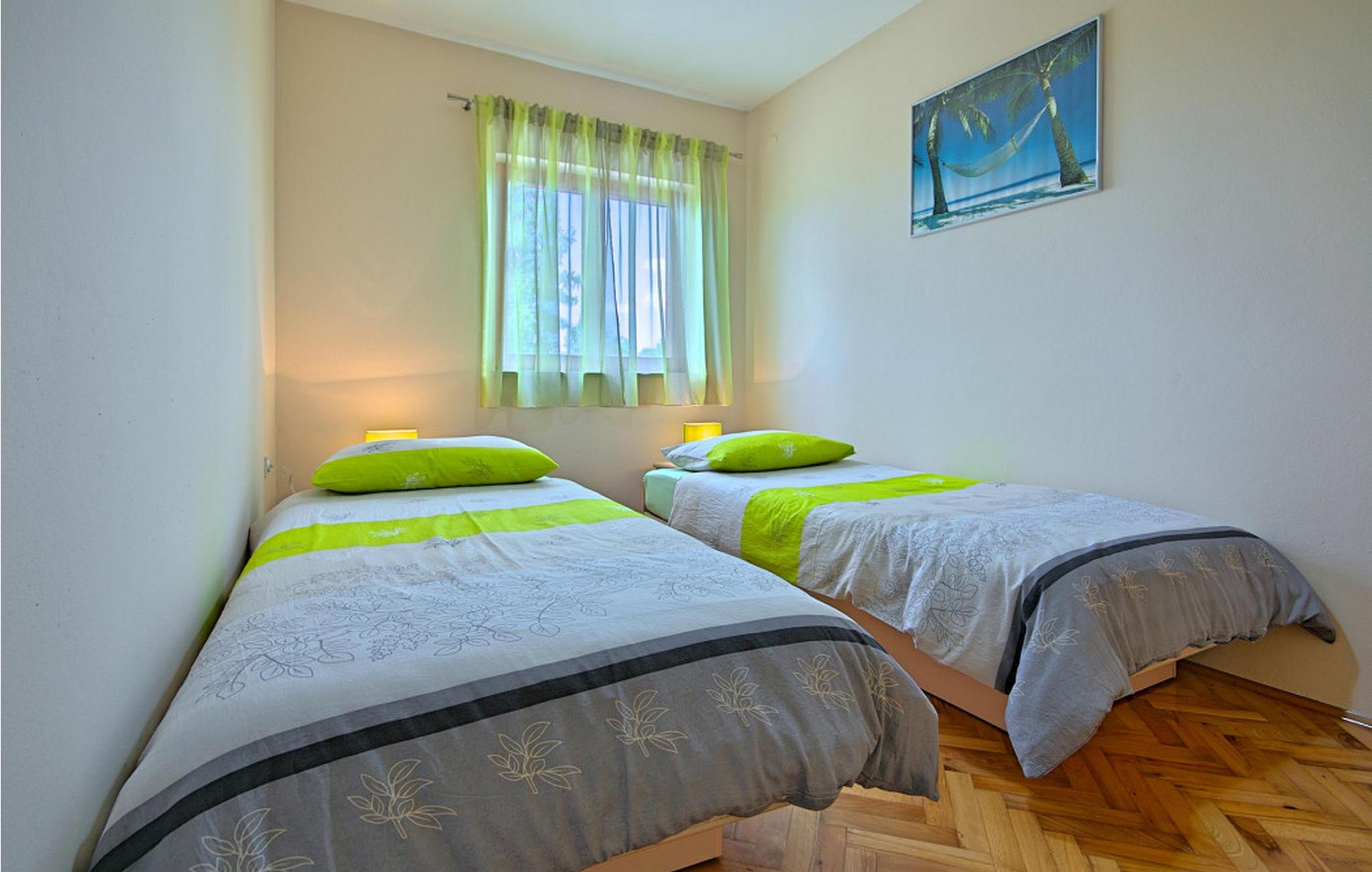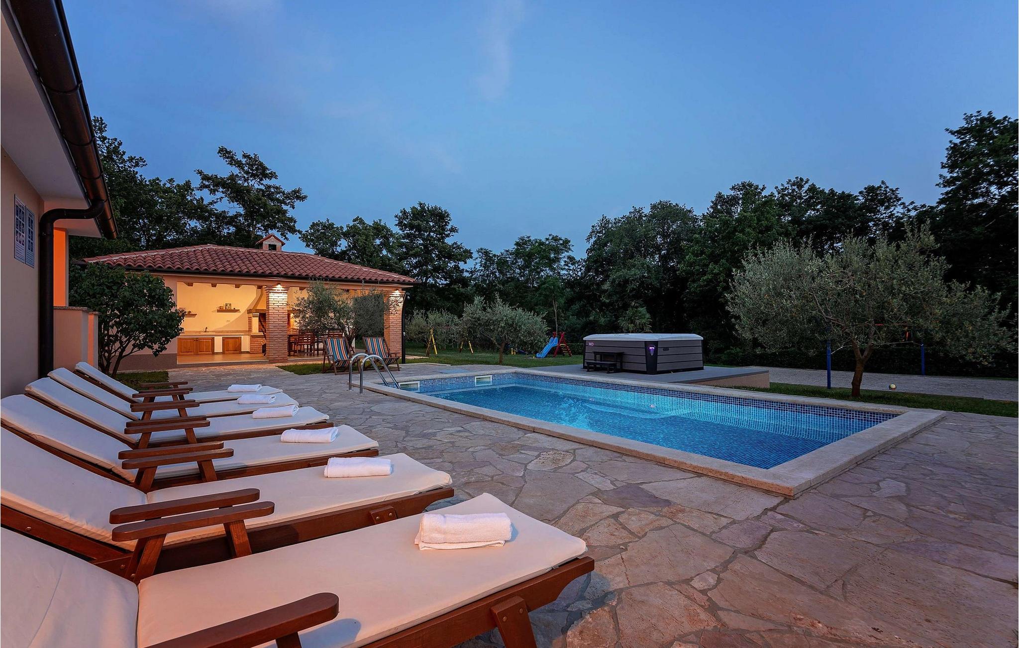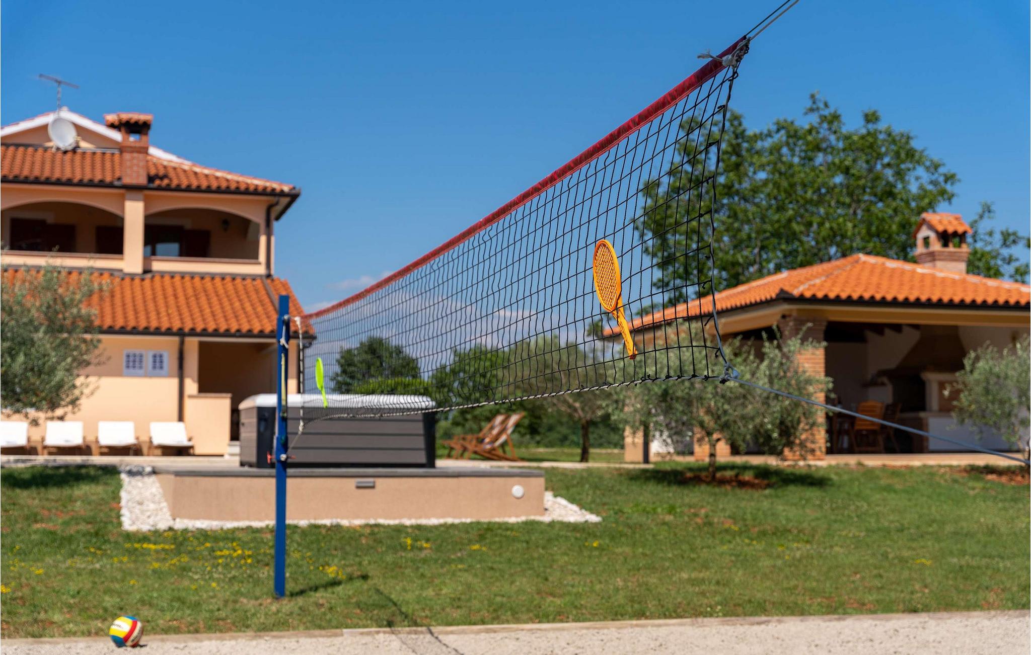 Denne charmerende villa er beliggende i det maleriske sted Vranici, kun 15 km fra turistcentret i Porec og kun 5 km fra den fantastiske by Motovun. Markeder, restauranter, apoteker og andre faciliteter er placeret i disse byer og er let tilgængelige. Den smukke Villa Vranici består af to pænt indrettede soveværelser med dobbeltsenge, samt to mindre soveværelser med separate enkeltsenge, der kan sættes sammen, hvis det er nødvendigt. Den byder på optimal soveplads til 8 personer, men kan også rumme yderligere 2 gæster på den komfortable fold-ud sofa i en af de charmerende stuer. På de 150 m² store boligarealer i den fuldt klimatiserede Villa Vranici har gæsterne i alt to veludstyrede køkkener, to badeværelser og to charmerende stuer samt en 25 m² stor balkon og en 4000 m² have til deres rådighed. Den smukke pool er opvarmet, og der er også en udendørs jacuzzi til ekstra afslapning. Derudover inkluderer underholdningstilbuddet på Villa Vranici en legeplads med sand, en kælkebakke, gynger samt en trampolin og en træhytte. Til fritidsformål er en badmintonbane med udstyr og 6 cykler til rådighed gratis. Kæledyr er tilladt på denne ejendom efter ejerens skøn eller mod et gebyr. Bemærk venligst, at denne ejendom ikke accepterer ungdomsgrupper eller polterabends. En ungdomsgruppe i denne ejendom består af personer under 30 år. Book ikke denne ejendom, hvis du er en ungdomsgruppe eller polterabend, da din reservation vil blive afvist efter reservationen, hvilket også kan være tilfældet ved ankomst til overnatningsstedet eller under dit ophold, og du vil ikke modtage en refusion.