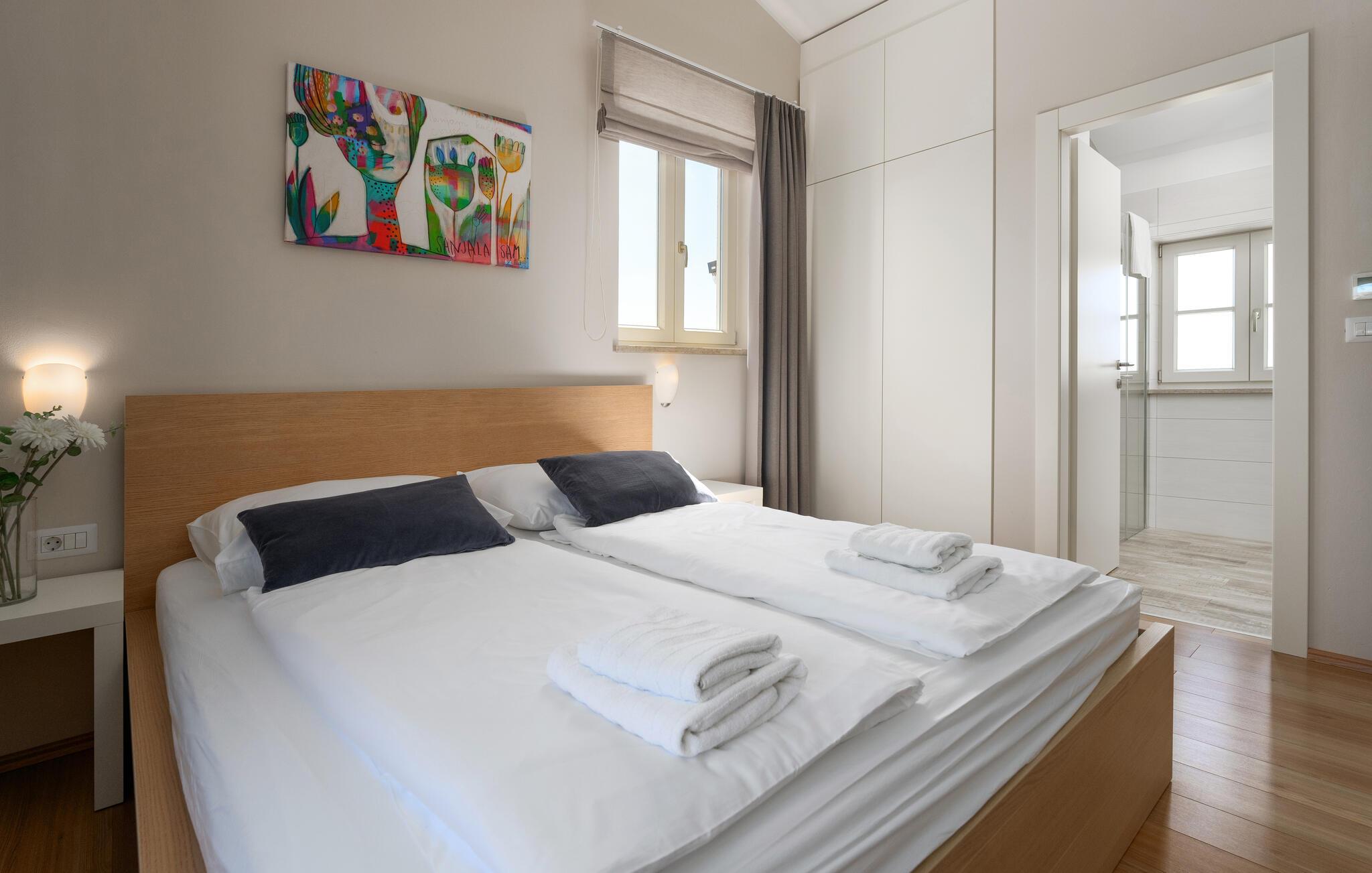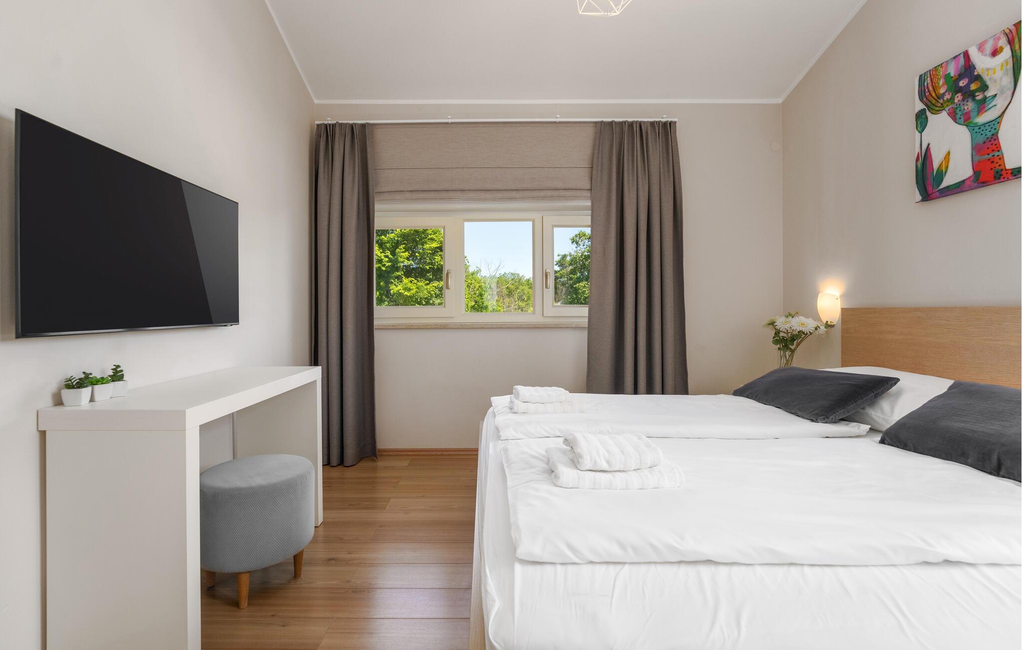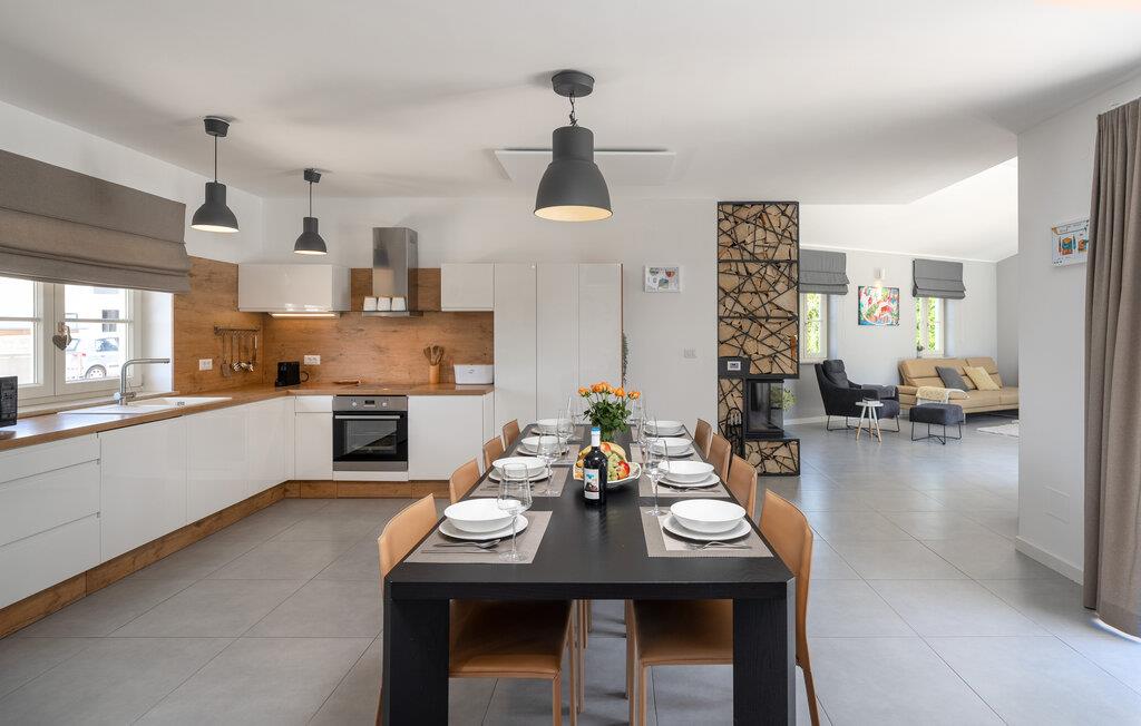 Hvert hjørne af denne familievilla er designet til afslapning, nydelse og ubekymrede øjeblikke. Villaen giver jer absolut privatliv, en betagende udsigt over det istriske landskab og alt hvad I behøver for et uforglemmeligt ophold: rummelige, lyse værelser, et moderne, fuldt udstyret køkken, en privat saltvandspool (opvarmet efter anmodning, undtagen fra 15. juli til 15. august), en solterrasse og en udendørs grill til aftener under åben himmel. Den er ideel til en romantisk ferie for to, såvel som til en ferie med familie eller venner. Familier med børn er særligt velkomne – et hyggeligt børnehjørne med legetøj venter på jer indenfor, mens der udenfor, på den store, indhegnede grund, venter en legeplads, en trampolin og et bordtennisbord. jeres firbenede venner er også velkomne – vi accepterer hunde, som vil føle sig hjemme i den store, sikre have.